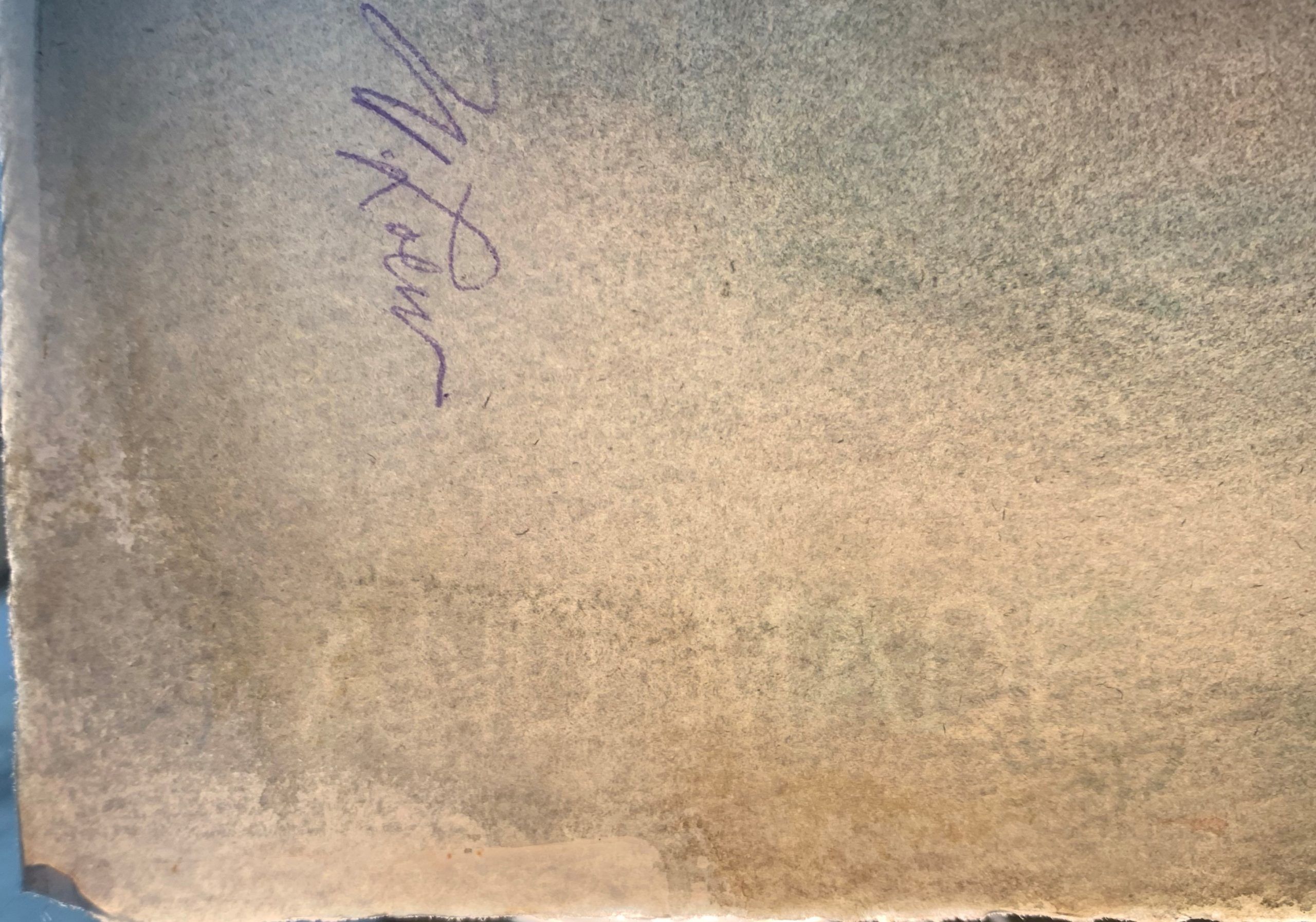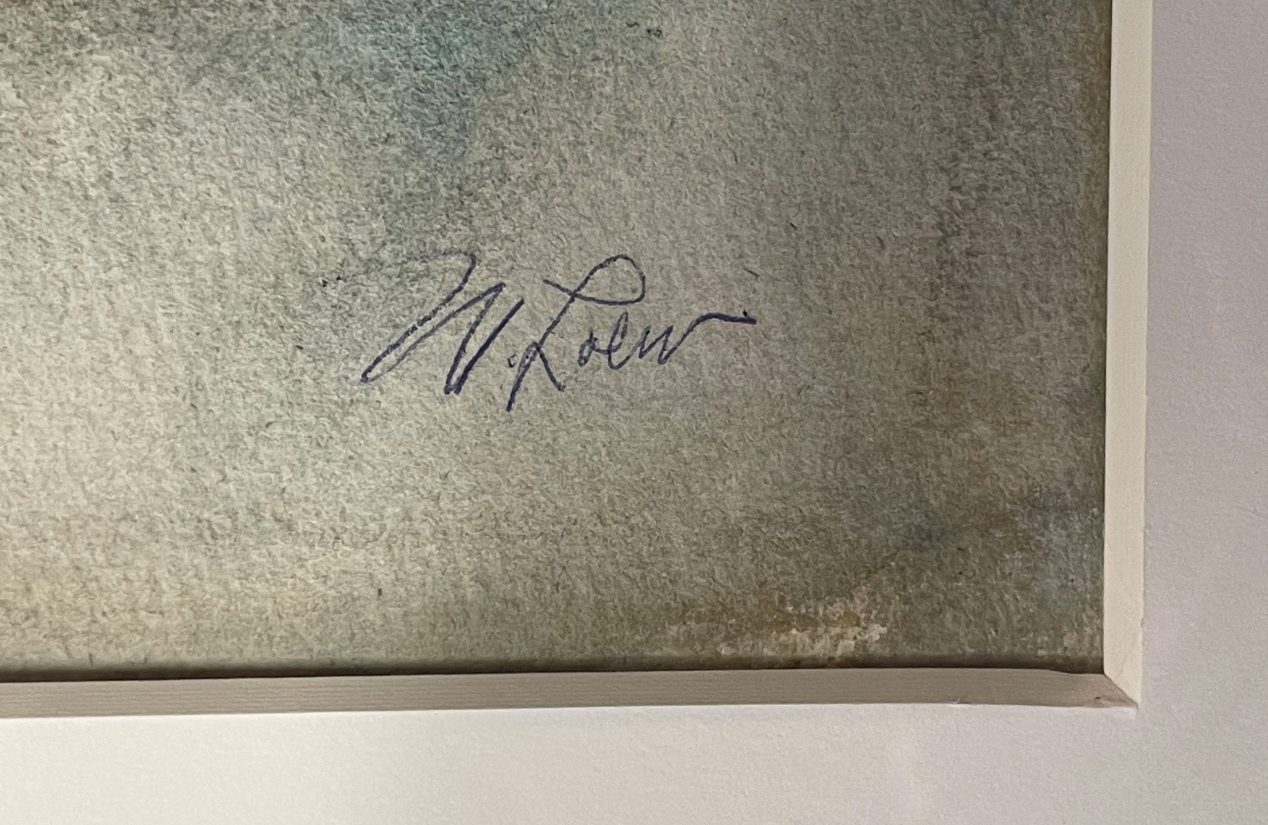 This watercolor was painted on hand-made J Whatman paper. J Whatman is widely considered to be the best handmade paper ever made. J Whatman ceased making handmade paper in the mid-1950s. The paper on which Loew painted this picture on paper which probably came from coveted stocks remaining of Whatman’s paper and suggests that our estimated date of ca. 1970 may in fact be later than actual date.