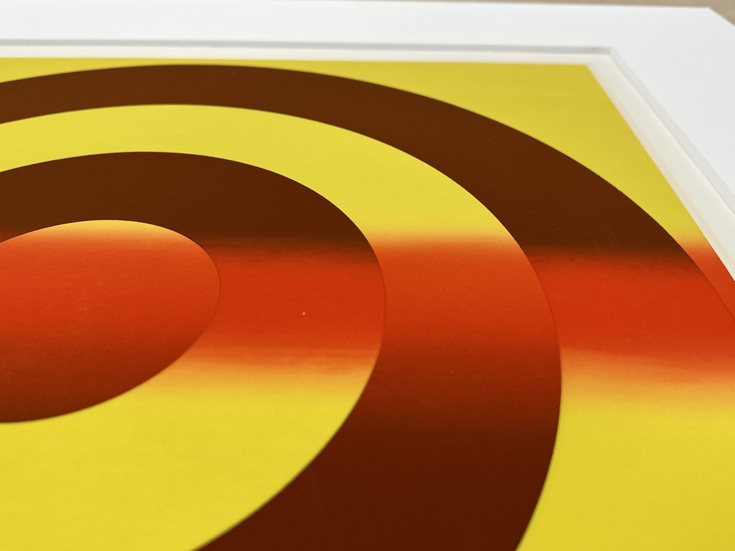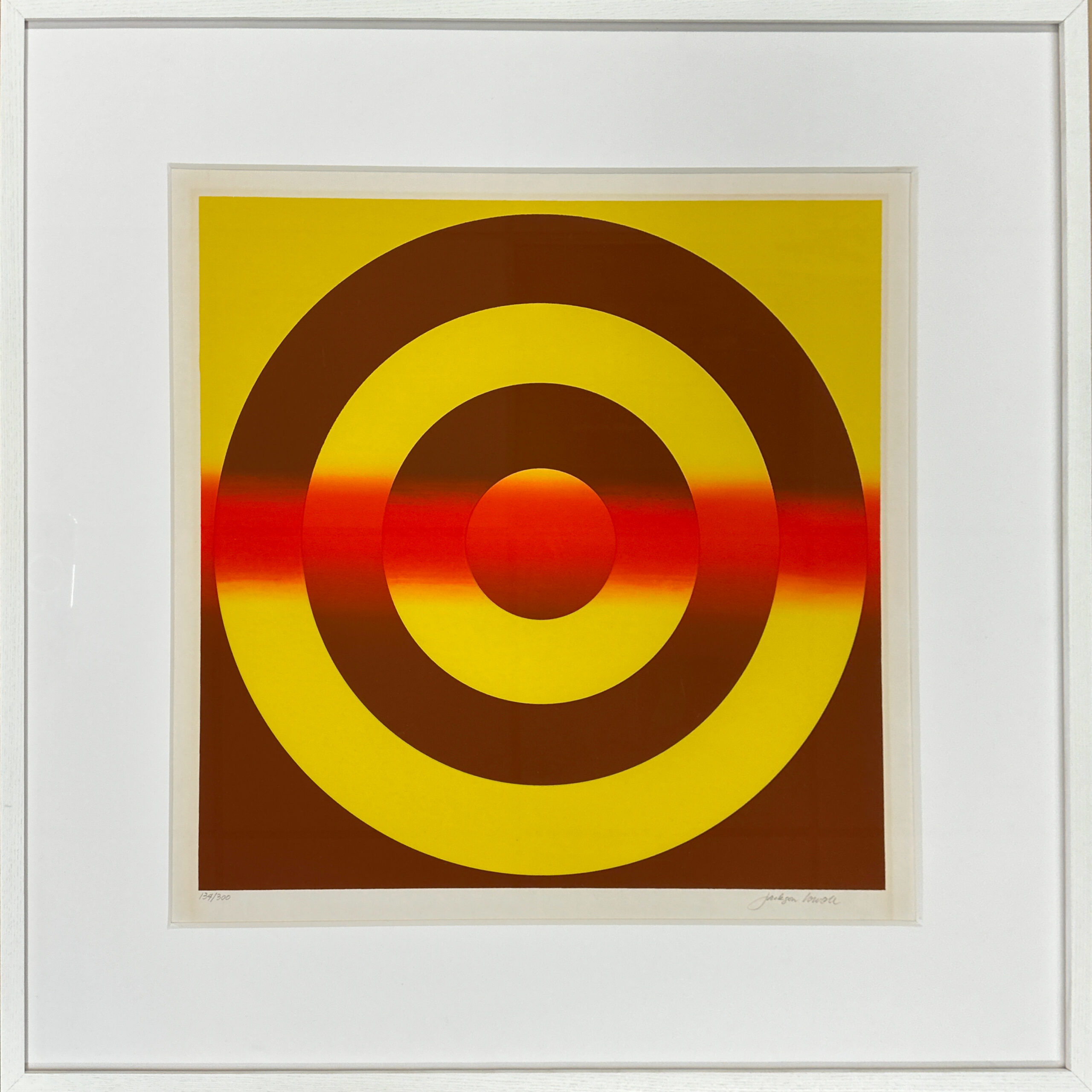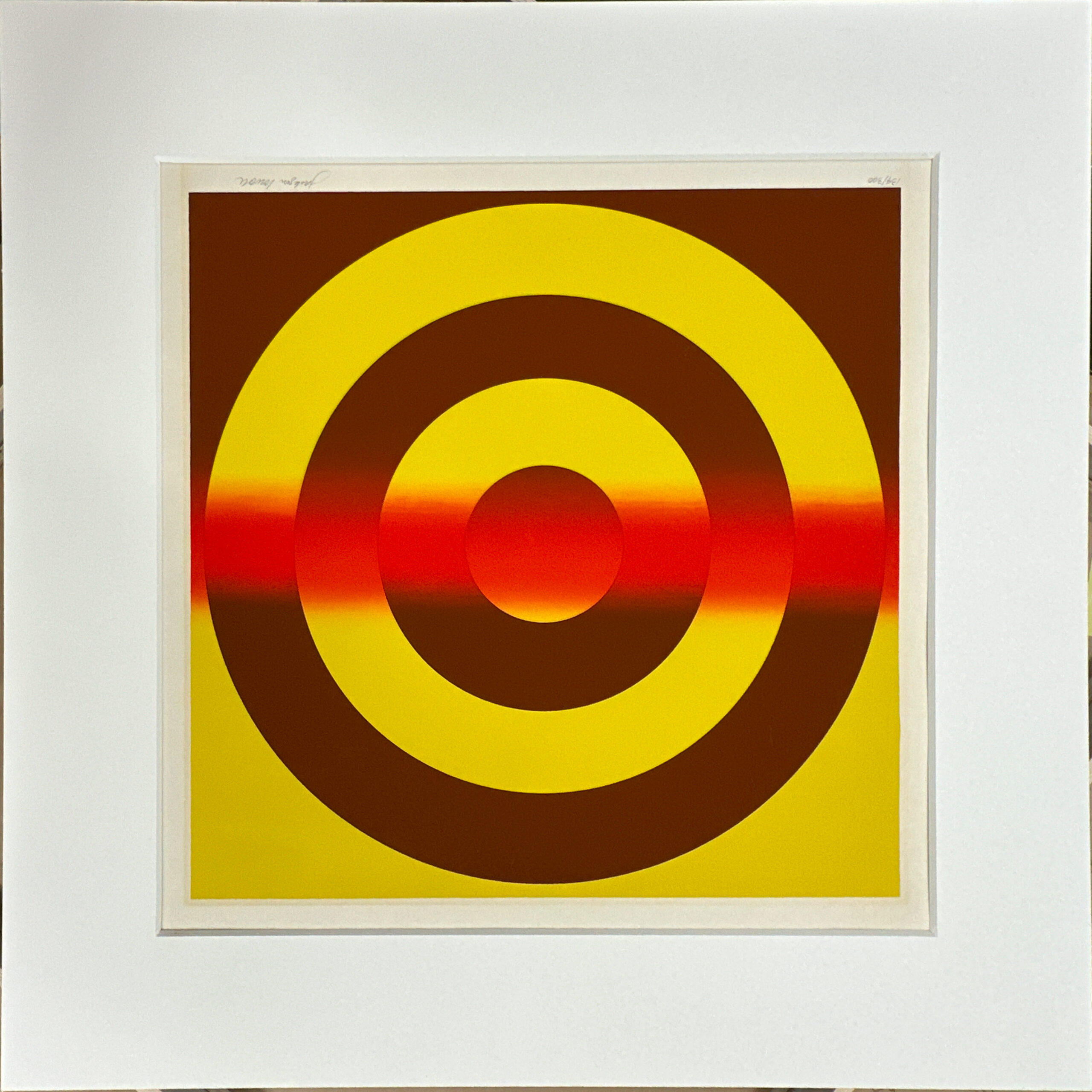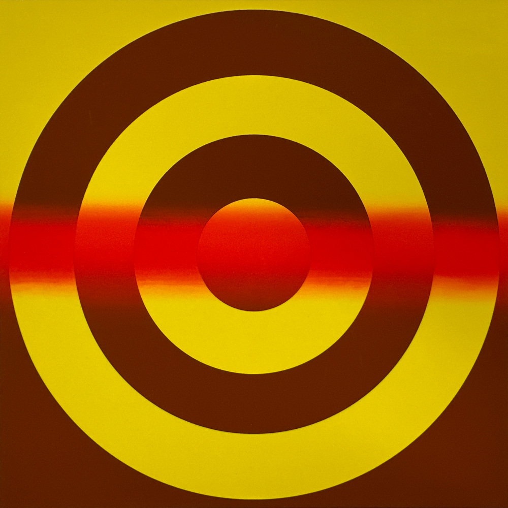 Jackson Lowell’s concentric circles in yellow and maroon, bisected by a red bar in gradient.