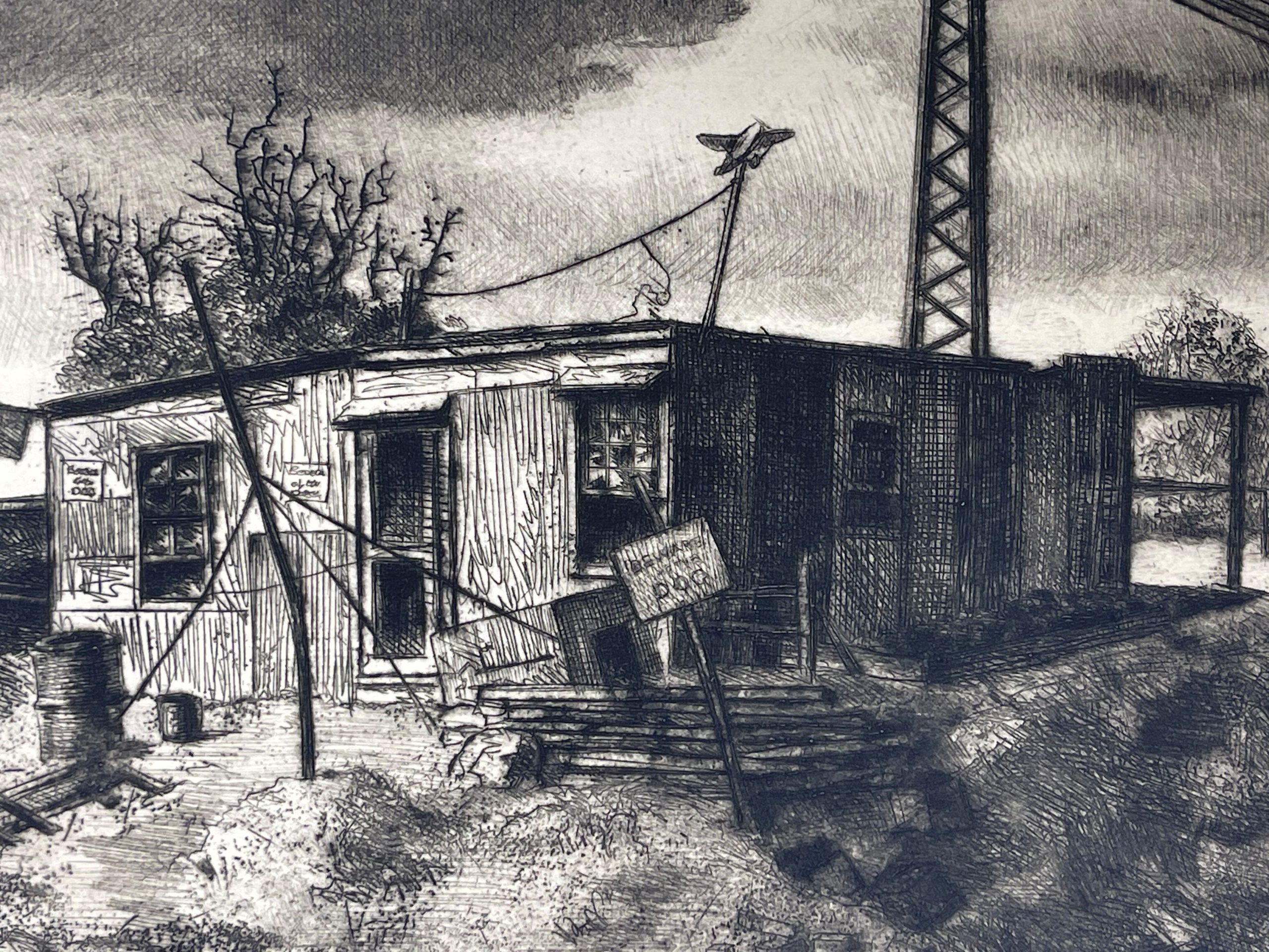 Samuel Margolies was an extraordinary story-teller and an extraordinary artist. While he is best known for his pictures of men balancing on girders while building skyscrapers, his true artistry is found in his commentaries on the world around him–as in this work, Beware of the Dog”, depicting a derelict structure, in the shadow of a hire pole filled with electrical wires. The sign, “Beware of the Dog”, being the clearest detail of the work.