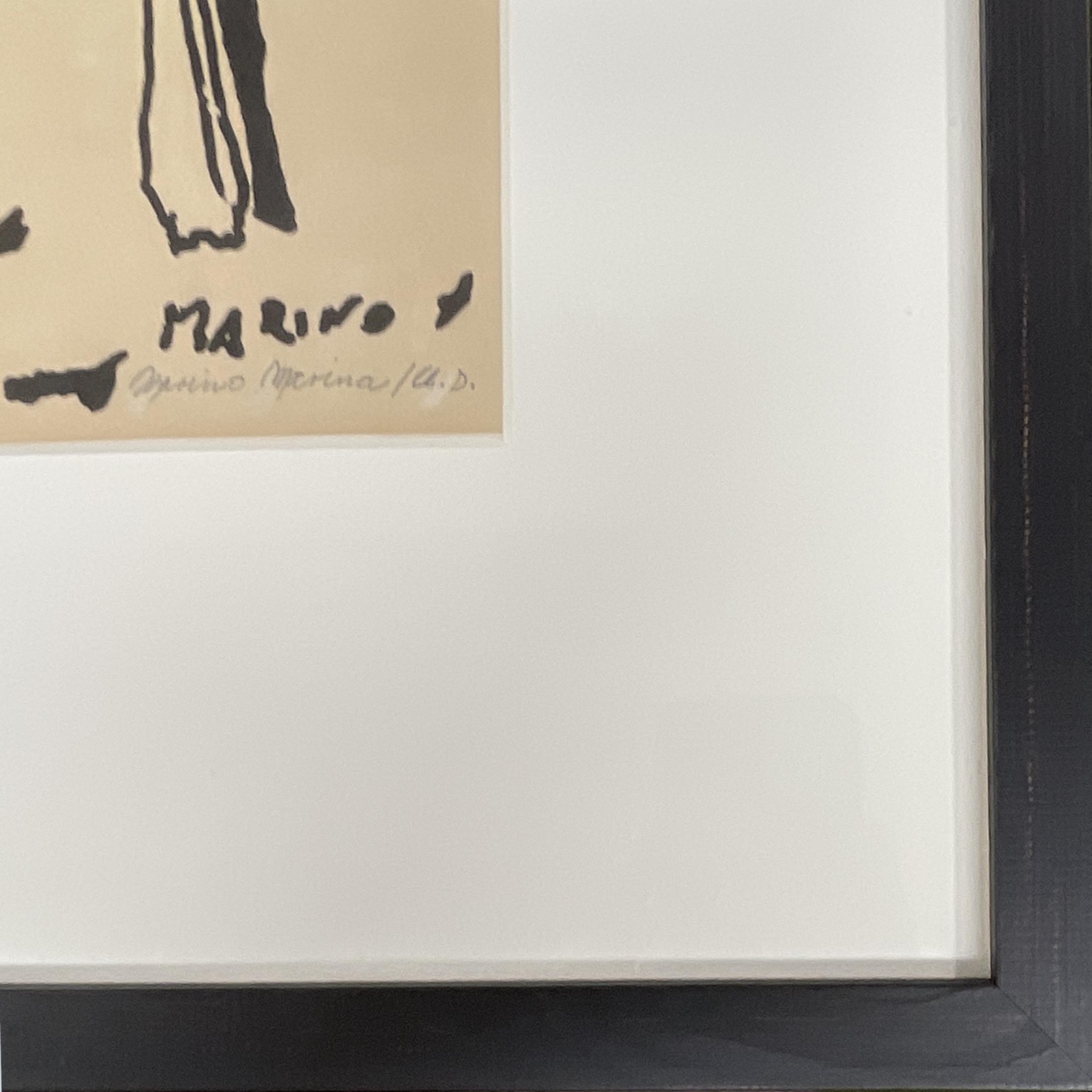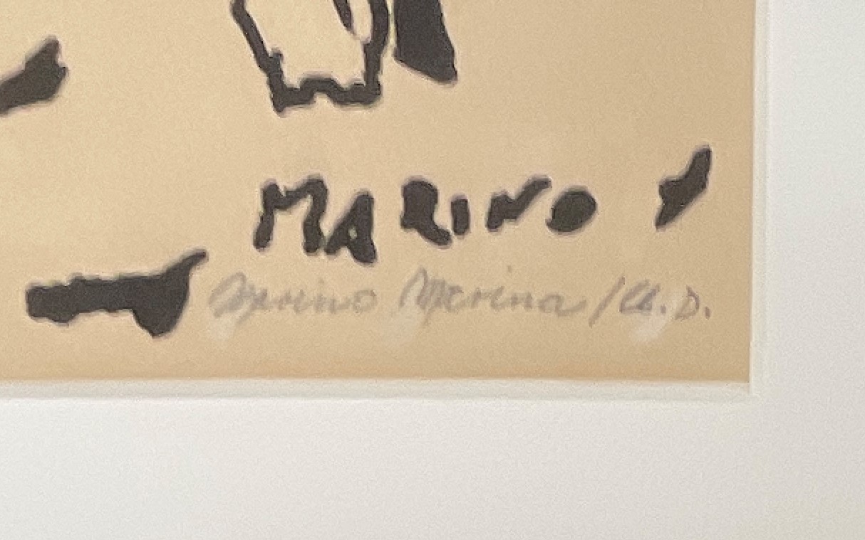 Signed by the artist in the plate, en recto lower right. Editioned, in pencil, en recto lower left. Artist’s name written under the plate signature but does not appear to be Marino’s signature and does not appear to be an attempt to forge Marino’s signature.