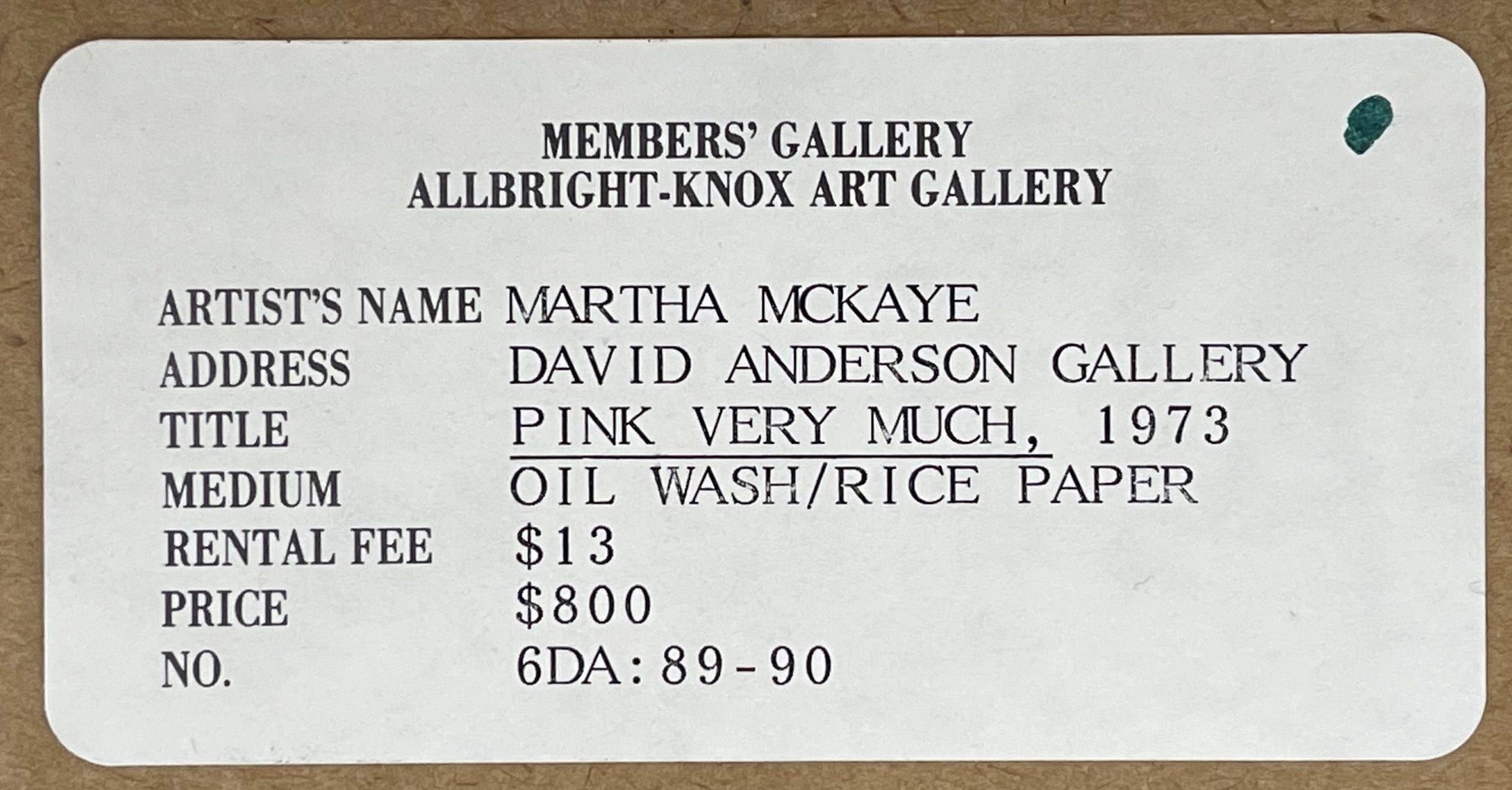 This work was exhibited at the Martha Jackson Gallery, New York City, and the Anderson Gallery, Buffalo