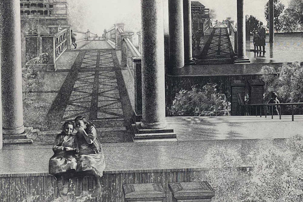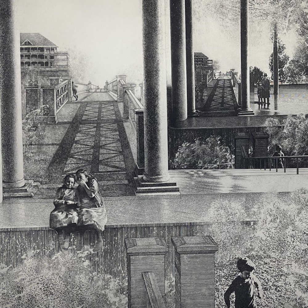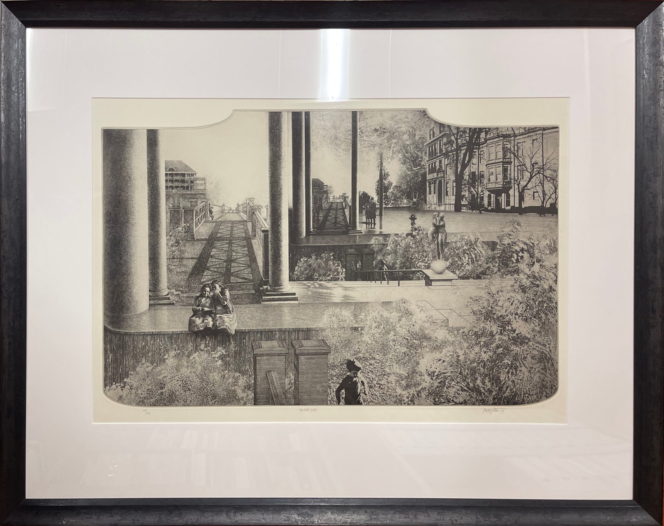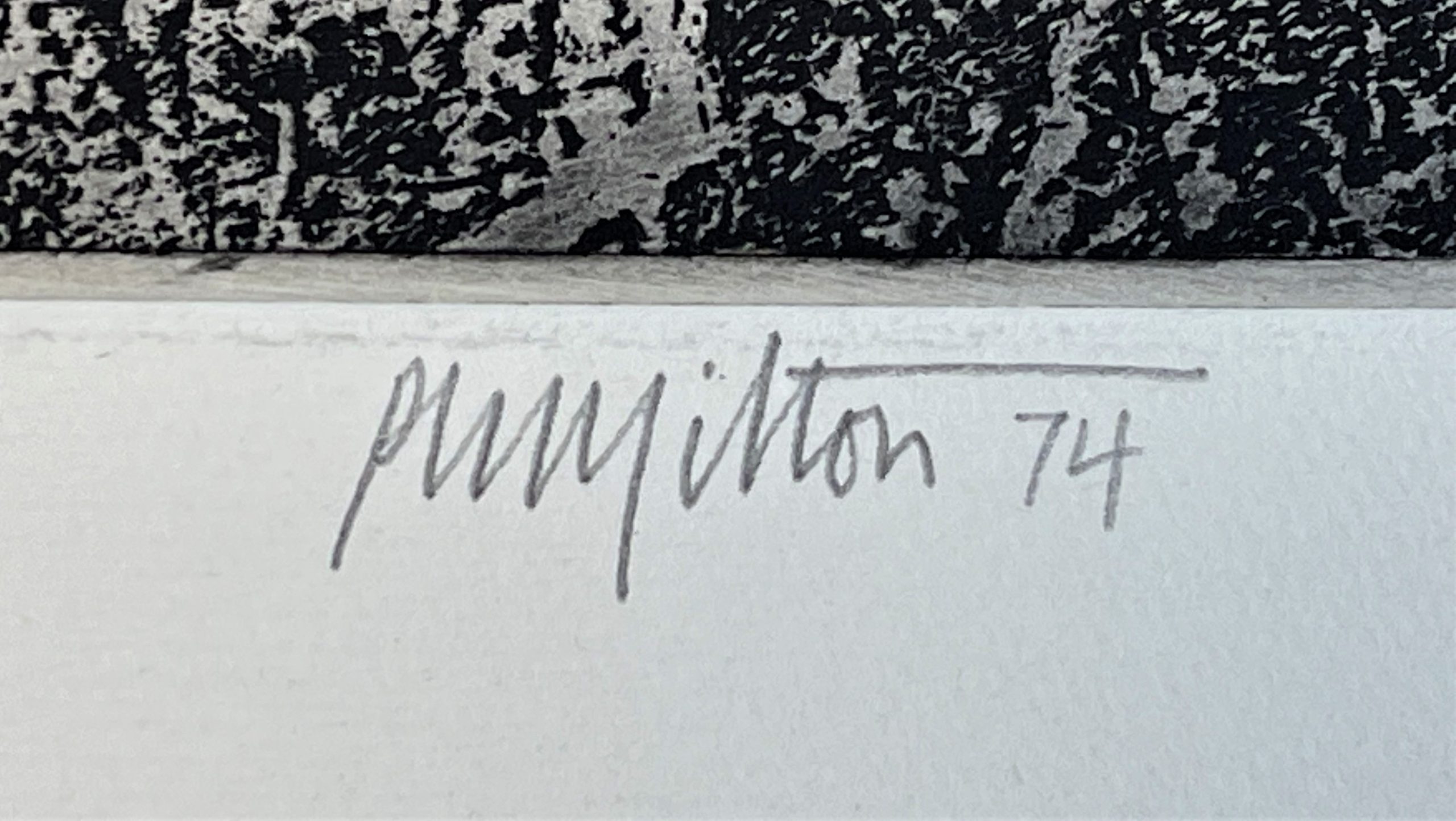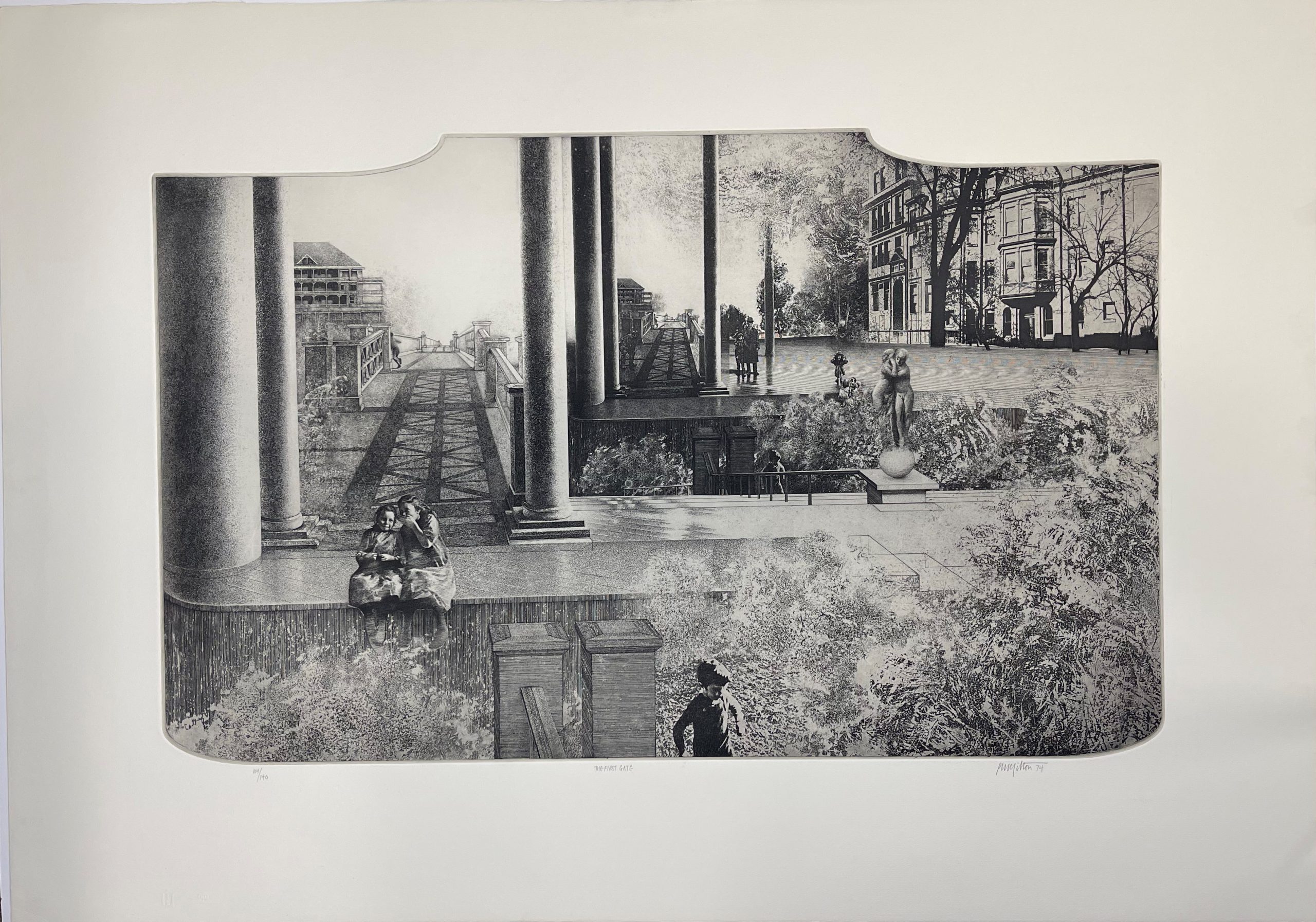 Peter Milton has been described as “the most proficient etcher in the United States”, and this work was completed in 1974 when the artist had reached his greatest maturity. His technical proficiency in etching and engraving is obvious from his ability to create shaded, lifelike images and a sense of mystery in a medium which is certainly conducive to those traits but takes perhaps more readily to a wooden and flat image of the sort never found in Milton’s work.