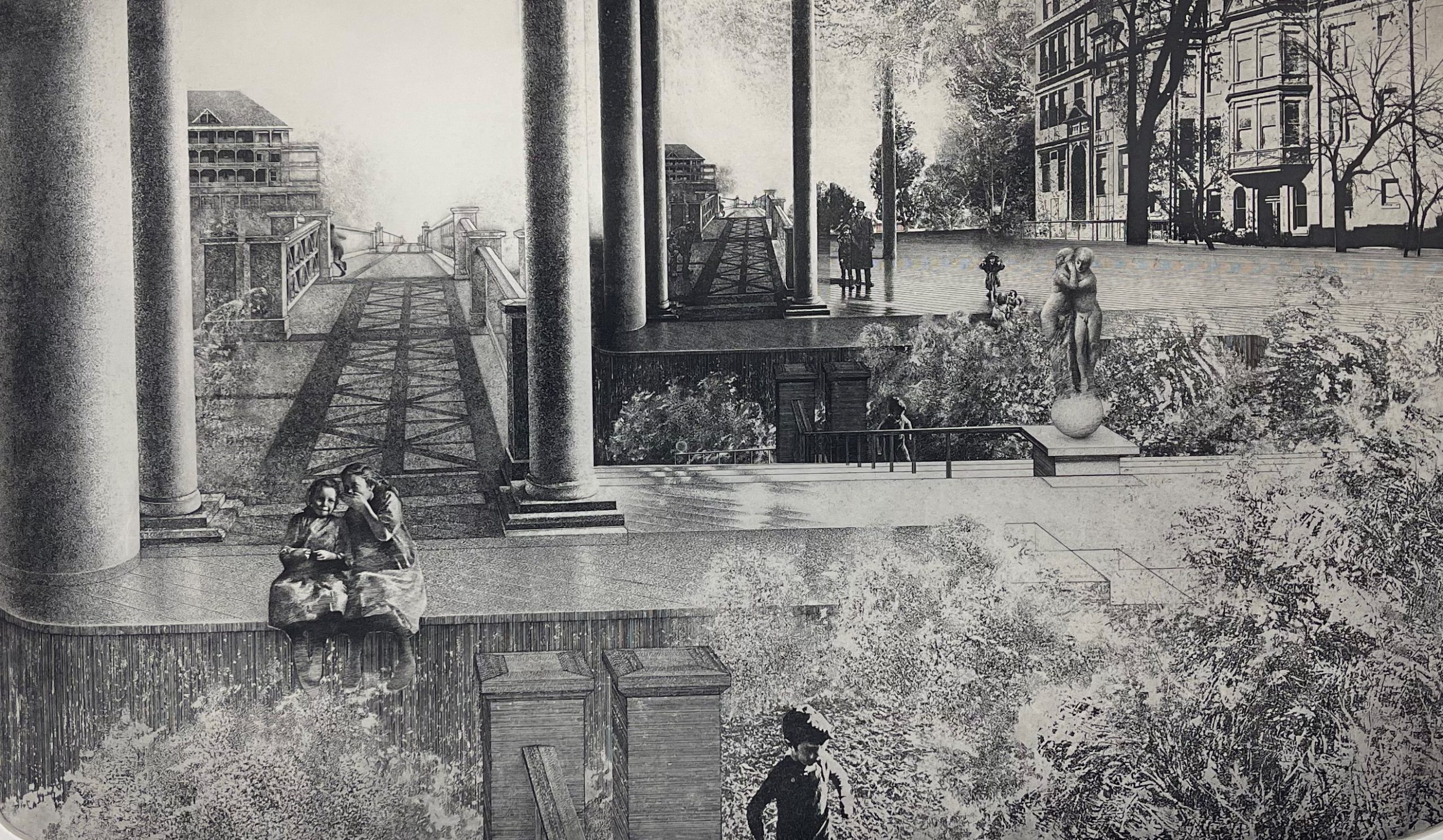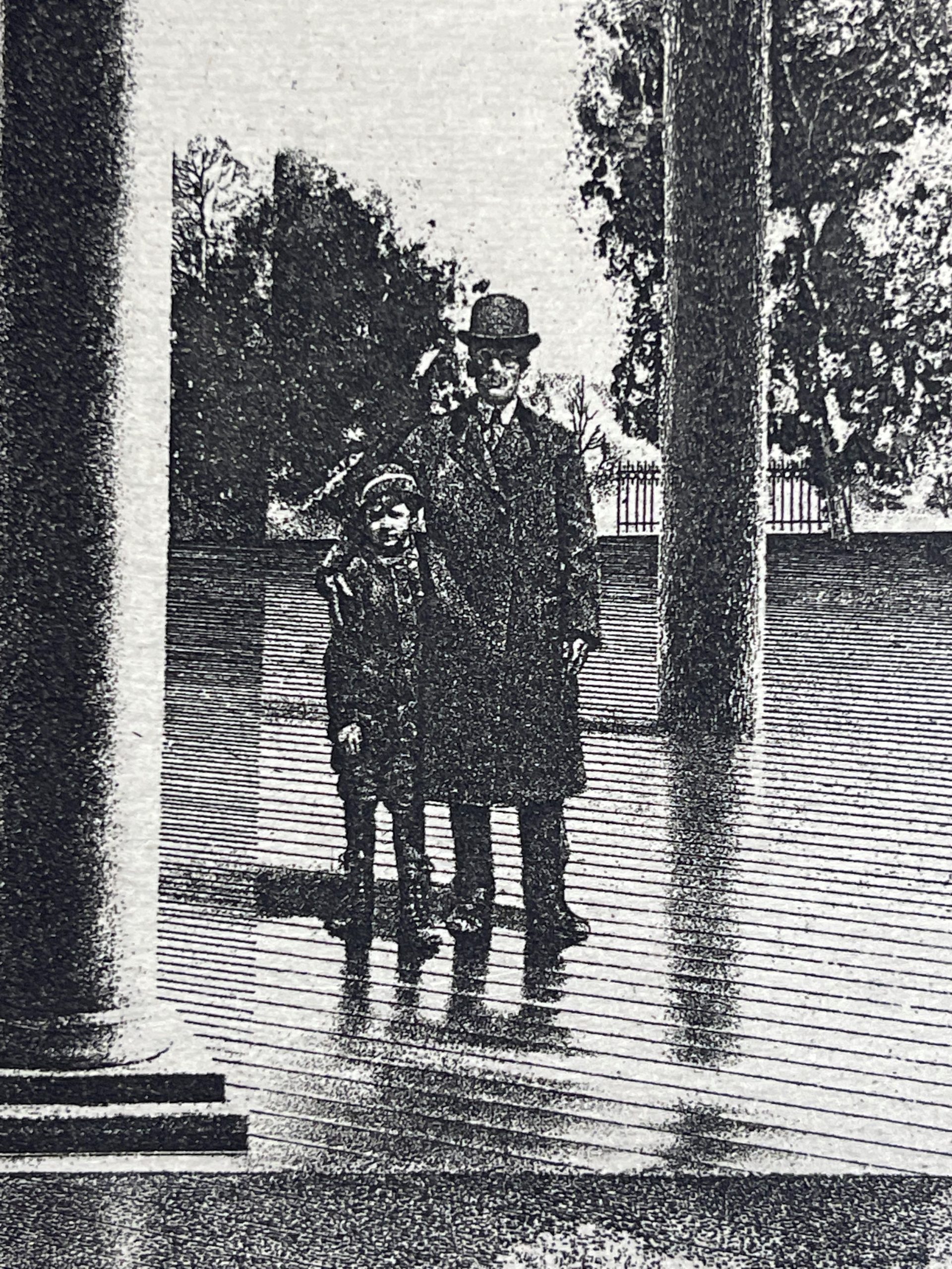 That magic is present, both metaphorically in, and in the literal subject matter of, this work. Of great moment in this picture is the ghostly image in the left third of the work, which comes from an altered transfer of Milton’s 1970 work, “Mornings with Judd (Second State)”. The central figures in that work are Milton’s grandfather with one of his sons, who died shortly after the picture was taken. In fact, all three of his sons died, leaving only Milton’s mother. The “Judd” of the title of that work derives from his brother, who never married and was a playful presence in the family (as is suggested in the picture by his leaning forward with hands on knees). At the center of First Gate is the grandfather himself, depicted as a stern upright figure, holding his son to him as if to keep him from running off, perhaps to the playful figure of the uncle in the distance. Milton sees First Gate “as the first mysterious rustlings of adolescence entering the ‘Kinderscenen’ of Mornings with Judd.”