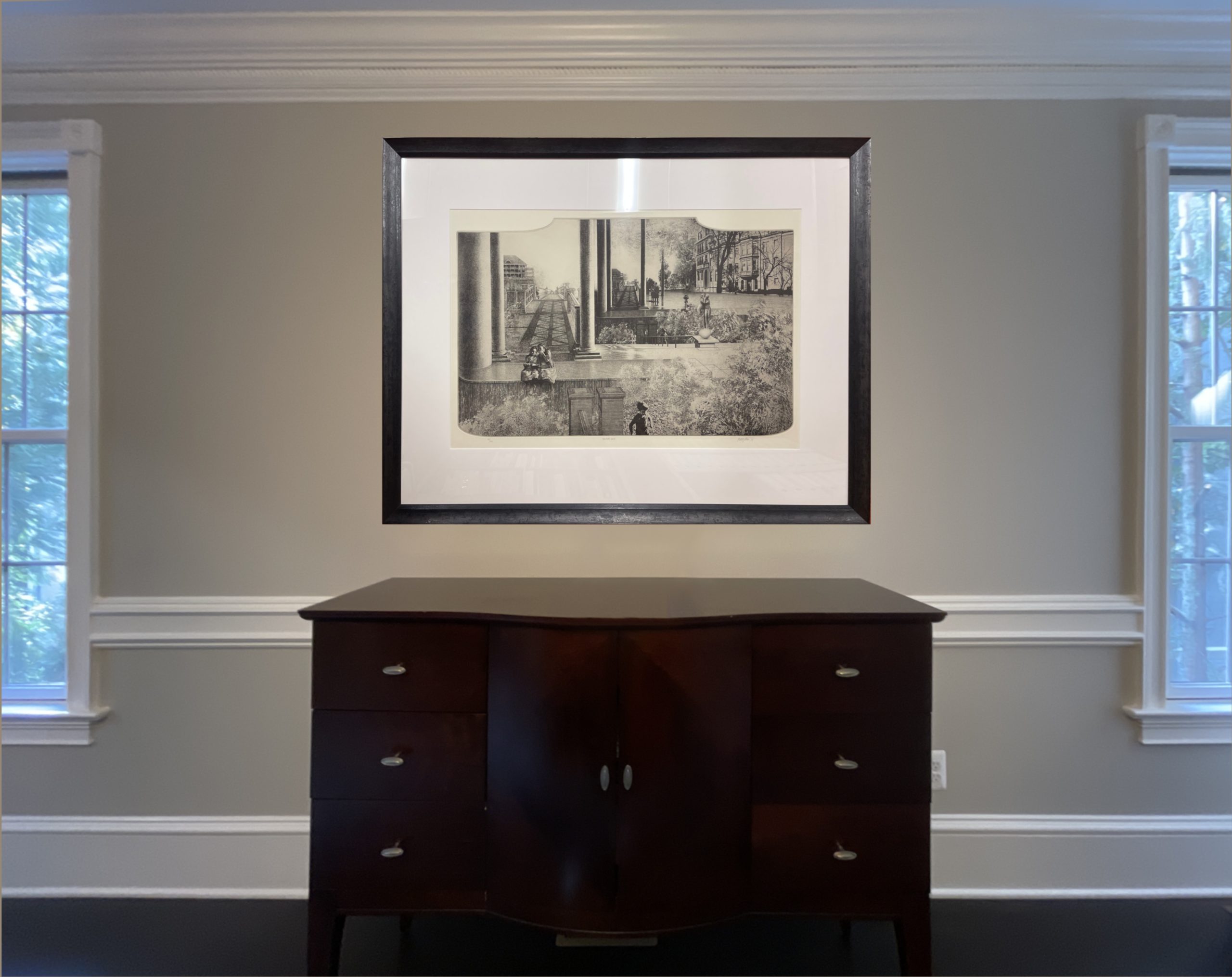 Professionally framed and matted behind 99% UV-filtering art glass with strictly conservation-grade materials.