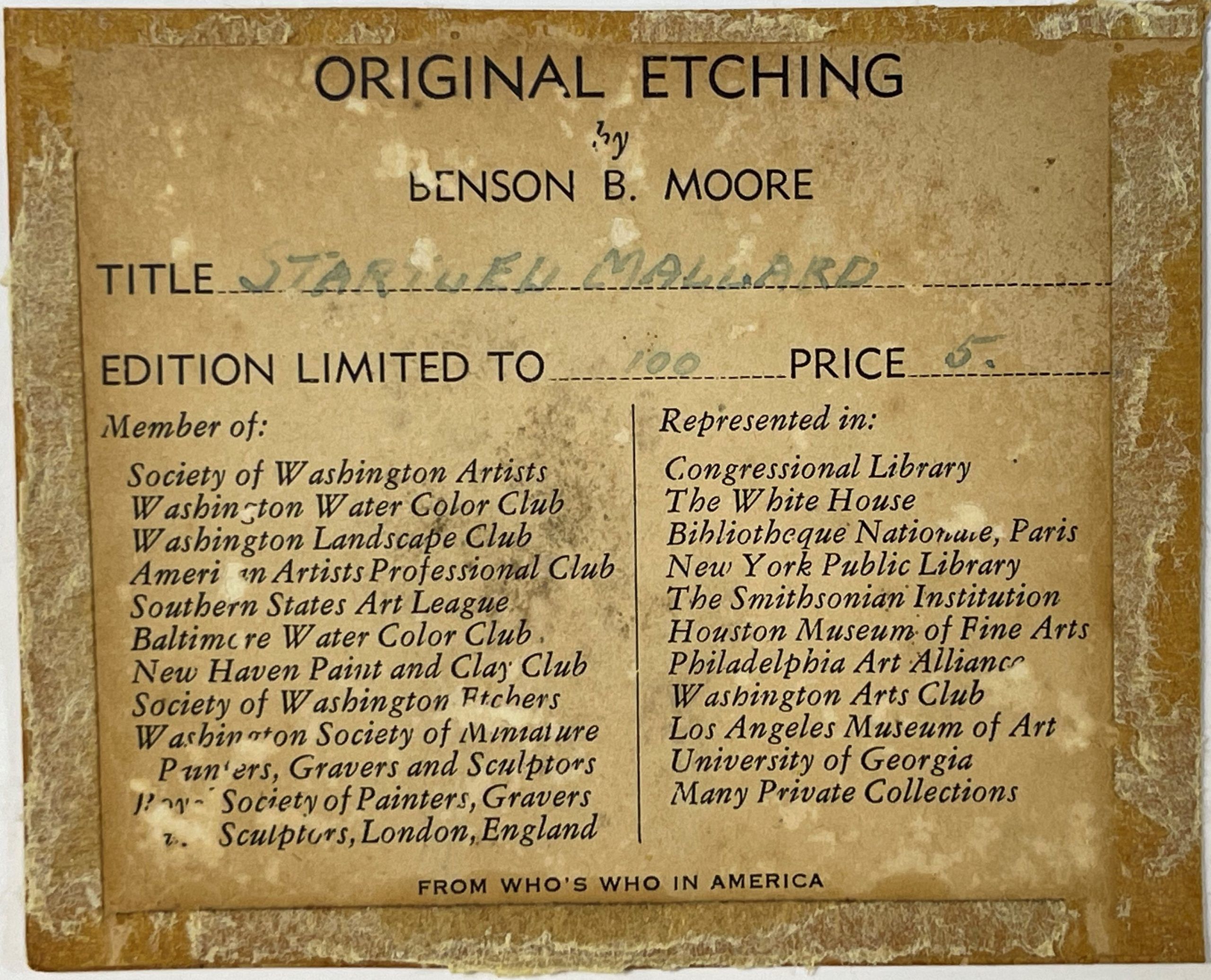 Washingtonian artist Benson Bond Moore was a celebrated creator of wildlife images. An example of this work is held in the permanent collection of the Smithsonian Institution.