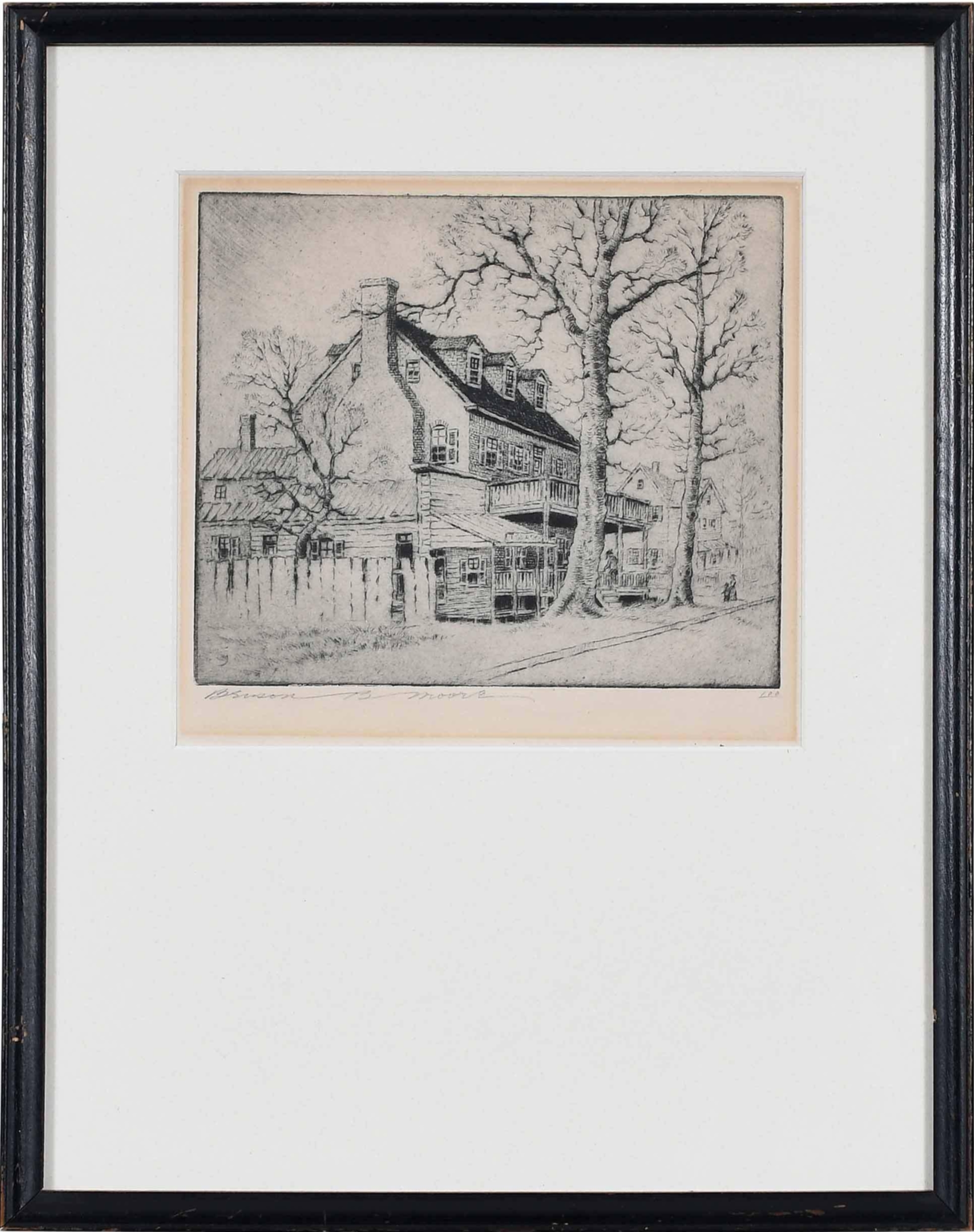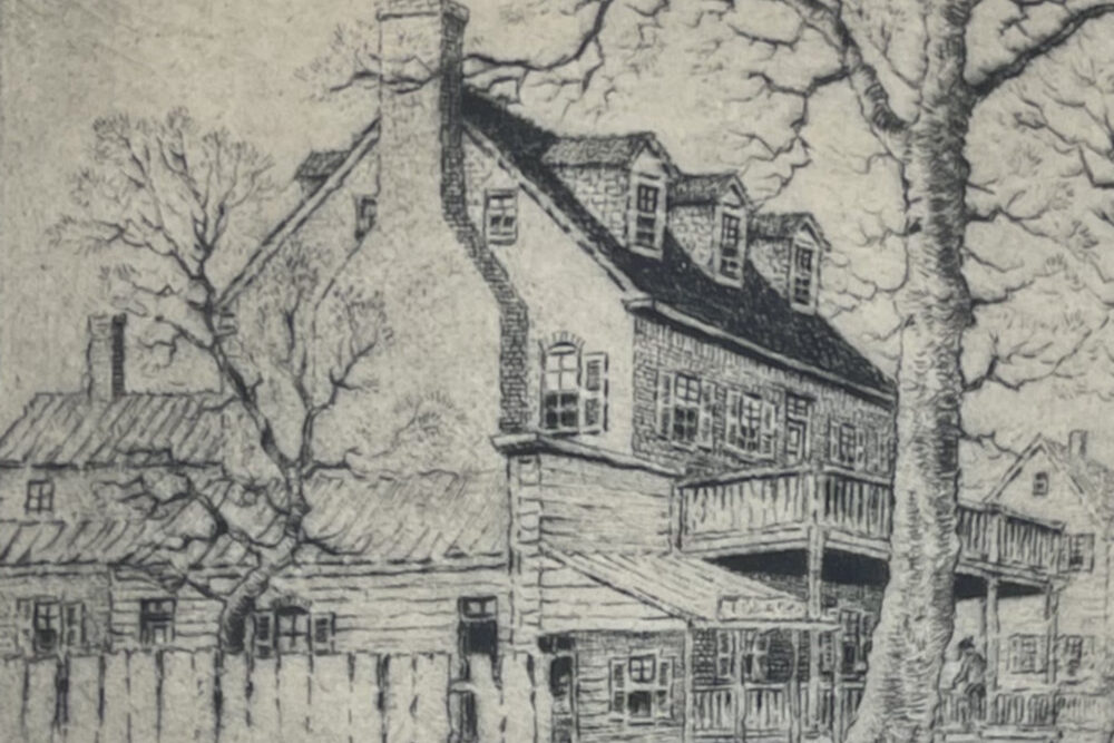 At the end of his second term in office, Washington traveled home from Philadelphia. On March 26, 1797, he wrote a letter to one of his friends in Philadelphia, the socialite Elizabeth Willing Powel, inviting her to visit him at Mount Vernon. He shares with her a survey of the places of room and board along the way. As to one popular hotel, Washington says, “the lodging is bad; the eating tolerable” but, he says, “at Bladensburgh nine miles beyond a good house is kept by one Ross (sign of the Indian Queen).” Does this mean that George Washington slept at the Indian Queen Tavern (which was then owned by Richard Ross)? Perhaps. In any case, the building was well-known as “The George Washington House” in the 1920s when Benson Bond Moore created this etching, and legend true or not the building (which was listed on the National Register of Historic Places in 1974) remains an important part of American history.
