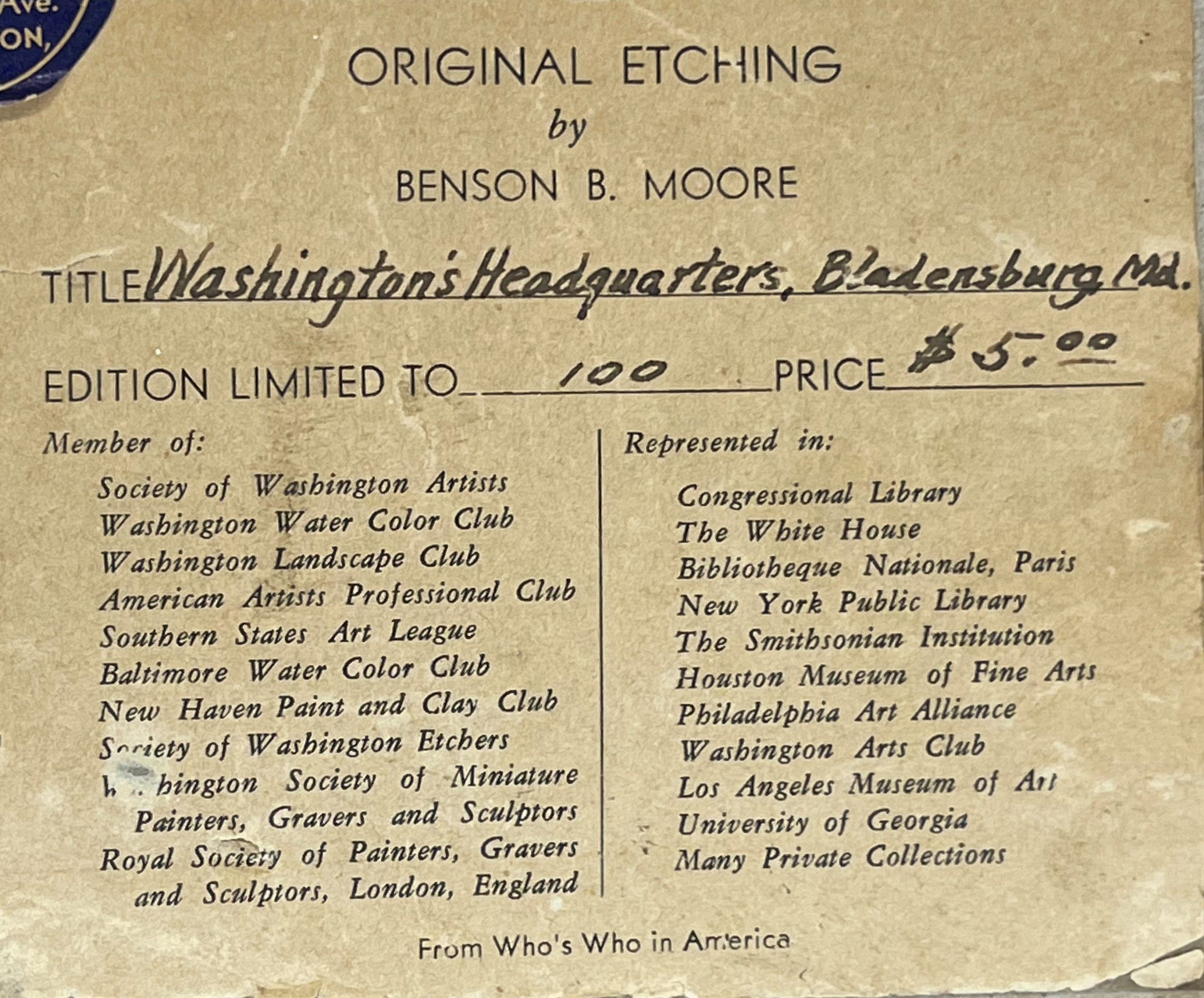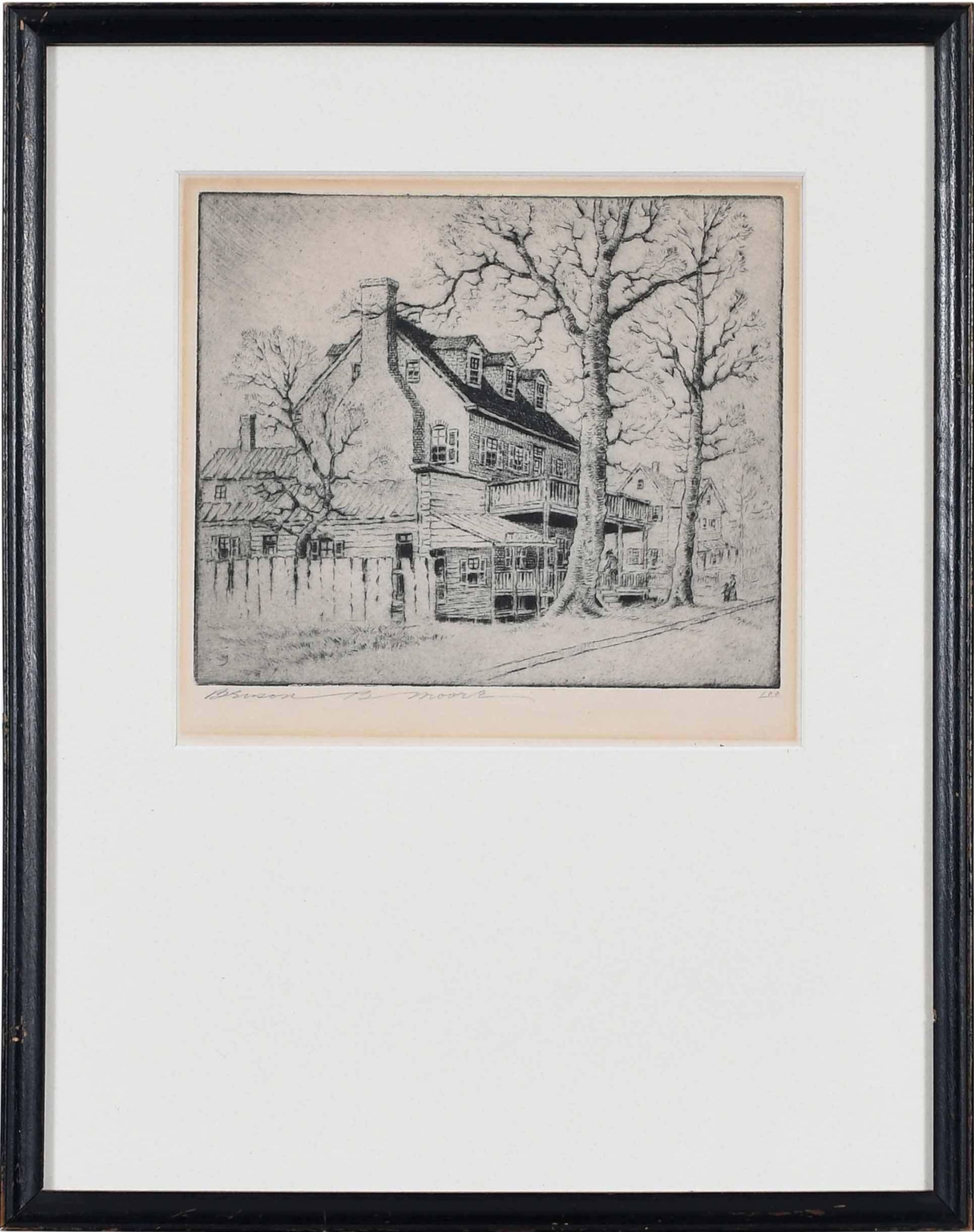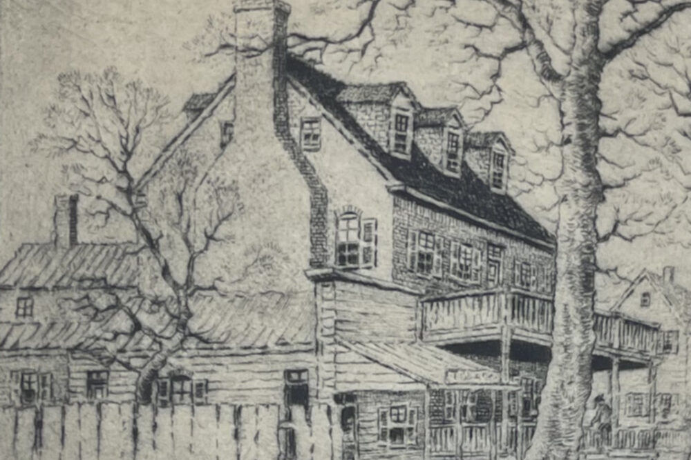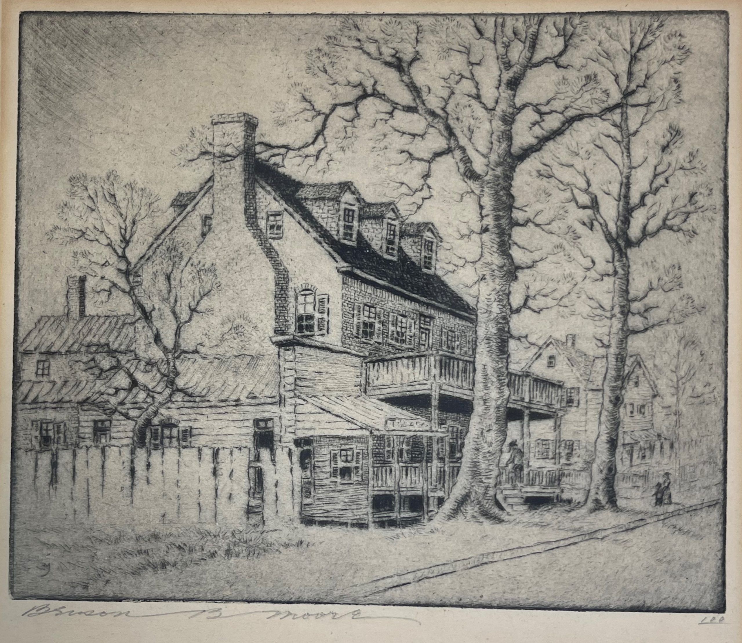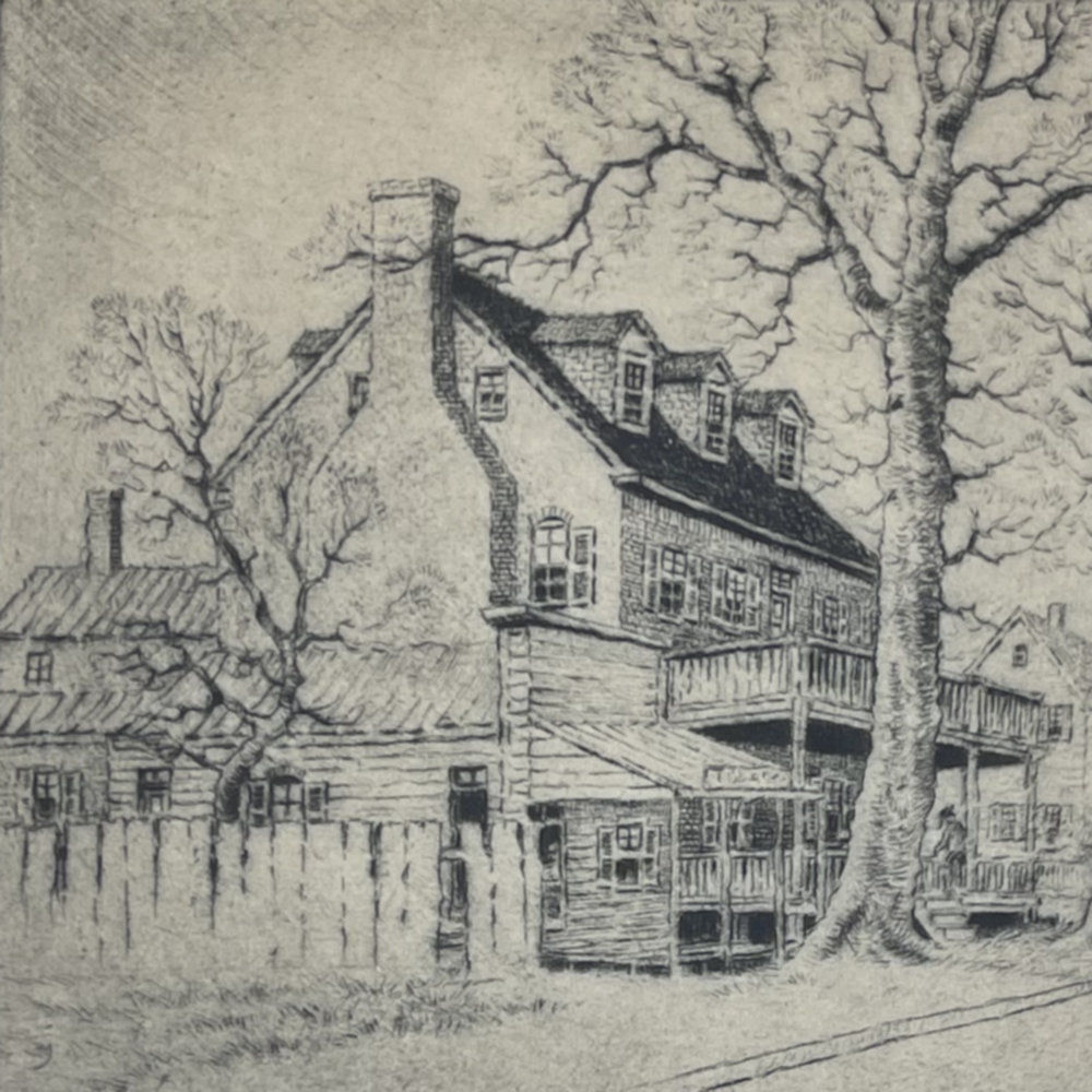 At the end of his second term in office, Washington traveled home from Philadelphia. On March 26, 1797, he wrote a letter to one of his friends in Philadelphia, the socialite Elizabeth Willing Powel, inviting her to visit him at Mount Vernon. He shares with her a survey of the places of room and board along the way. As to one popular hotel, Washington says, “the lodging is bad; the eating tolerable” but, he says, “at Bladensburgh nine miles beyond a good house is kept by one Ross (sign of the Indian Queen).” Does this mean that George Washington slept at the Indian Queen Tavern (which was then owned by Richard Ross)? Perhaps. In any case, the building was well-known as “The George Washington House” in the 1920s when Benson Bond Moore created this etching, and legend true or not the building (which was listed on the National Register of Historic Places in 1974) remains an important part of American history.