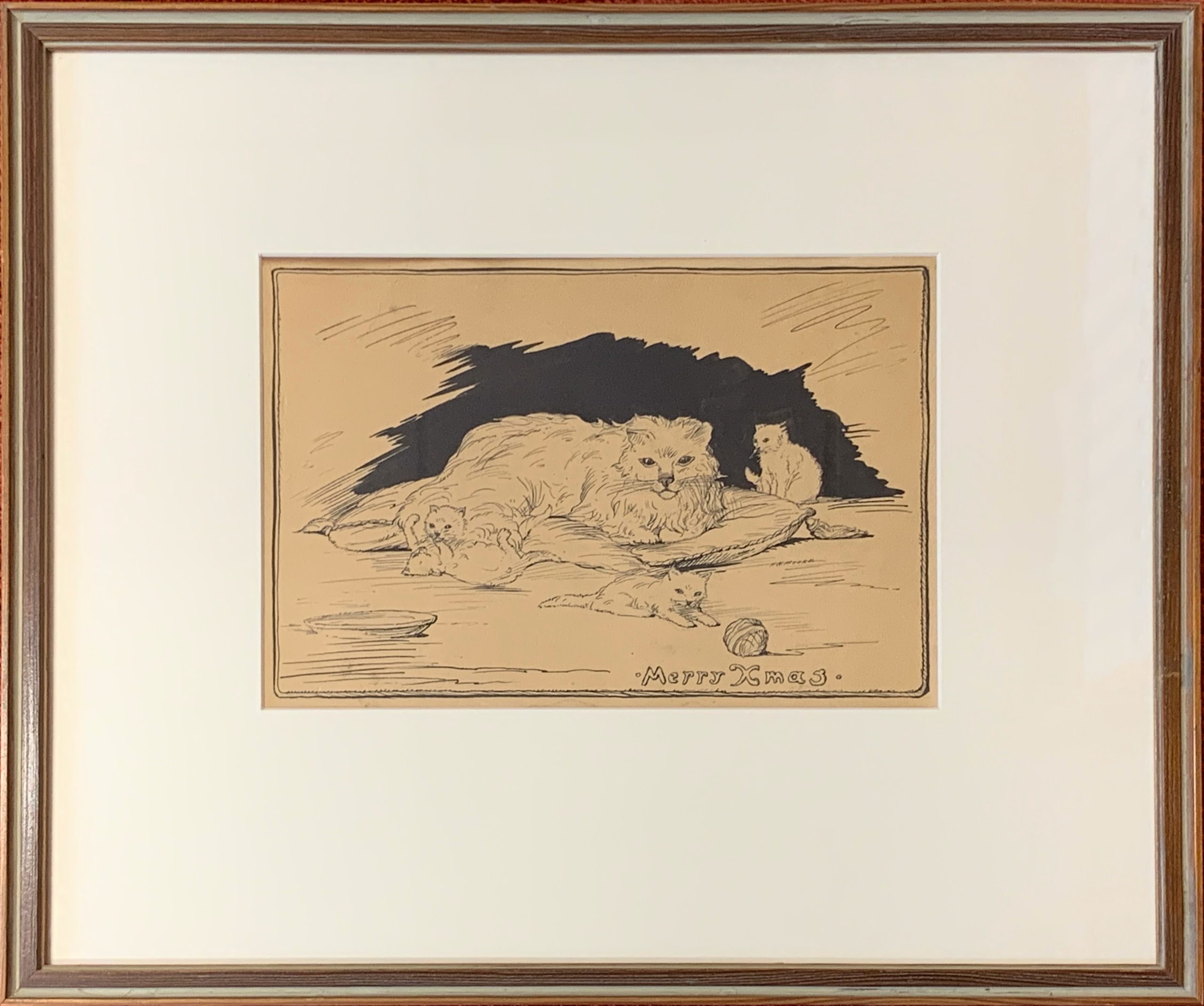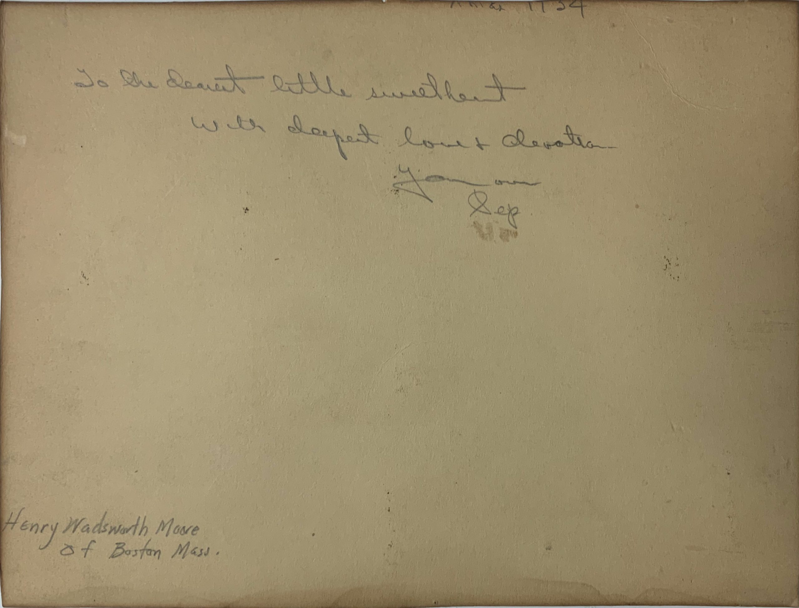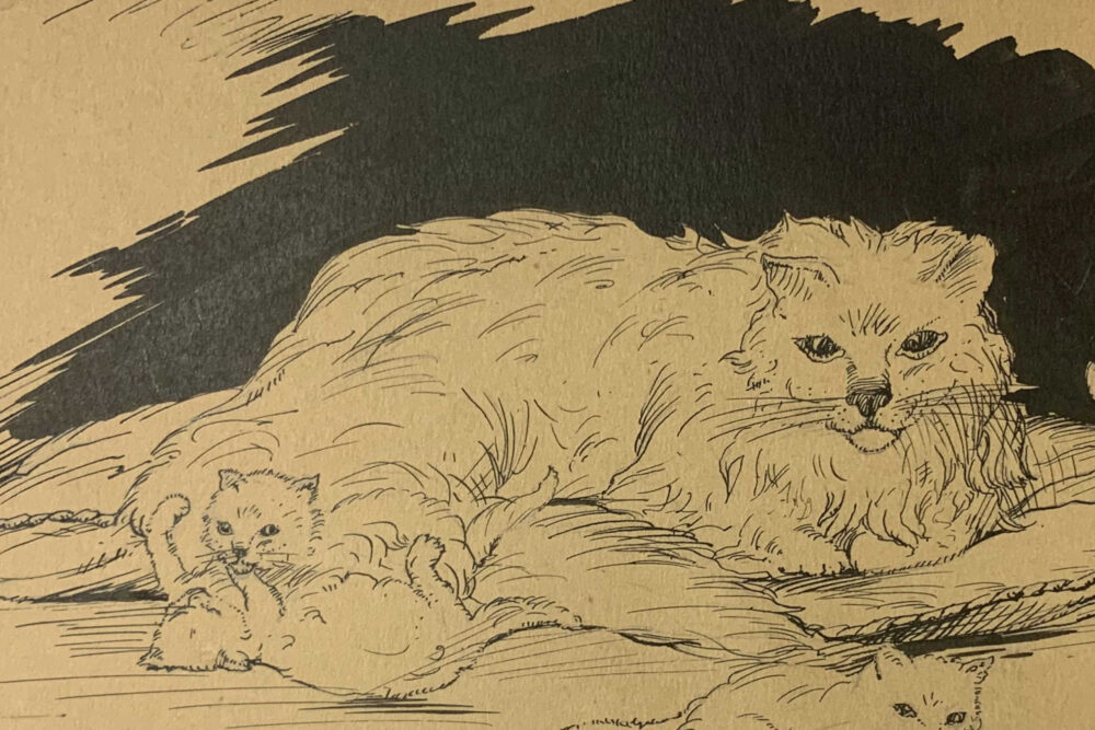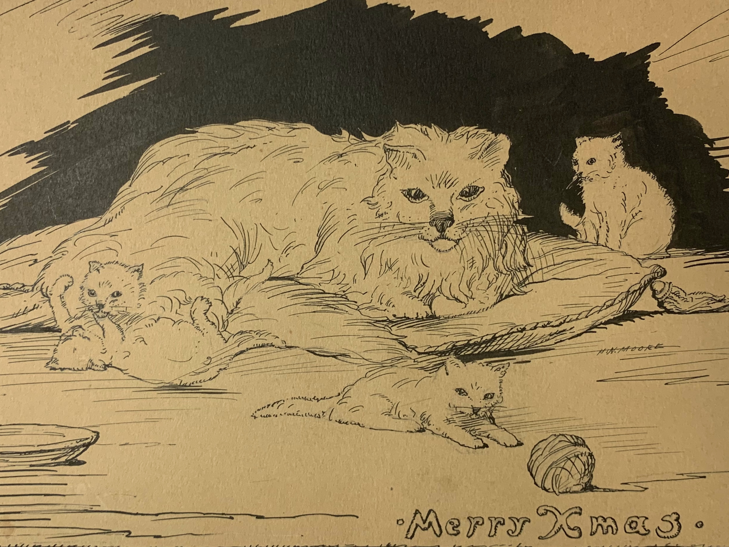 In 1934, when Henry Wadsworth Moore was about 55 years old, he sent someone a Christmas card, hand-drawn with pen and ink, depicting a mother cat on a cushion with four playful kittens.  Inscribed on the reverse:  “Xmas 1934 – To the dearest little sweetheart with deepest love and devotion, your own Pop”.