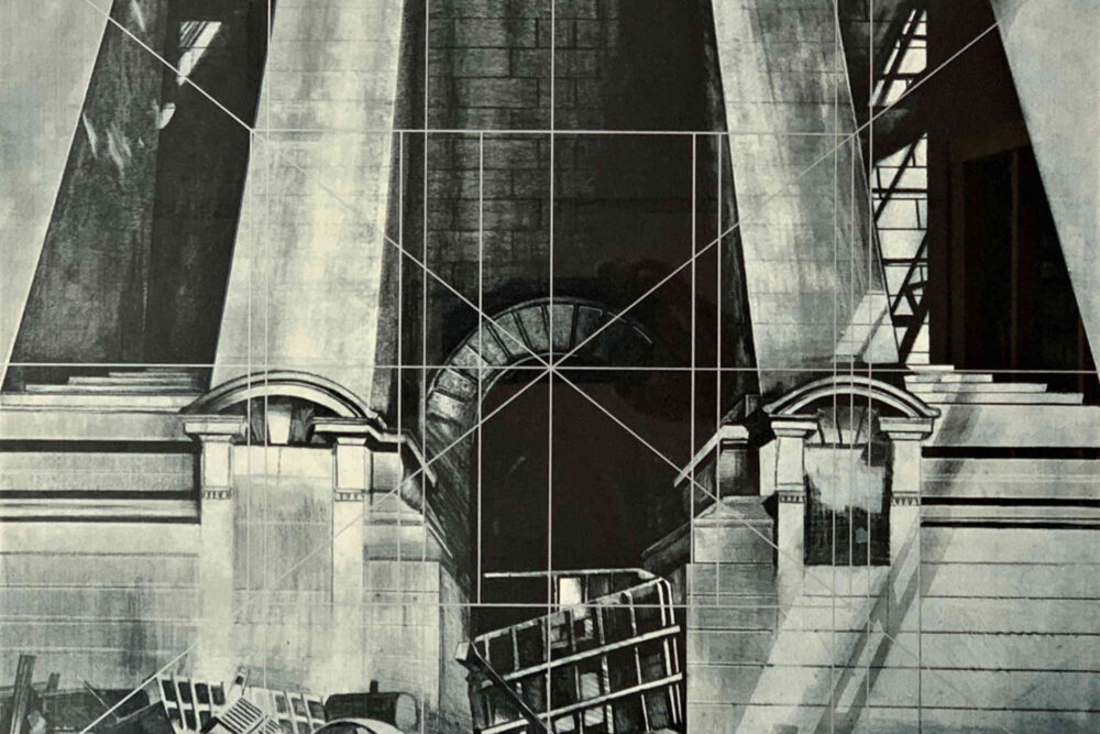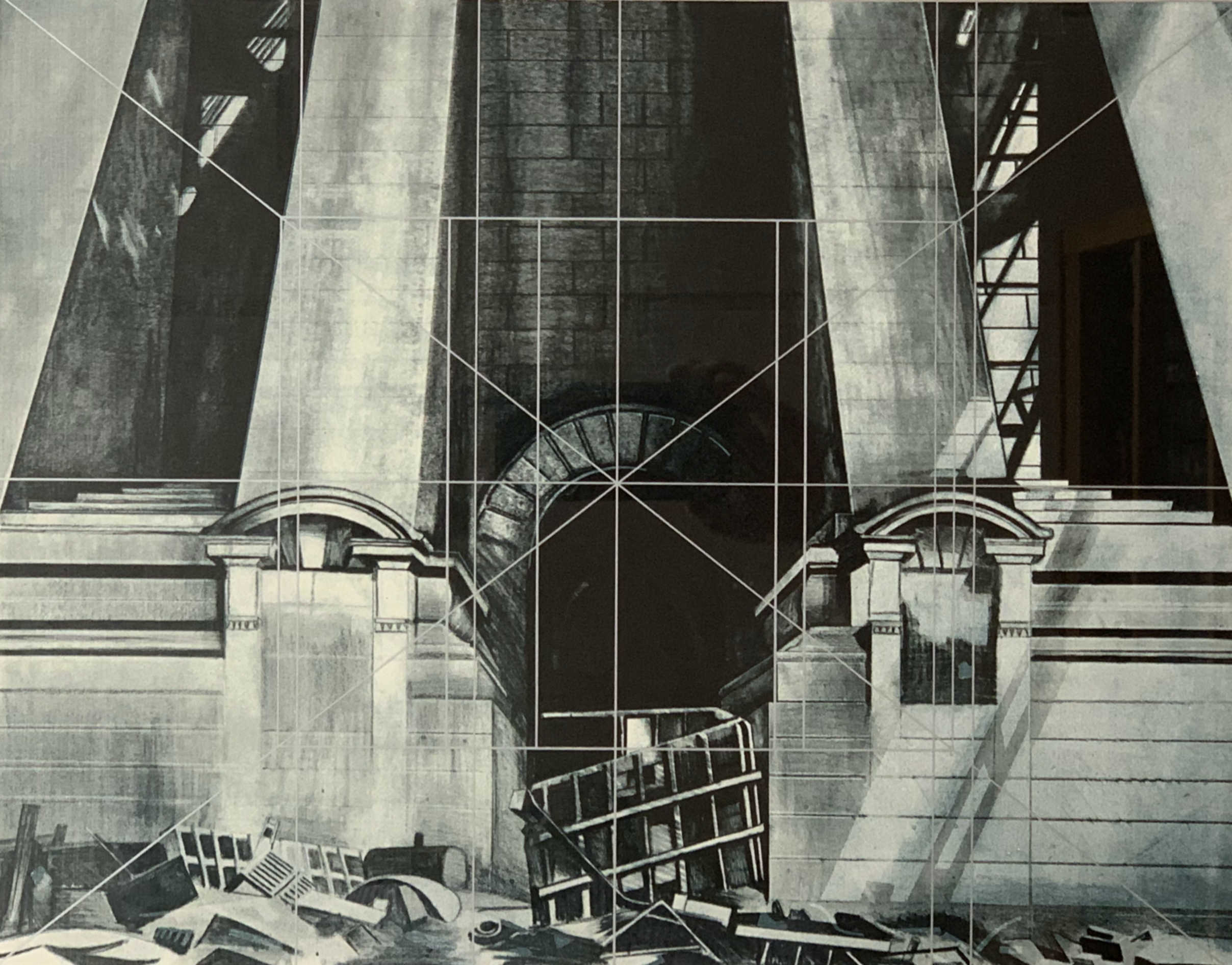 A moody depiction of a building entrance blocked by ladders, fences, pallets, and boxes.