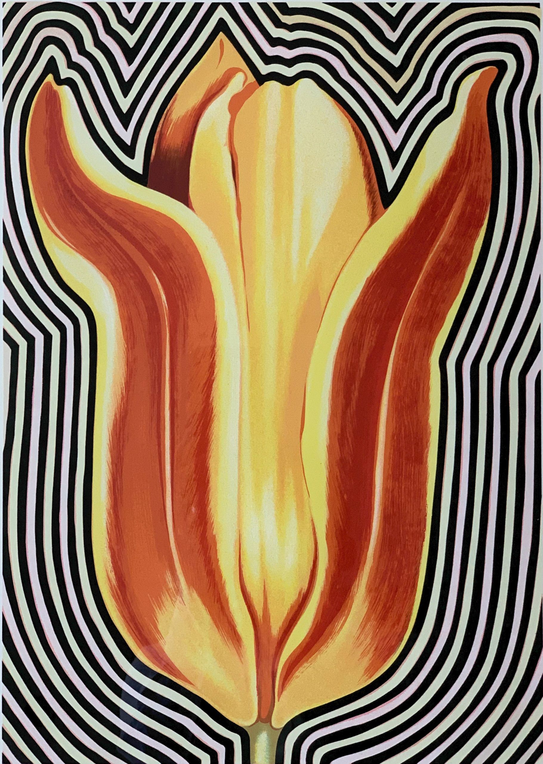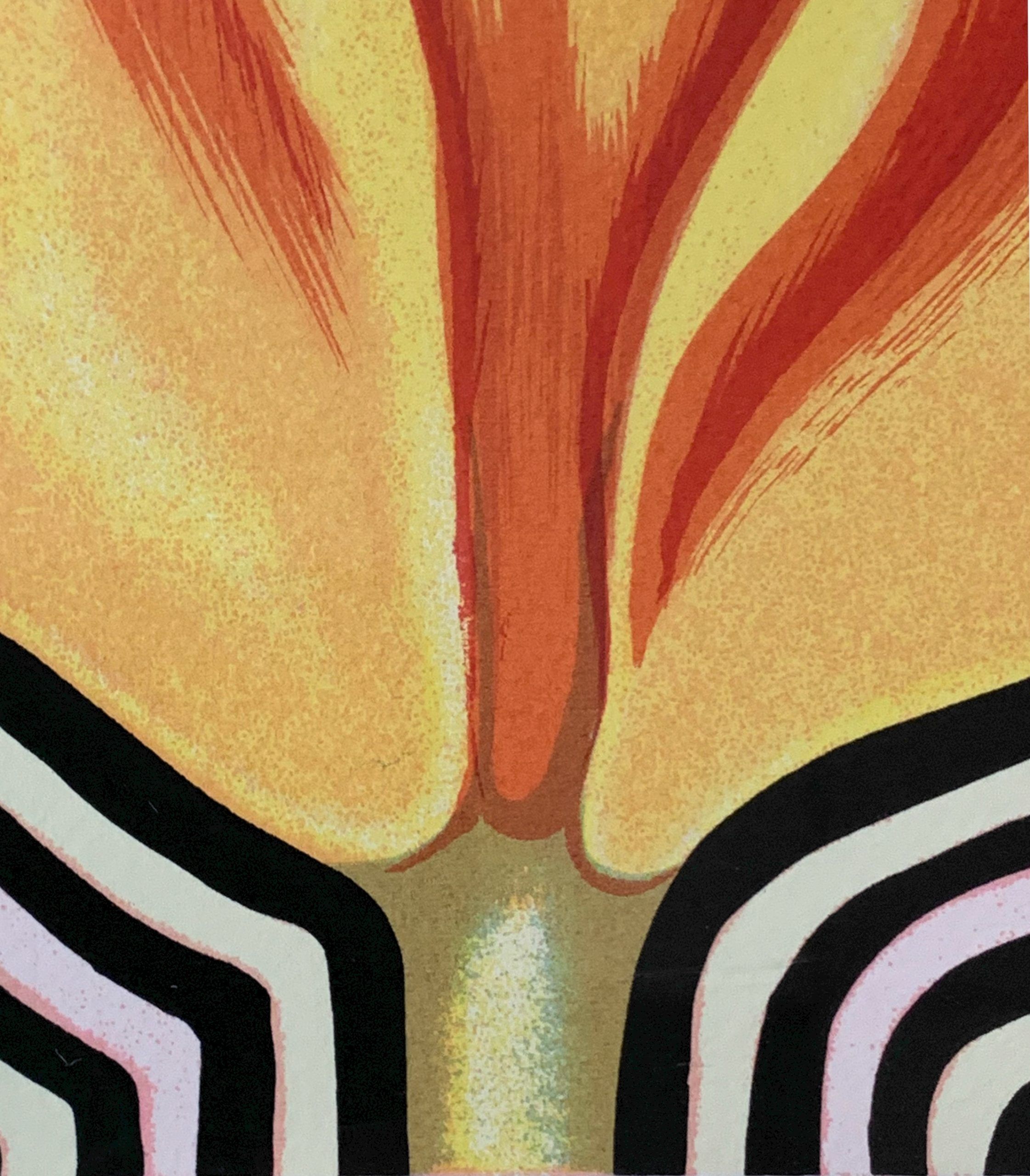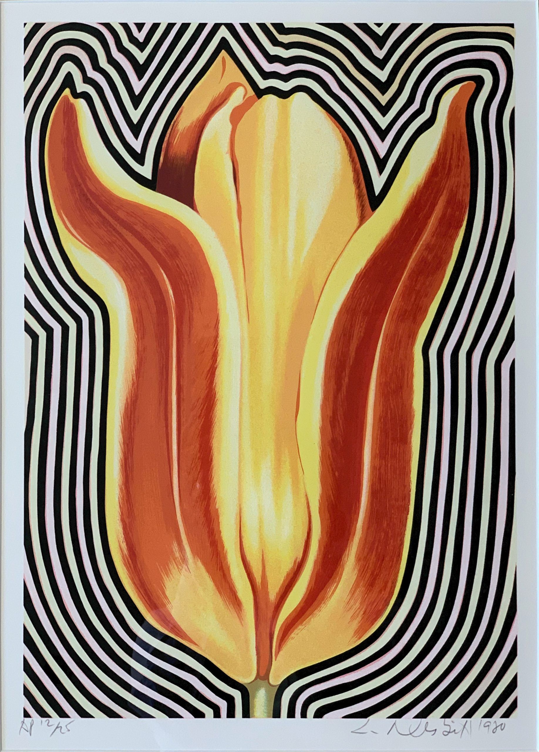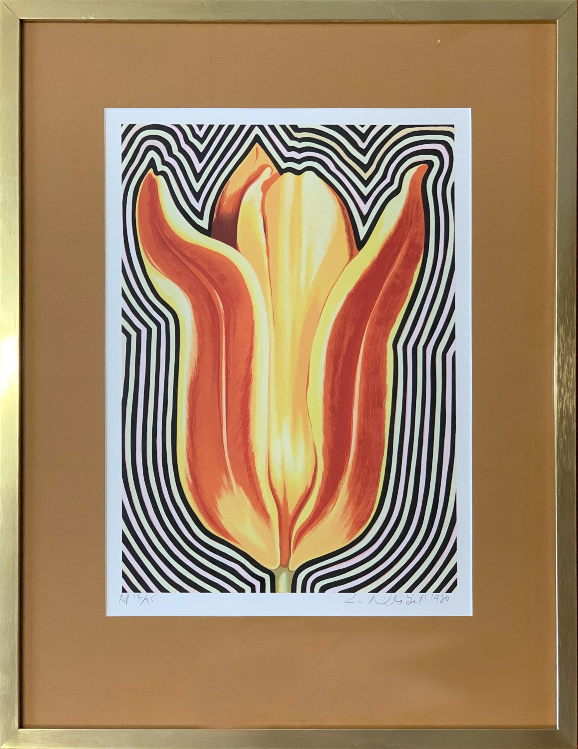The Iris, the Tulip, and the Lily are the three flower images with which I work from all directions.  Specifically, the so-called “Electric Flower Series” began in 1973, first in drypoint prints, then in my paintings and drawings.  I have always been interested in the geometric structure of the flower and in this case, its ability to throw out musical or electric reverberations.