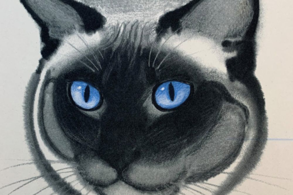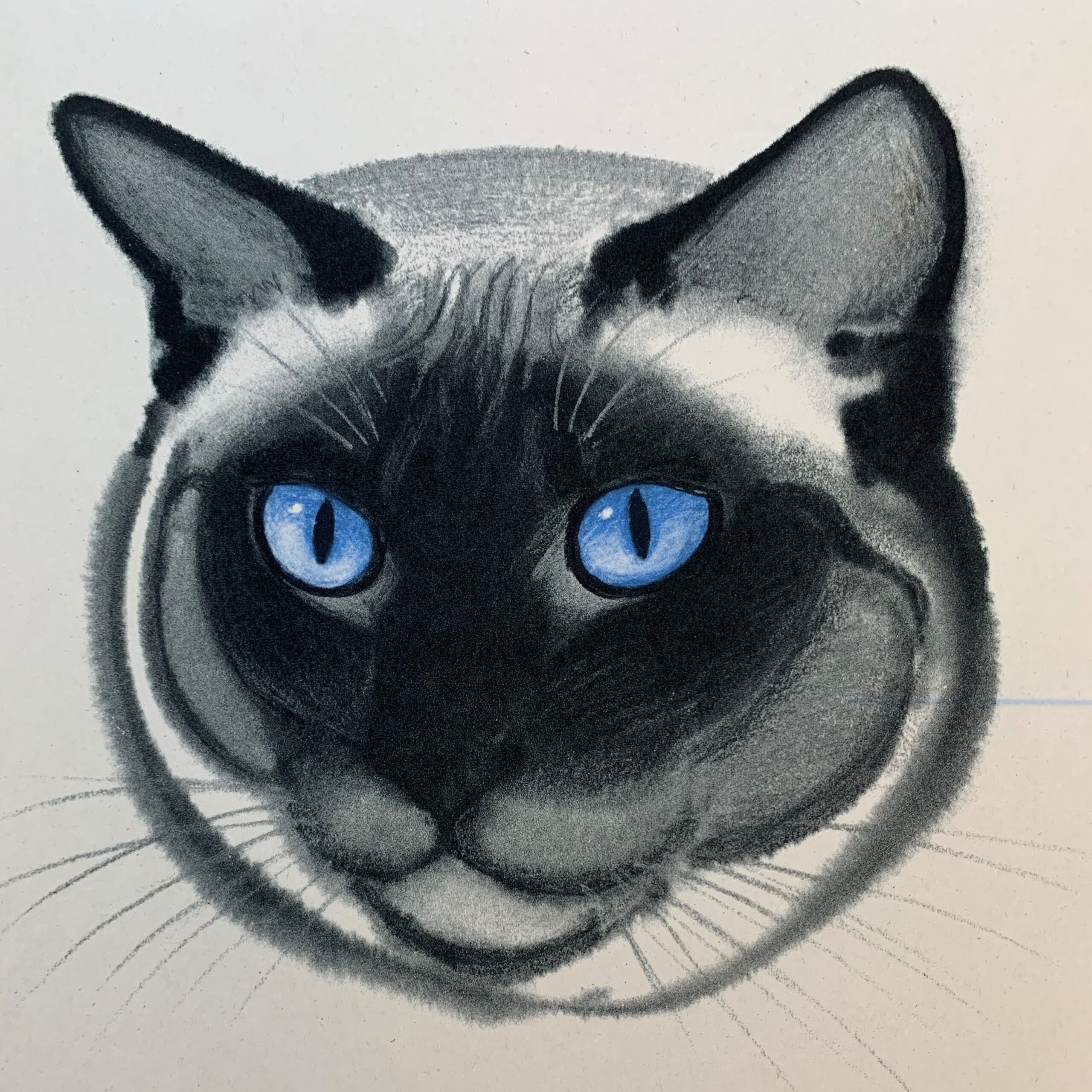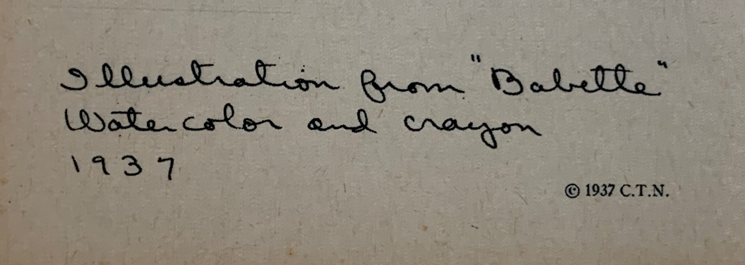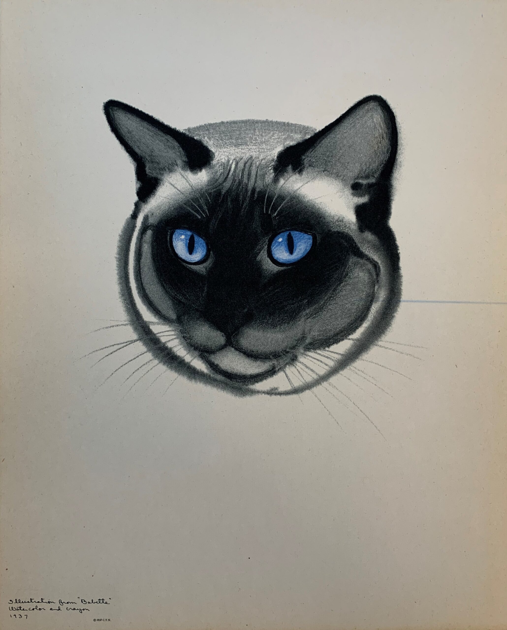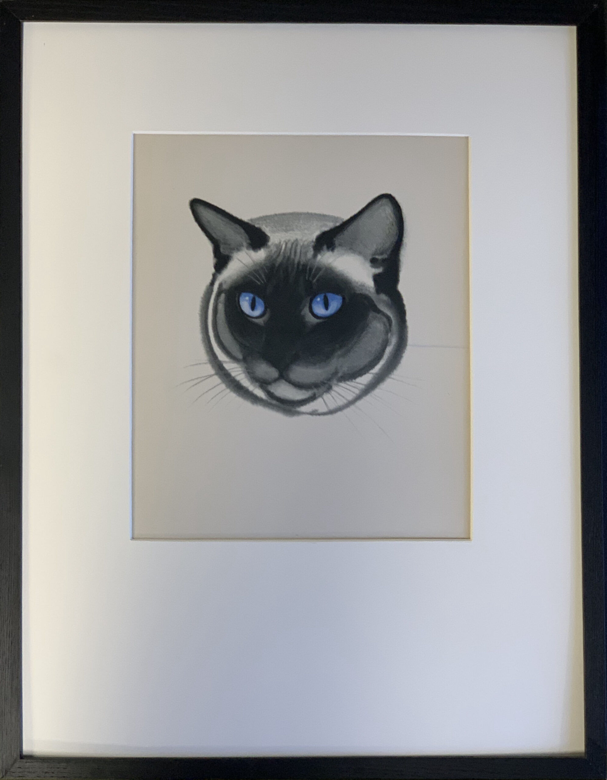 Clare Turlay Newberry wrote and illustrated seventeen children’s books—all but three of which were about cats, and nearly all taken from real life. Four of her books were honored with the Caldecott award. This print is a fine reproduction of Newberry’s watercolor painting with crayon of 1937, used to illustrate the end-papers of her Caldecott-winning book, April’s Kittens, published in 1943 by Harper & Brothers. It is a formal portrait of a not-formal animal (or maybe a not-formal portrait of a formal animal?); it is adorable and beautifully executed at the same time.