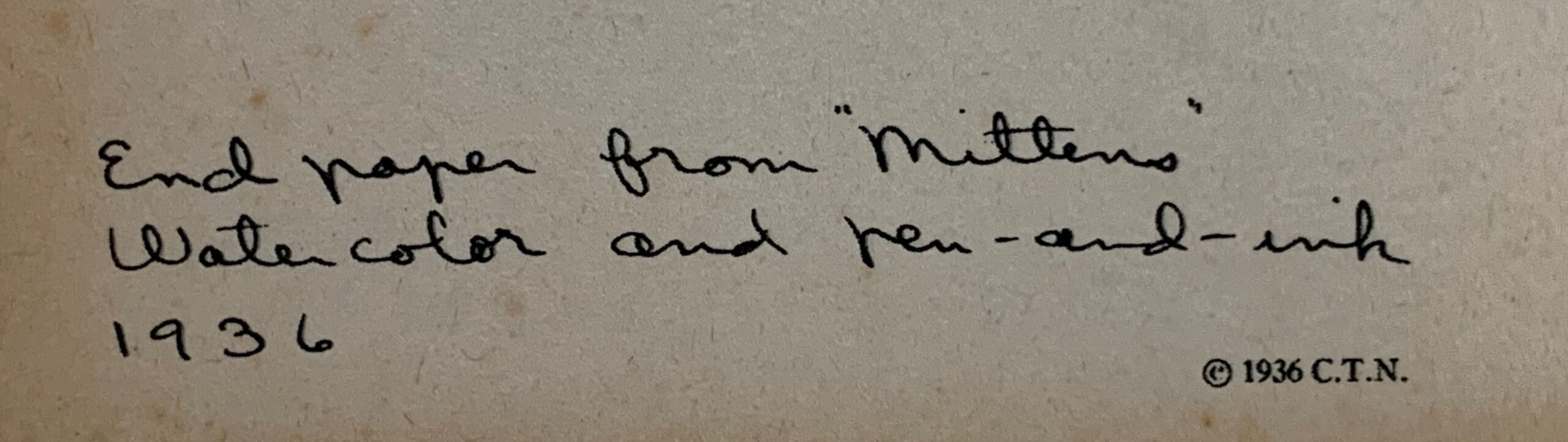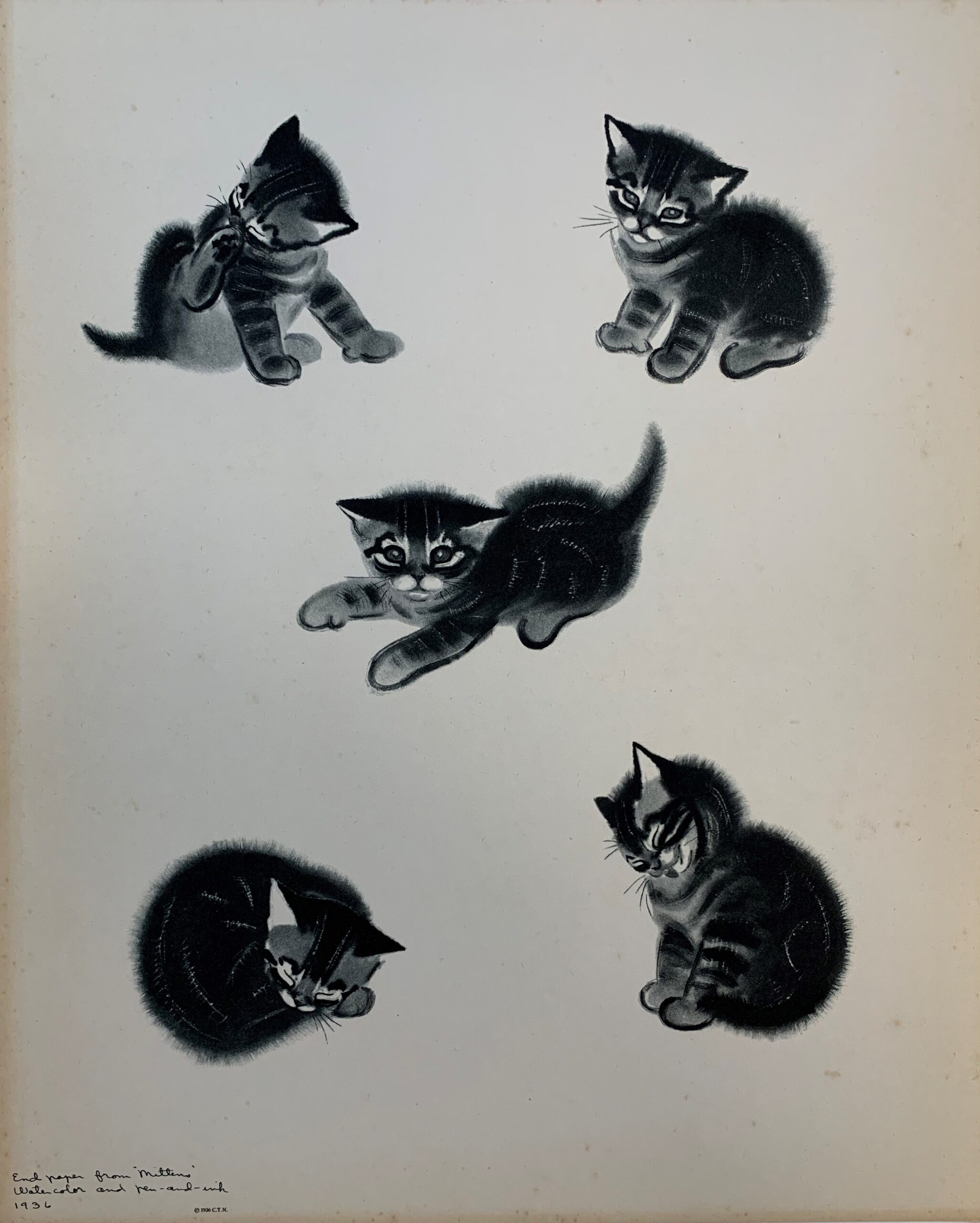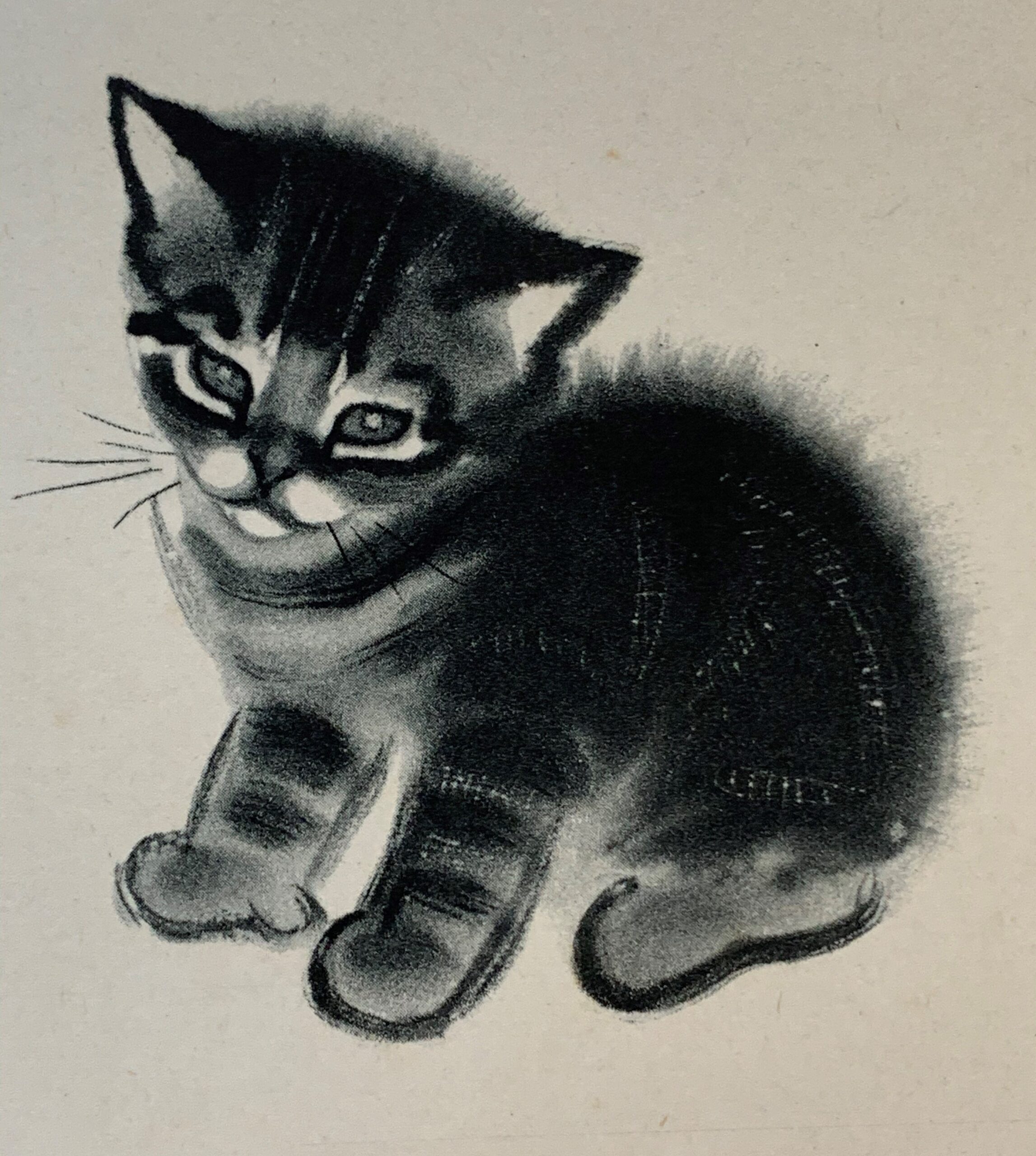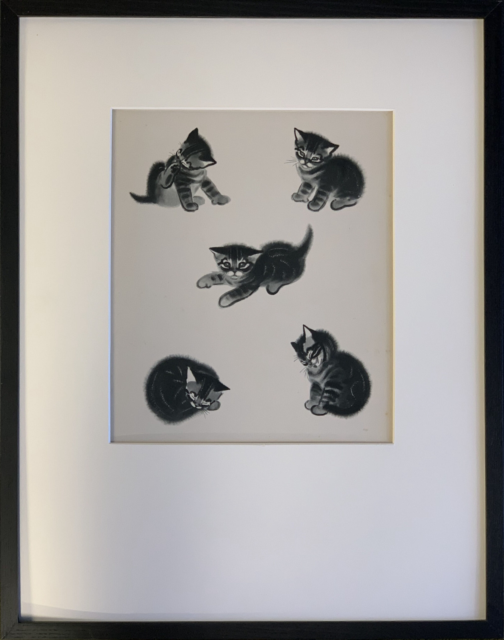 Clare Turlay Newberry wrote and illustrated seventeen children’s books—all but three of which were about cats, and nearly all taken from real life. Four of her books were honored with the Caldecott award. This print is a fine reproduction of Newberry’s watercolor painting with pen-and-ink of 1936, used to illustrate the end-papers of her , Caldecott-winning book, April’s Kittens, published in 1943 by Harper & Brothers. It is a formal portrait of a not-formal animal (or maybe a not-formal portrait of a formal animal?); it is adorable and beautifully executed at the same time.