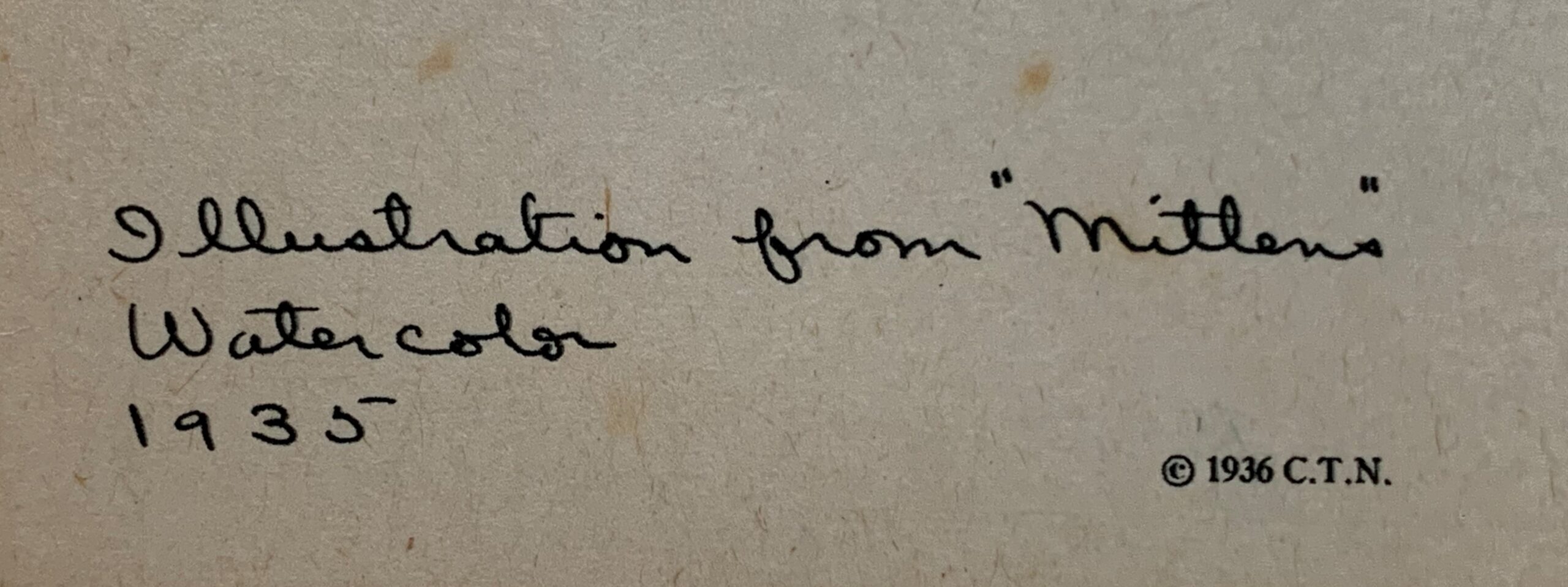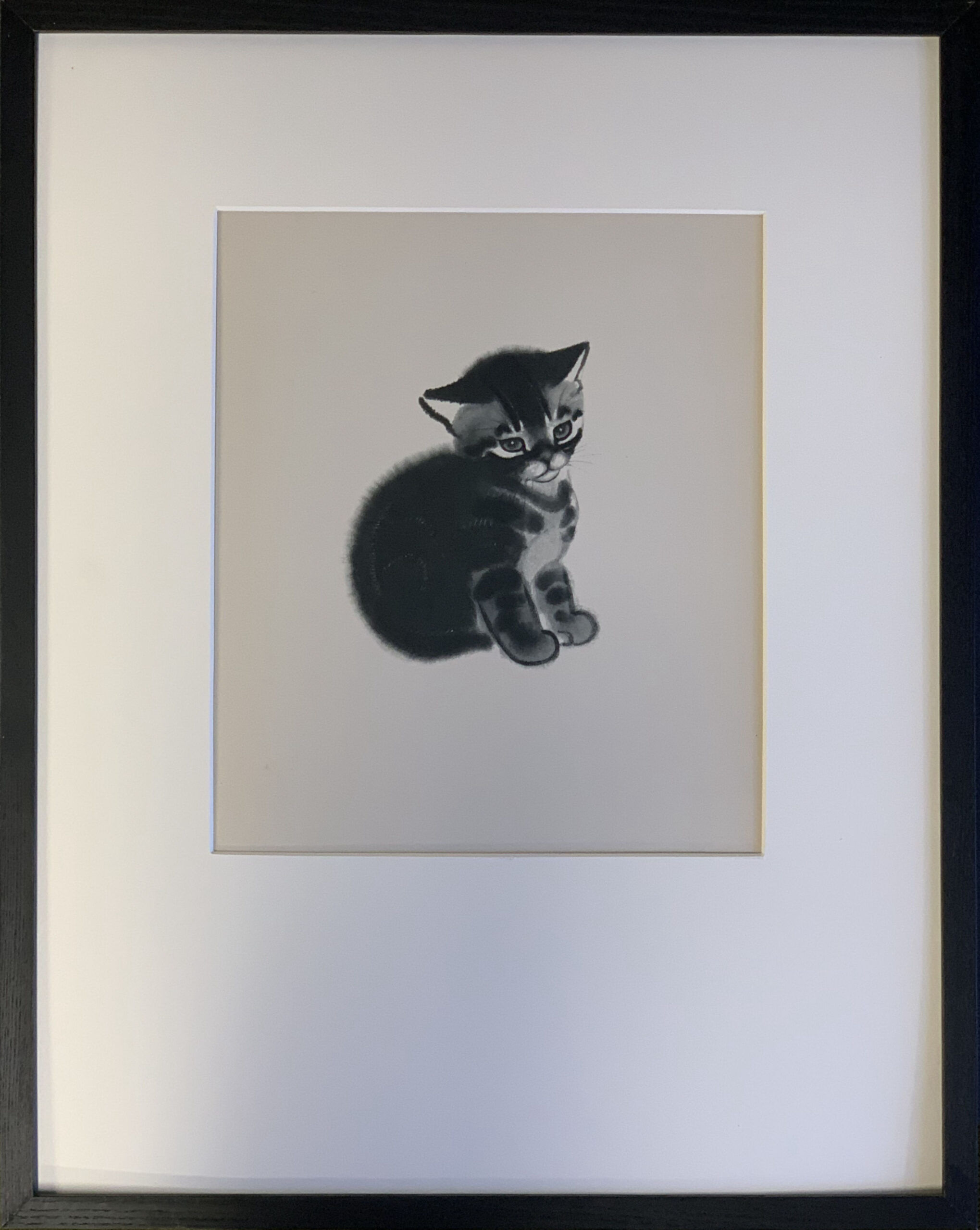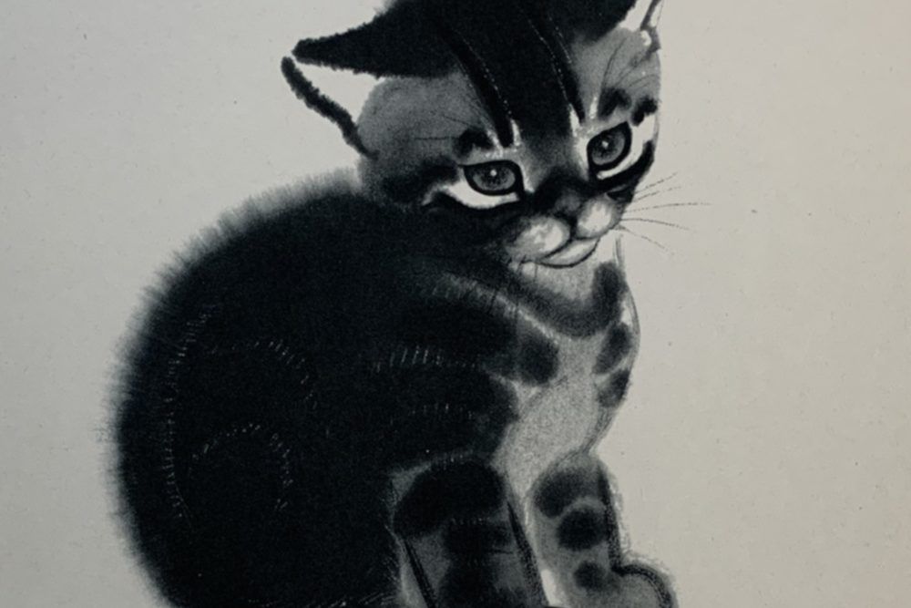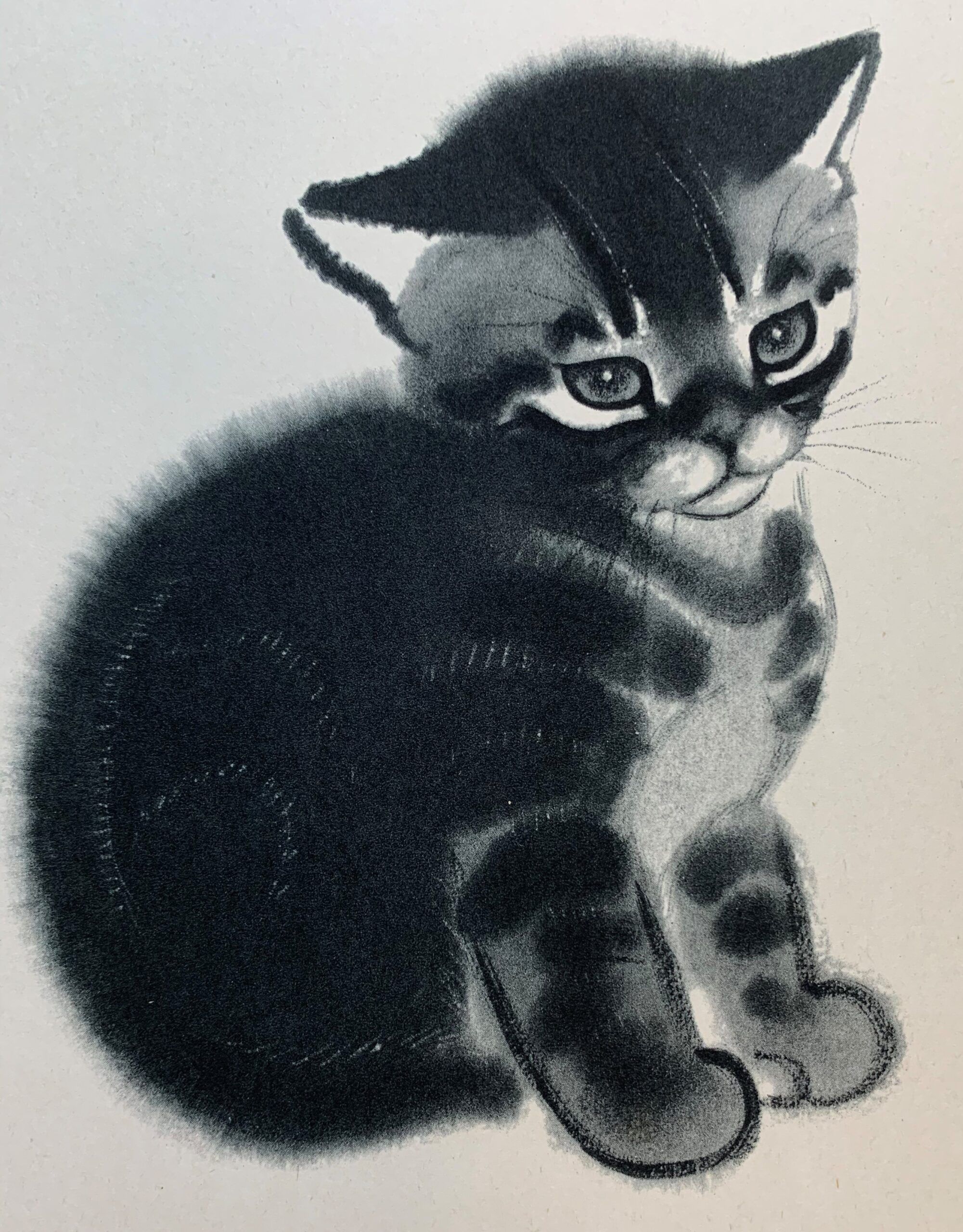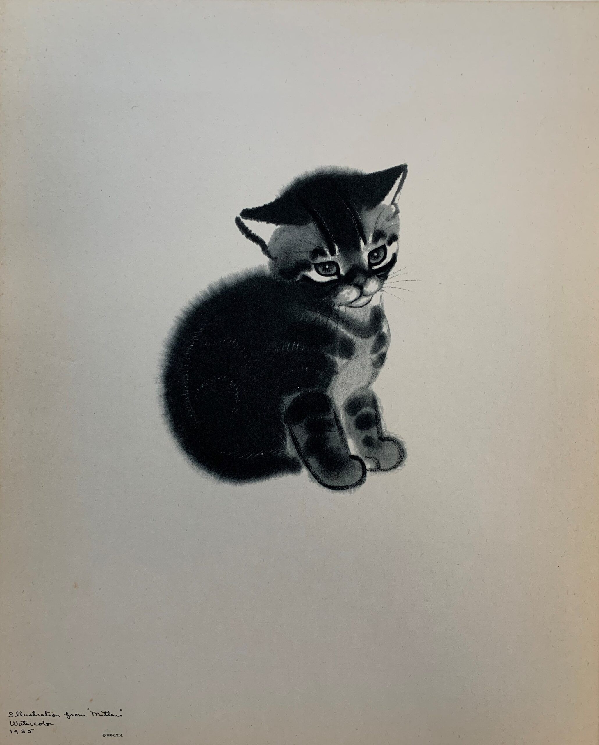 Clare Turlay Newberry wrote and illustrated seventeen children’s books—all but three of which were about cats, and nearly all taken from real life. Four of her books were honored with the Caldecott award. This print, published in 1943 by Harper & Brothers, is a fine reproduction of Newberry’s watercolor painting of 1935 illustrating her Caldecott-winning book, April’s Kittens. It is a formal portrait of a not-formal animal (or maybe a not-formal portrait of a formal animal?); it is adorable and beautifully executed at the same time.