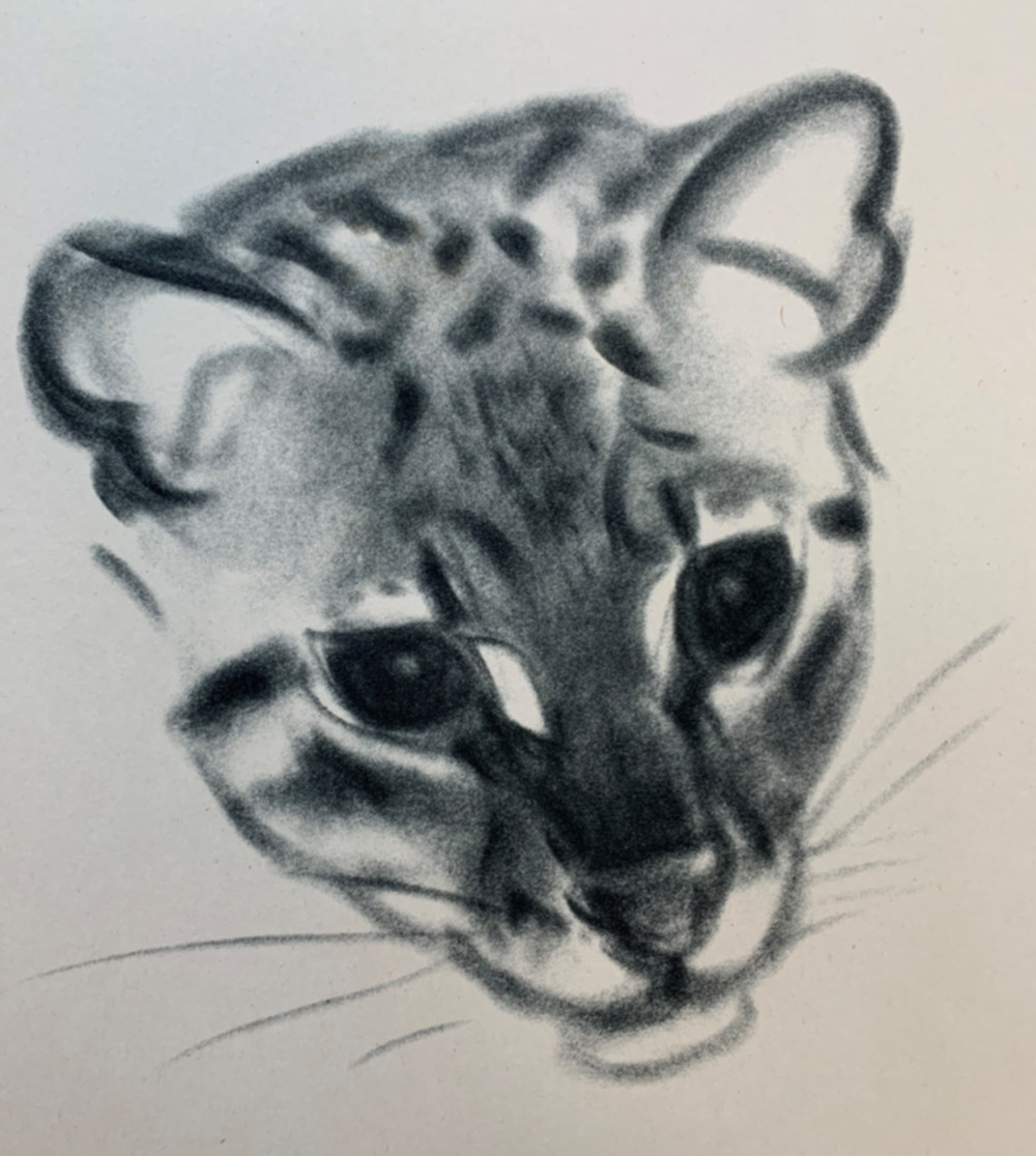 Clare Turlay Newberry wrote and illustrated seventeen children’s books—all but three of which were about cats, and nearly all taken from real life. Four of her books were honored with the Caldecott award. This print, published in 1943 by Harper & Brothers, is a fine reproduction of Newberry’s watercolor and crayon drawing  of the same year illustrating her Caldecott-winning book, April’s Kittens. It is a formal portrait of a not-formal animal (or maybe a not-formal portrait of a formal animal?); it is adorable and beautifully executed at the same time.