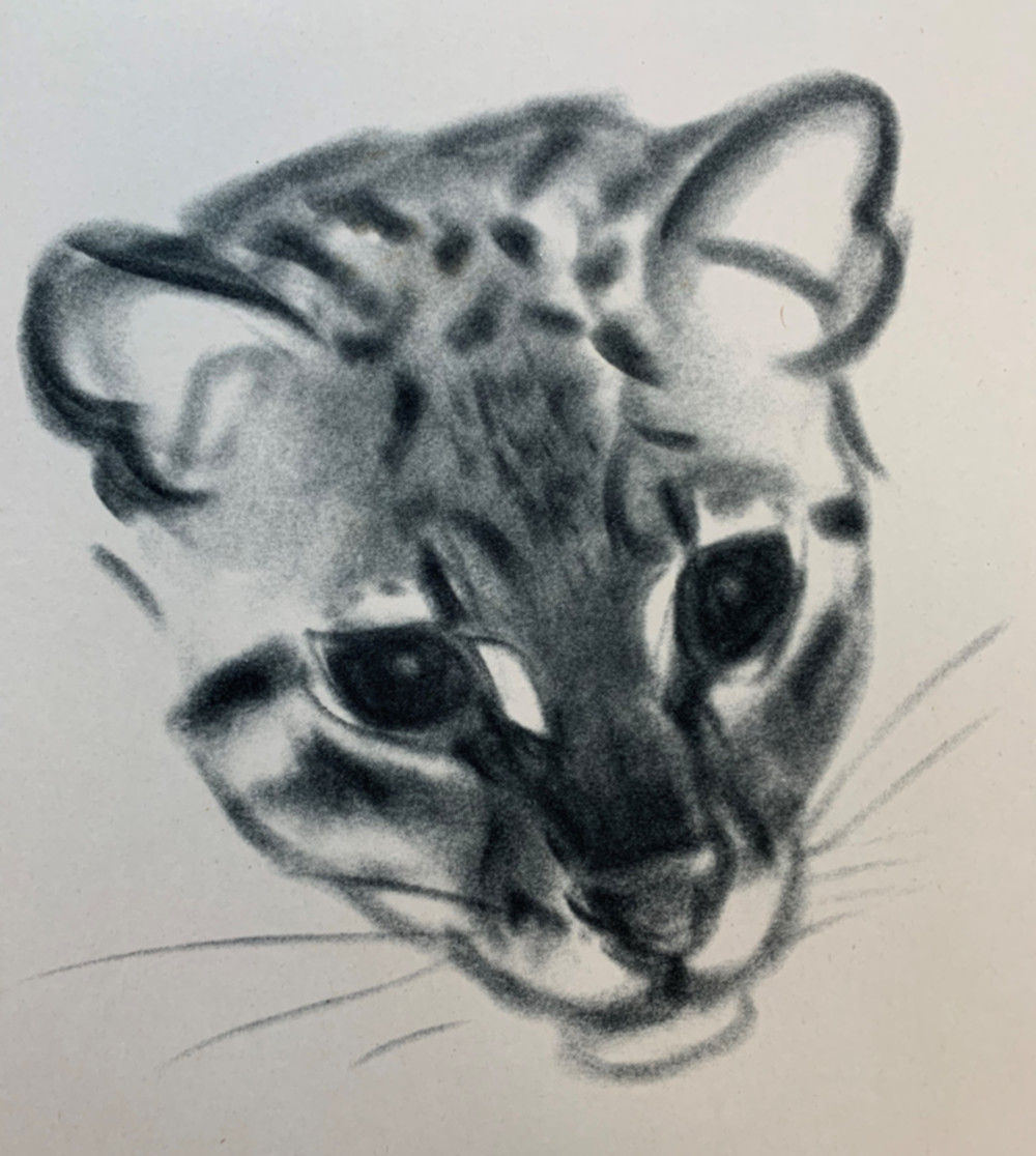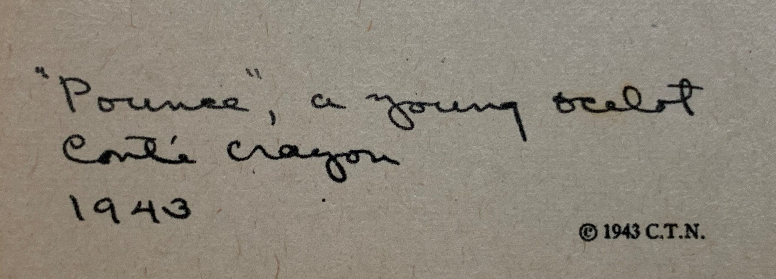 Clare Turlay Newberry wrote and illustrated seventeen children’s books—all but three of which were about cats, and nearly all taken from real life. Four of her books were honored with the Caldecott award. This print, published in 1943 by Harper & Brothers, is a fine reproduction of Newberry’s watercolor and crayon drawing of the same year illustrating her Caldecott-winning book, April’s Kittens. It is a formal portrait of a not-formal animal (or maybe a not-formal portrait of a formal animal?); it is adorable and beautifully executed at the same time.