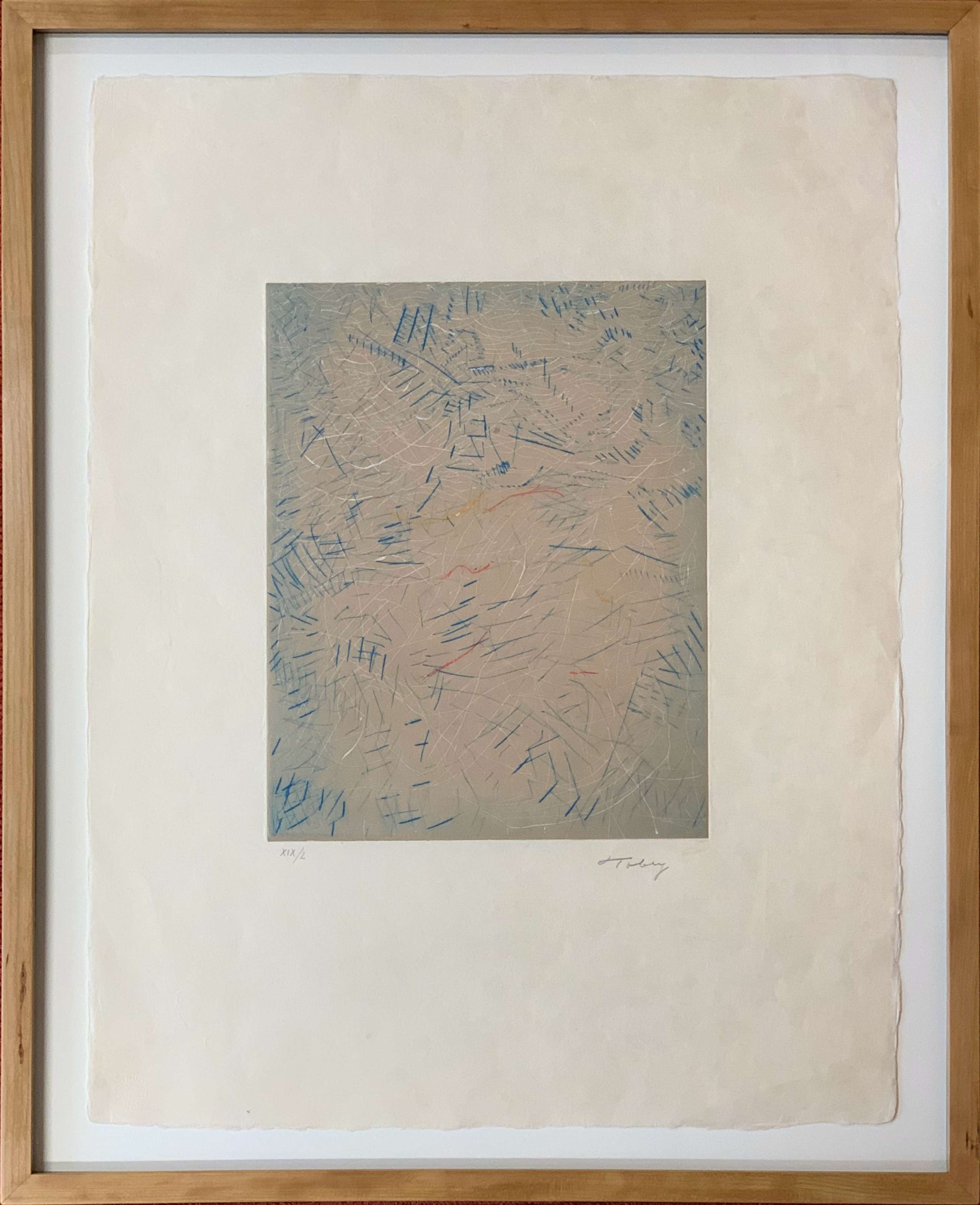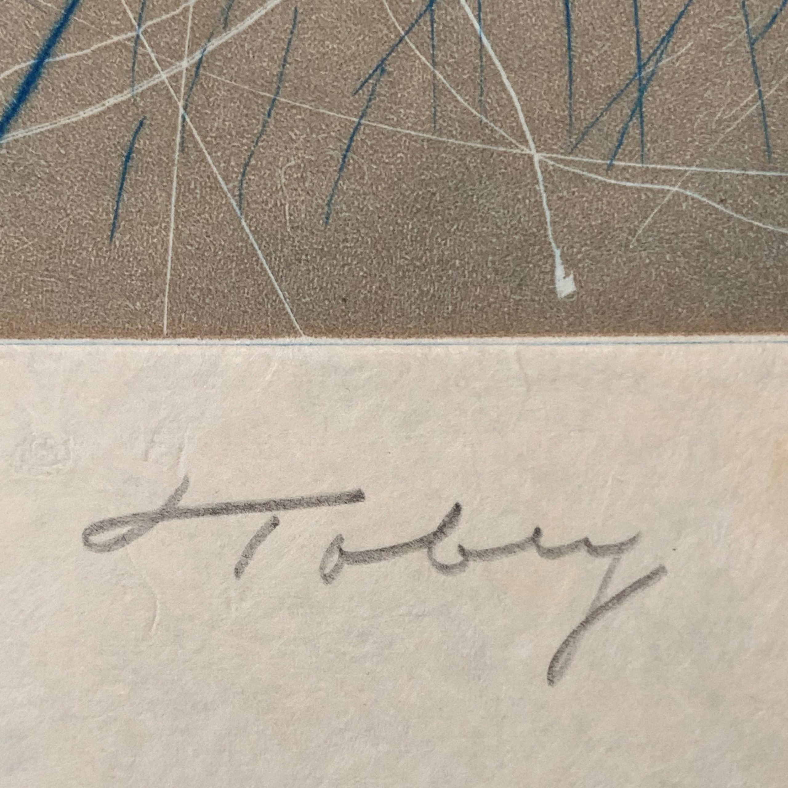 In the late 1930s, Tobey developed a style of work that used the layering of numerous transparent and opaque brushstrokes within the composition. Initially, the lines were part of a figurative composition that highlighted realistic elements.  Eventually, though, the technique evolved into an inward type of meditative abstraction that covered the entire composition.  This style marked an important development in abstraction, highlighting the journey from true abstraction to the lines, shapes, colors, and light independently forming the work.