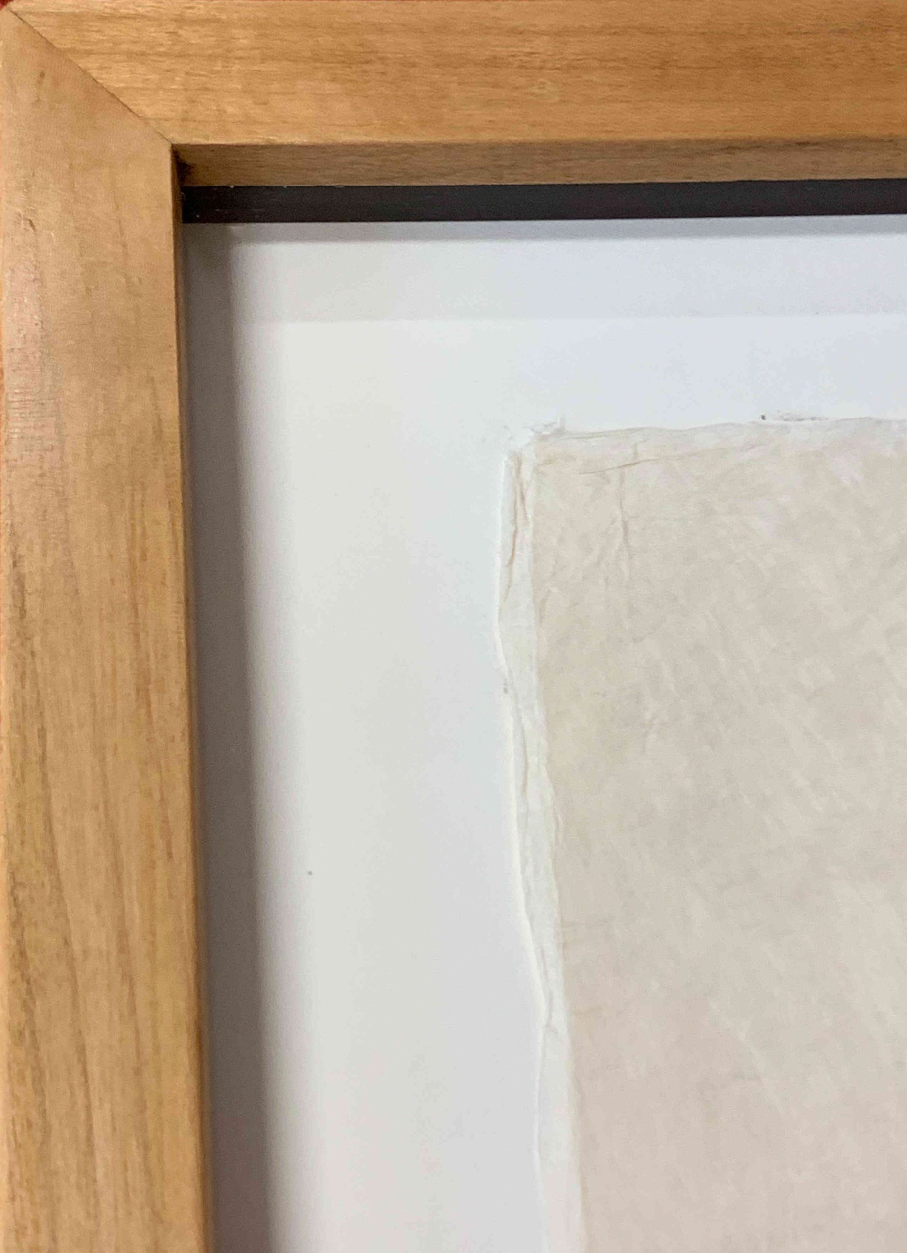 This work is floated and custom framed in a solid cherry frame behind 99% UV-Filtering Plexiglass.  The glazing is lifted off the work with spacers.  Framed with all conservation materials.