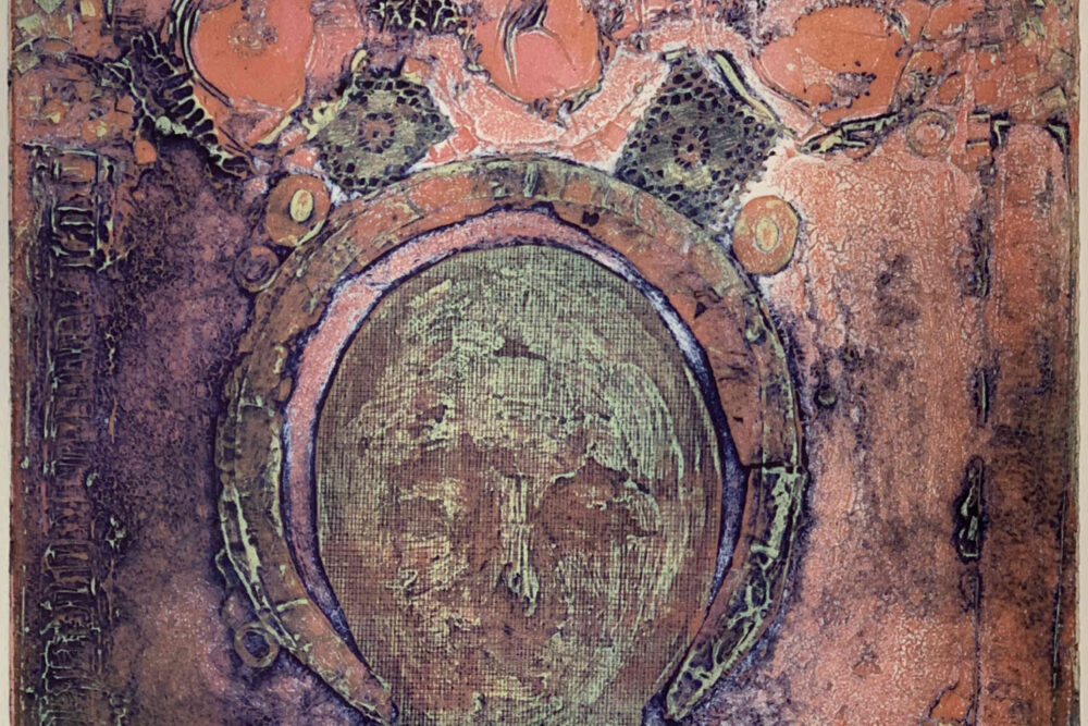 Intaglio print in many colors made from engraved plates on white wove paper.