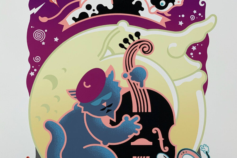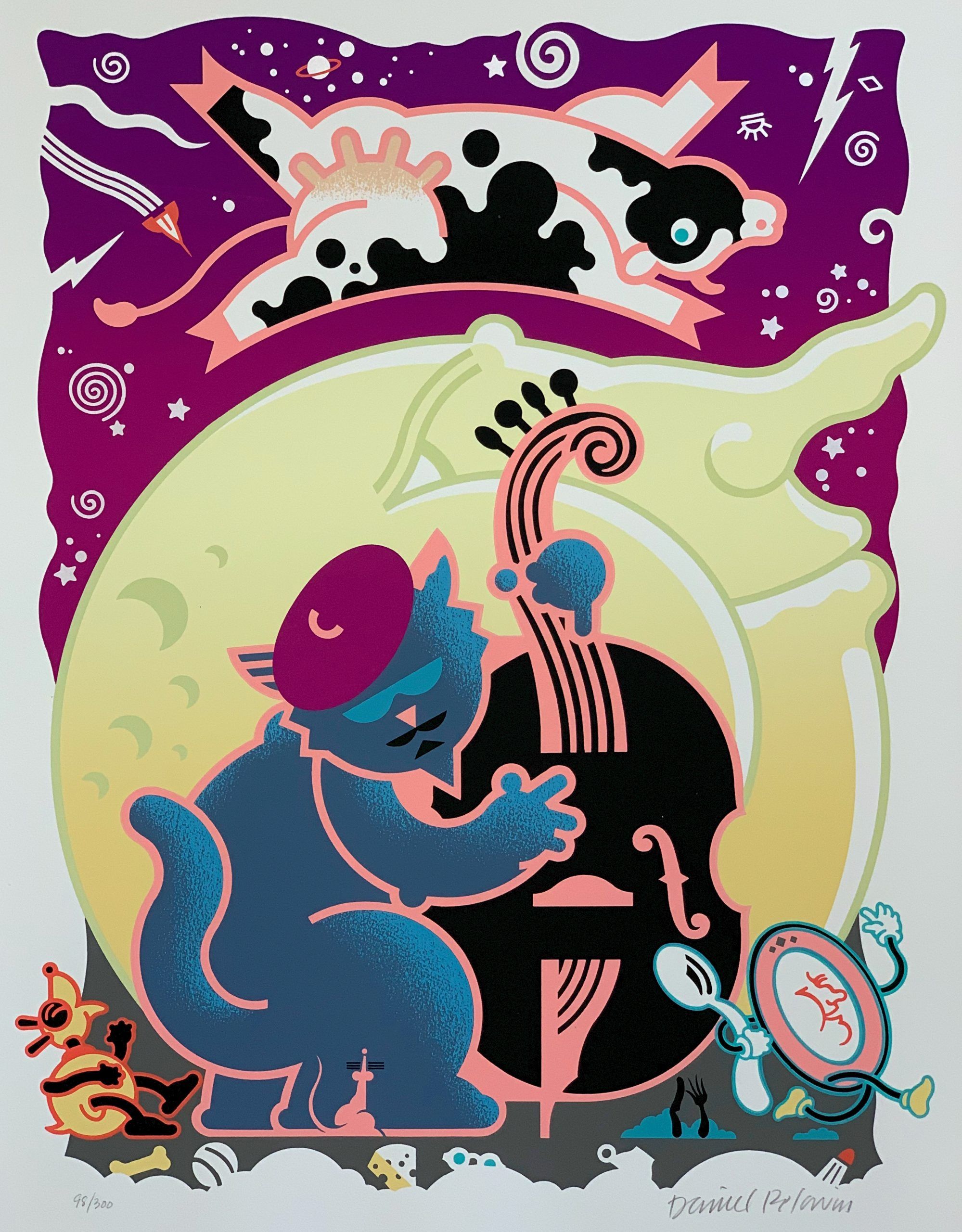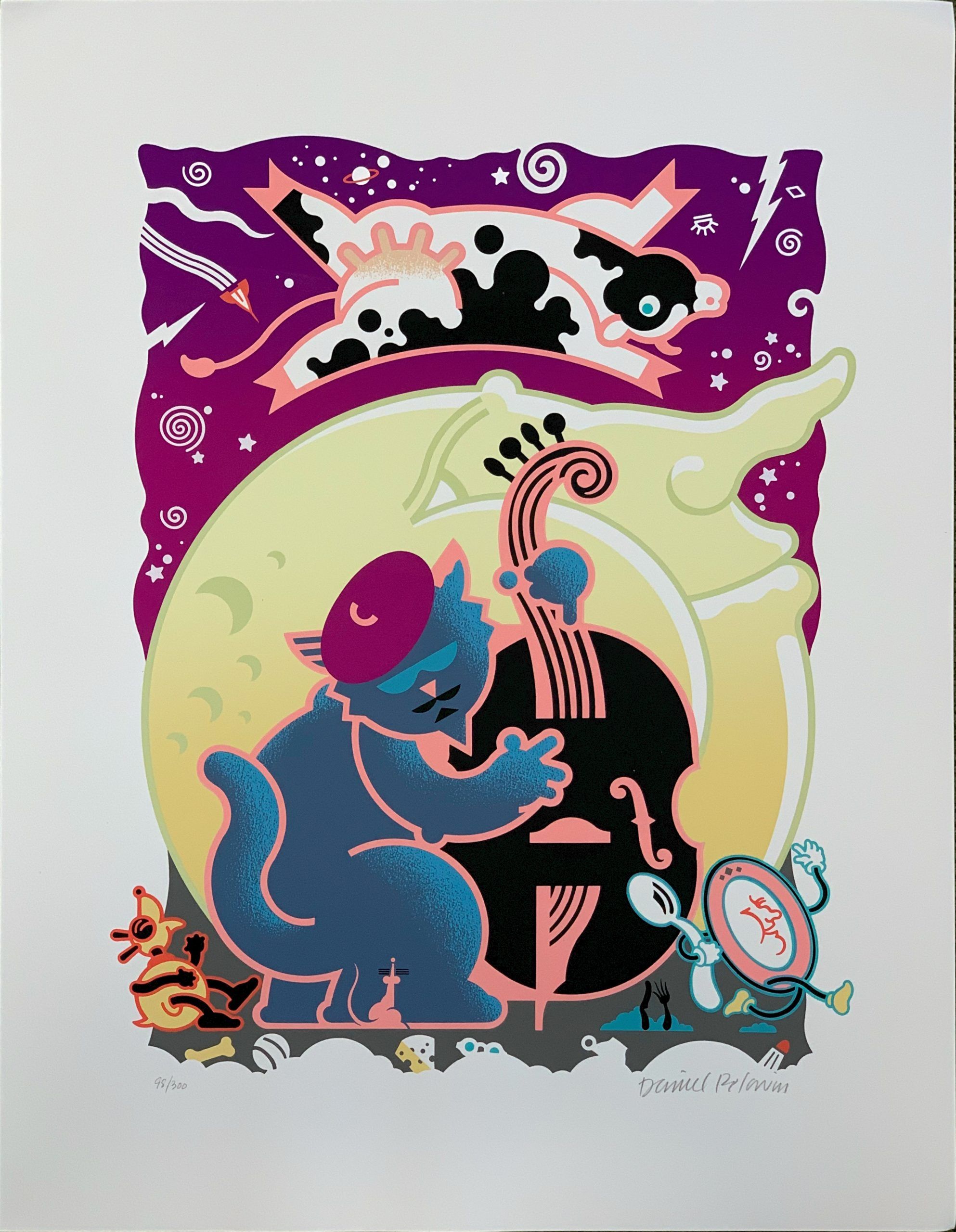 L. Frank Baum’s famous poem (though perhaps no one knows that it was Baum’s poem) is given a new look in Daniel Pelavin’s silkscreen for the Serigrafia’s Mother Goose portfolio. Pelavin, a very highly-regarded illustrator, brings whimsy and extraordinary creativity to his work. Here, the cat and his fiddle are joined by the mouse playing air guitar while the dish does the “running man”.