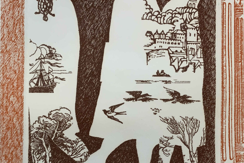 A depiction of three figures walking, surrounded by imagery suggesting travel, all rendered in earth tones.