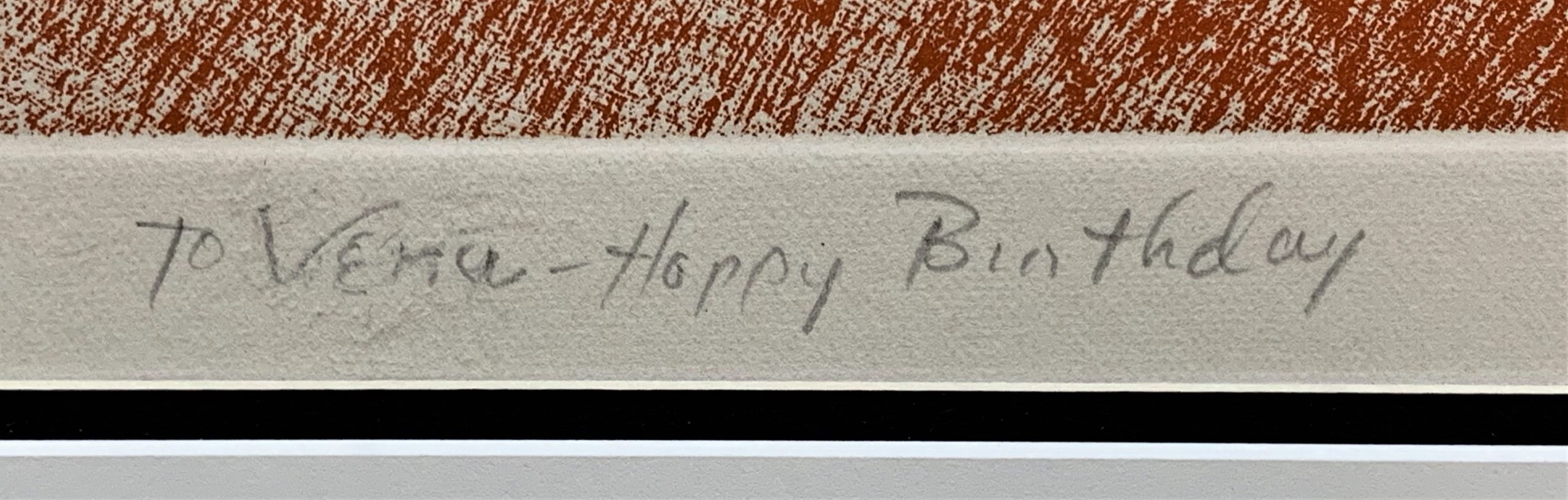 Hand-signed in pencil by the artist en recto lower right.  Editioned in pencil by the artist en recto lower center.  Titled in pencil by the artist en recto lower left.  Inscribed in pencil by the artist en recto lower center “To Vera – Happy Birthday”