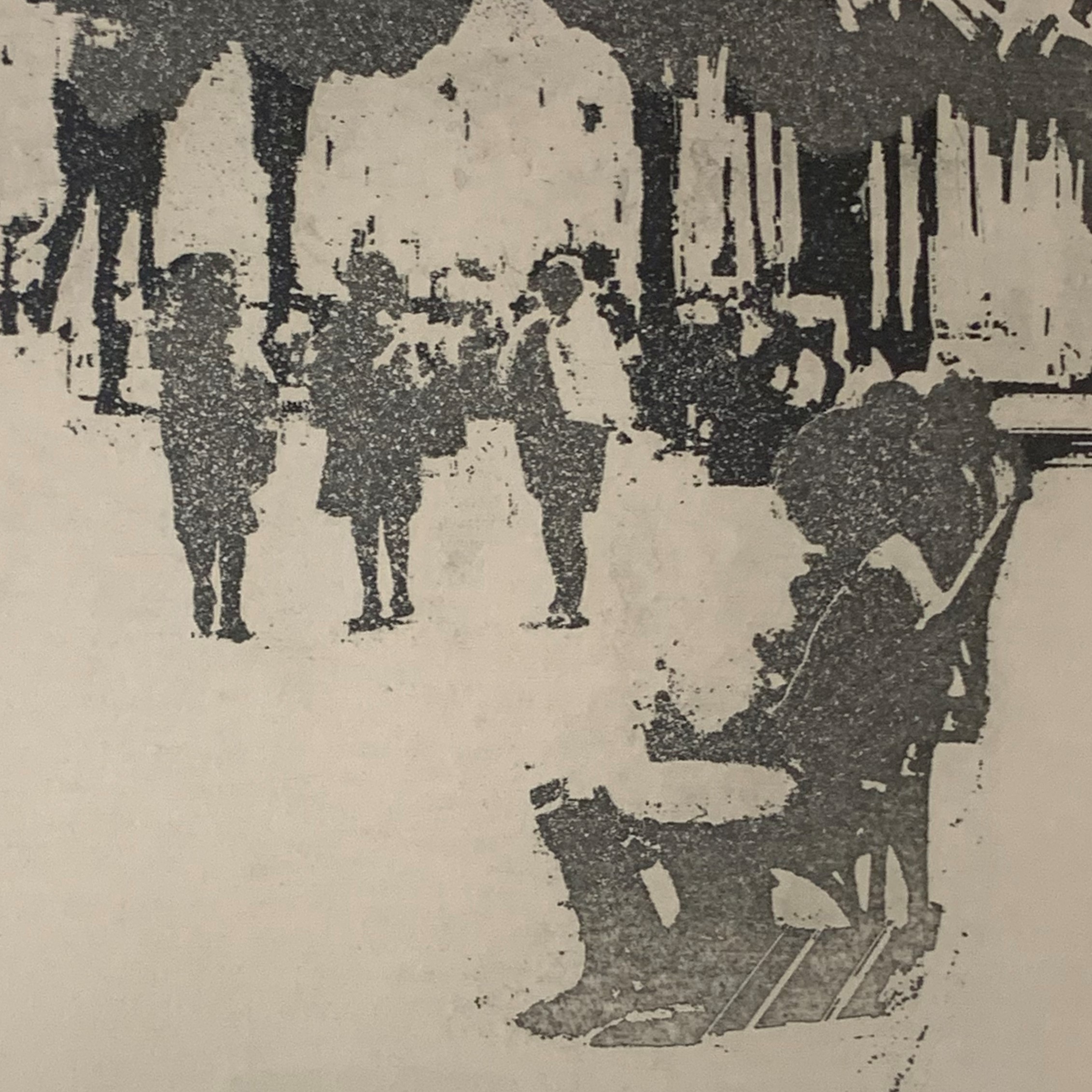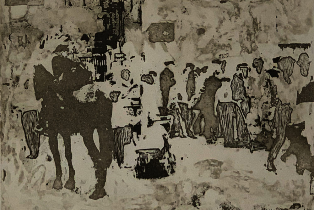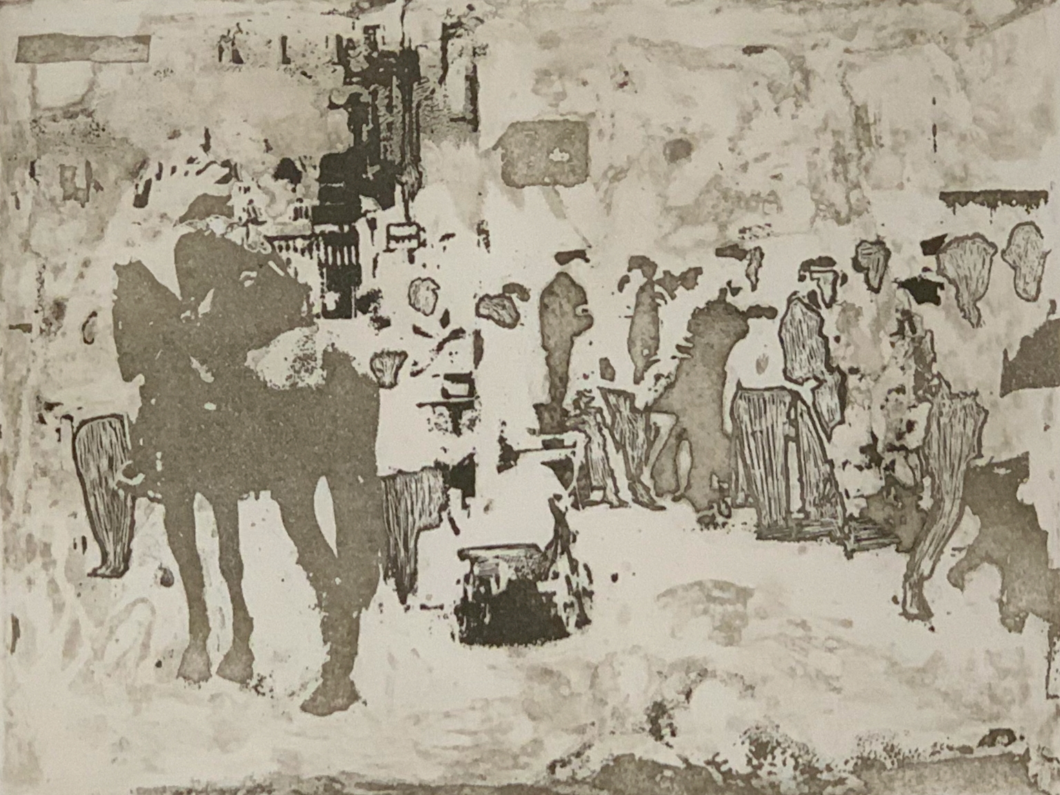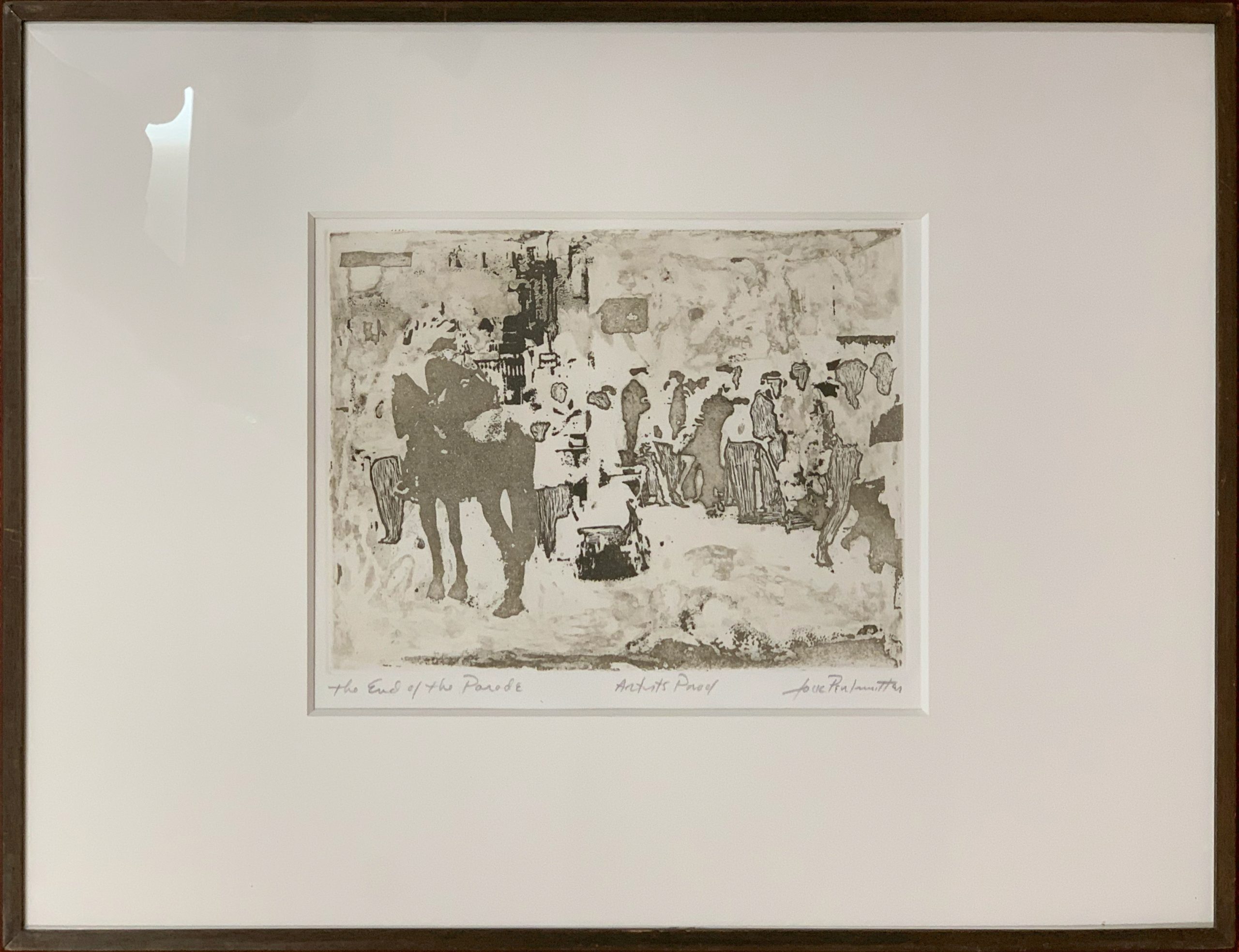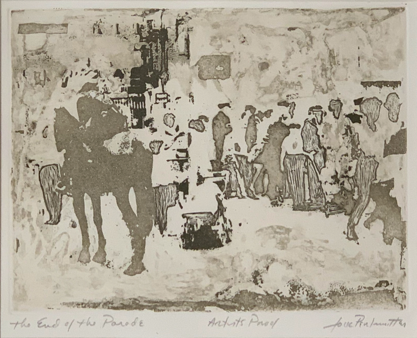 Jack Perlmutter’s trademark look:  A mottled image, dispassionate view of a city scene.  Through extraordinary one-dimensionality Perlmutter has created a work of great depth.