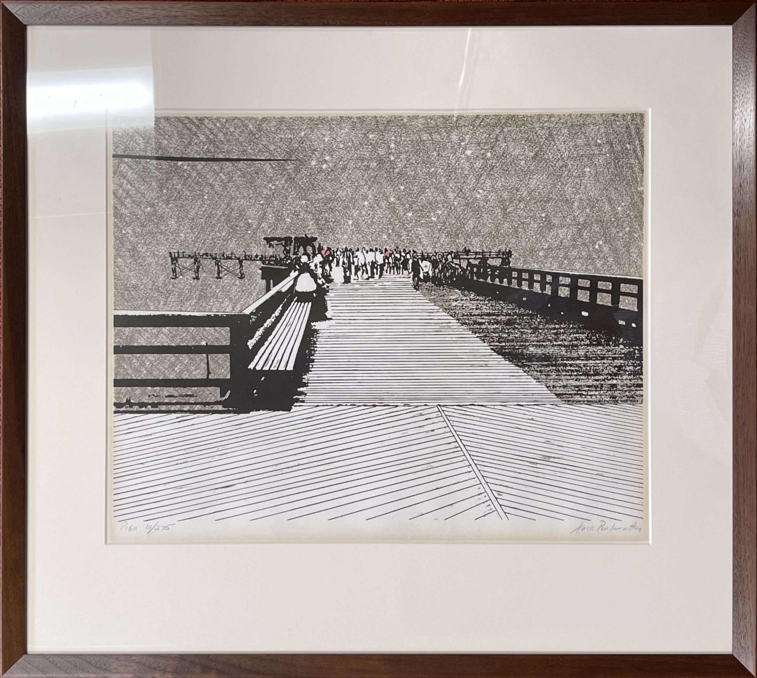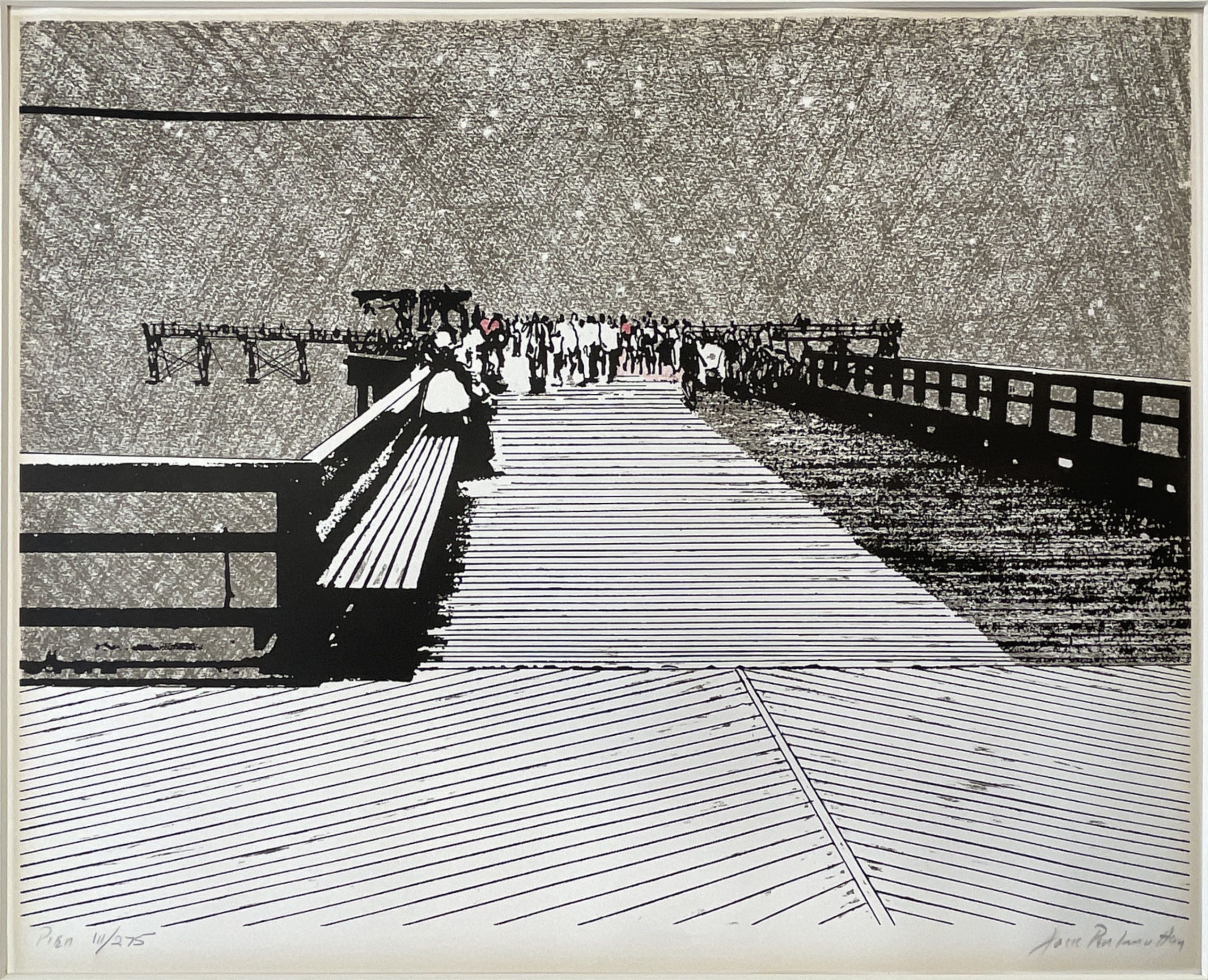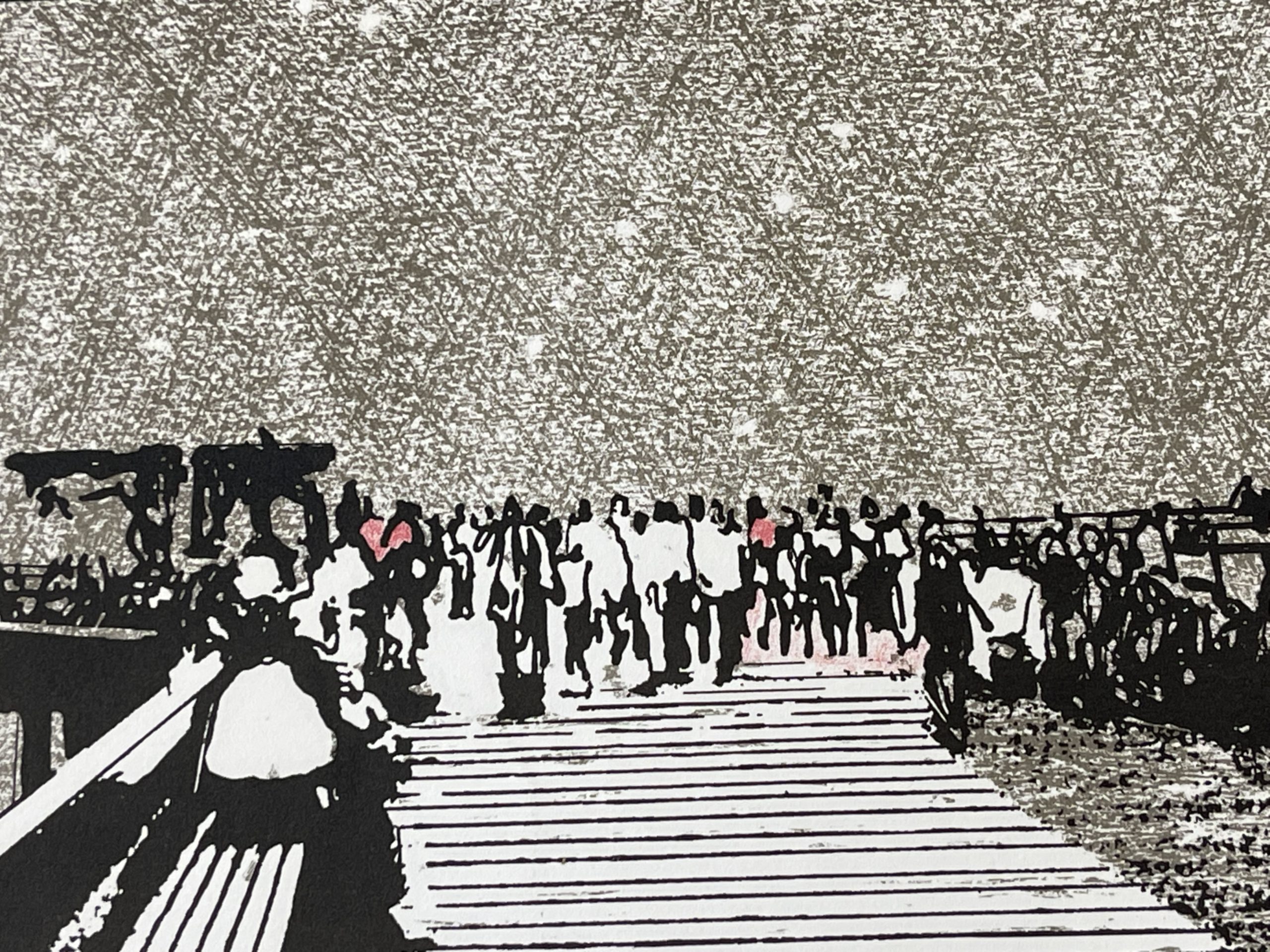 Jack Perlmutter’s dream-like image of a crowd gathered on a pier, inviting the obvious question: What brings these people there? This is a lithograph in two colors but it is embellished by what appears to be red pencil applied by hand. That color, too, is enigmatic. What is its purpose?