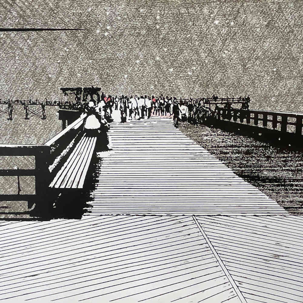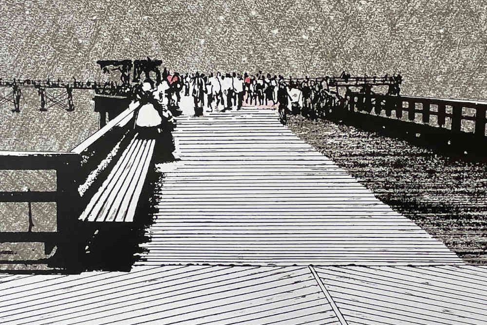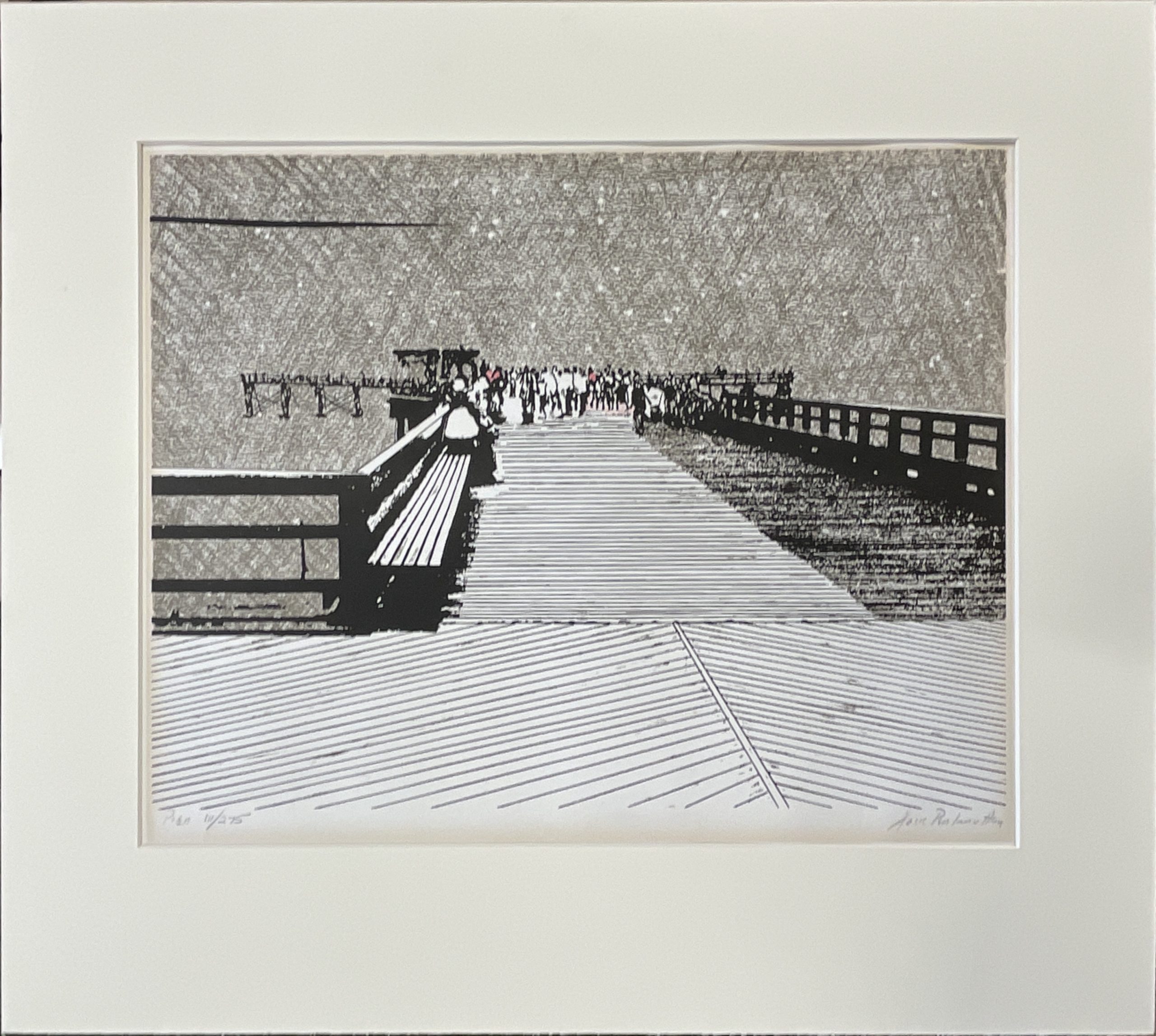 Jack Perlmutter’s dream-like image of a crowd gathered on a pier, inviting the obvious question: What brings these people there? This is a lithograph in two colors but it is embellished by what appears to be red pencil applied by hand. That color, too, is enigmatic. What is its purpose?