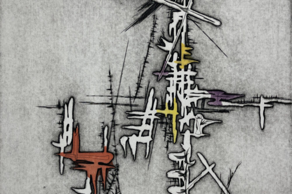 This is one of Gabor Peterdi’s masterpieces. Examples of this work are held in the collections of the Museum of Modern Art and the National Gallery of Art. It is a complex work—enormously interesting to view and interestingly created: Peterdi used etching for the background and engraving for the other elements, and placed the four colors by stenciling. This work very much reflects Peterdi’s learning at Atelier 17.