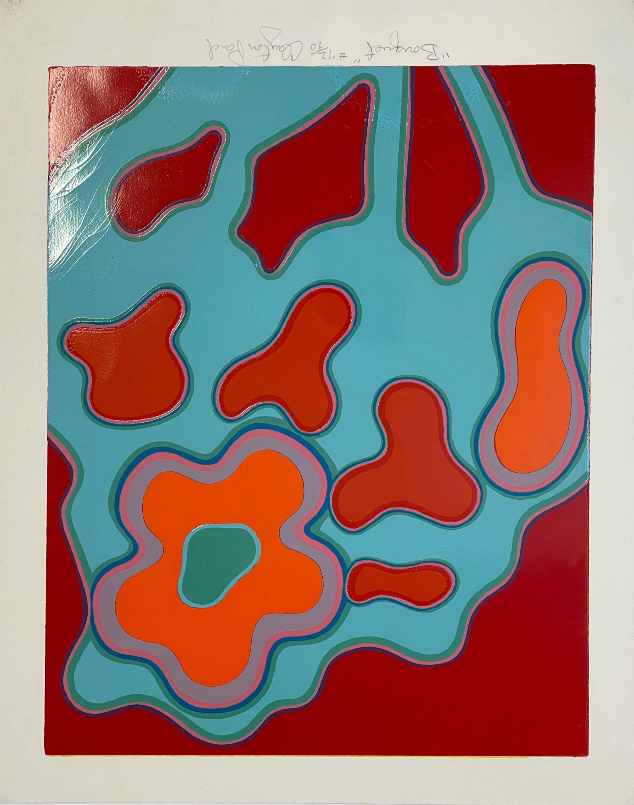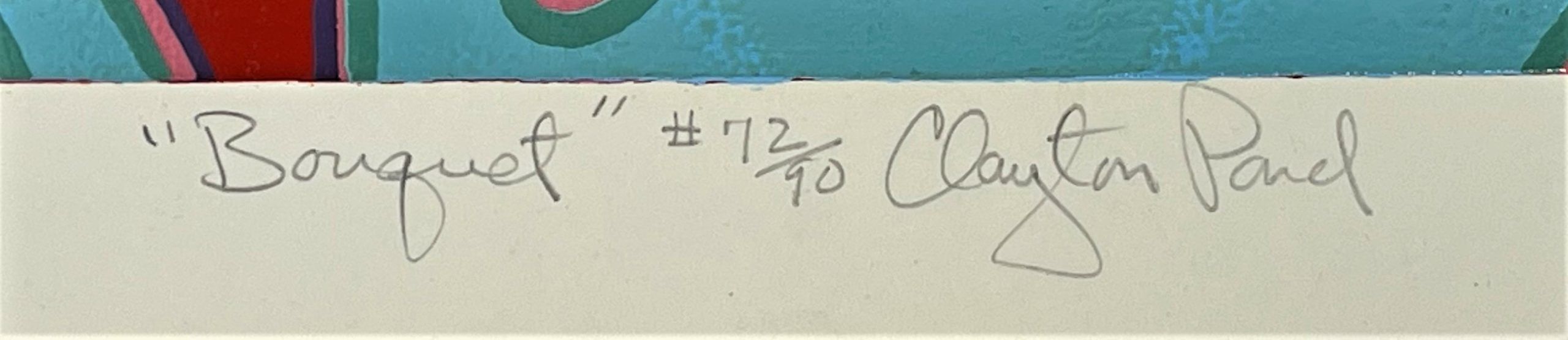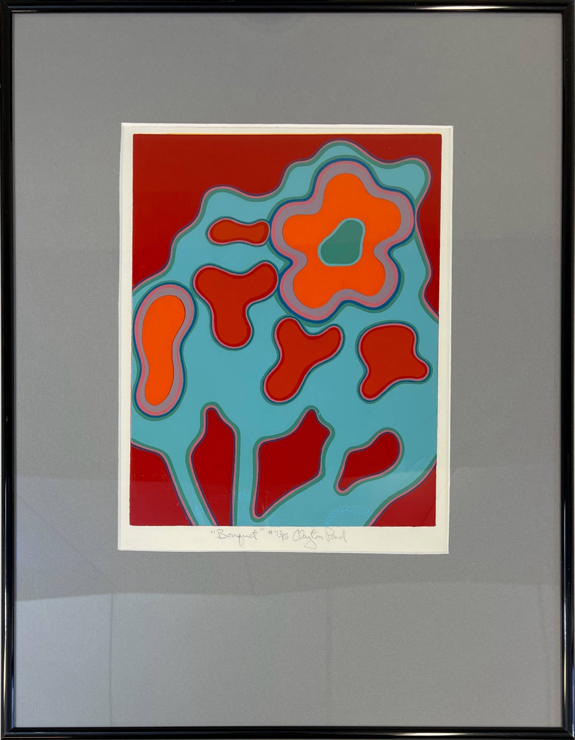 Clayton Pond is an extraordinary artist, whose rich imagination is surpassed only by the richness of the ink on his serigraphs. The inventor of an entirely new way of producing serigraphs (commonly referred to as “silkscreens”), he achieves an incomparable glossiness and luminosity.  This image was abstracted from the 1965 serigraph “Flower Shop”—a shop in a train station in Stockholm where the artist traveled during the summer of 1965. “Flower Shop” was the first print in which the artist originated his reductive method of stenciling, whereby he gradually reduced the openings in the same stencil for each subsequent color. Pond’s printing process gave his prints a tactile relief surface by printing each new color layered on top of the previous one.