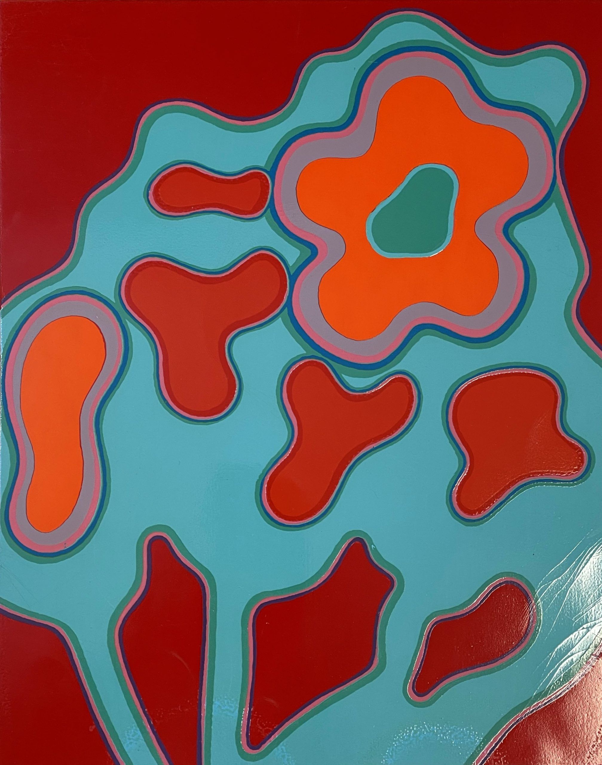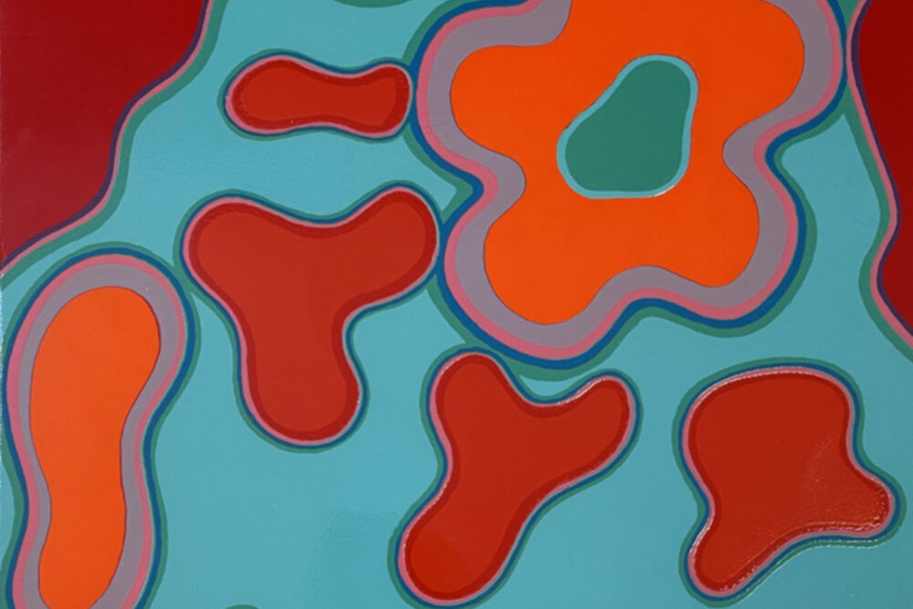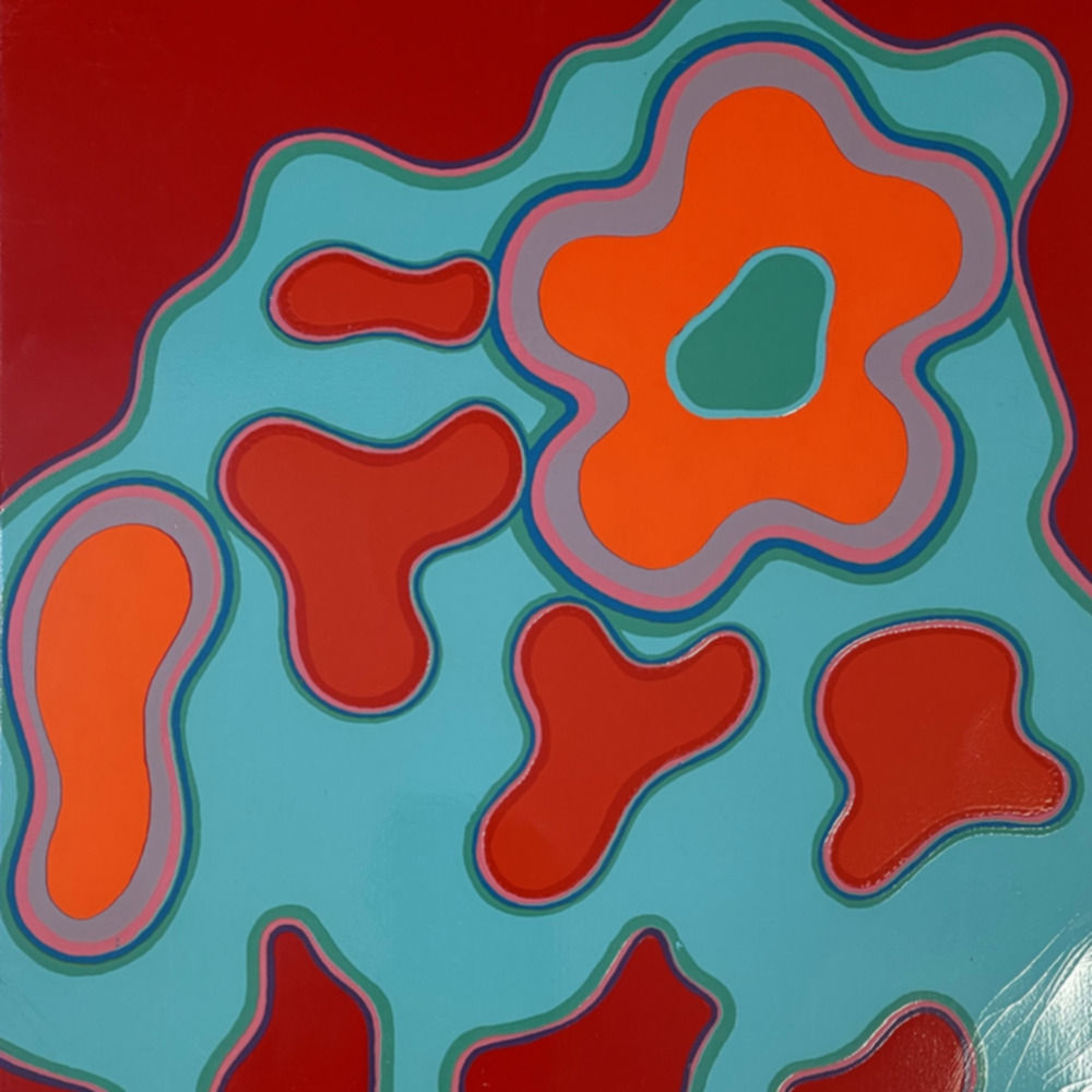 Clayton Pond is an extraordinary artist, whose rich imagination is surpassed only by the richness of the ink on his serigraphs. The inventor of an entirely new way of producing serigraphs (commonly referred to as “silkscreens”), he achieves an incomparable glossiness and luminosity.  This image was abstracted from the 1965 serigraph “Flower Shop”—a shop in a train station in Stockholm where the artist traveled during the summer of 1965. “Flower Shop” was the first print in which the artist originated his reductive method of stenciling, whereby he gradually reduced the openings in the same stencil for each subsequent color. Pond’s printing process gave his prints a tactile relief surface by printing each new color layered on top of the previous one.