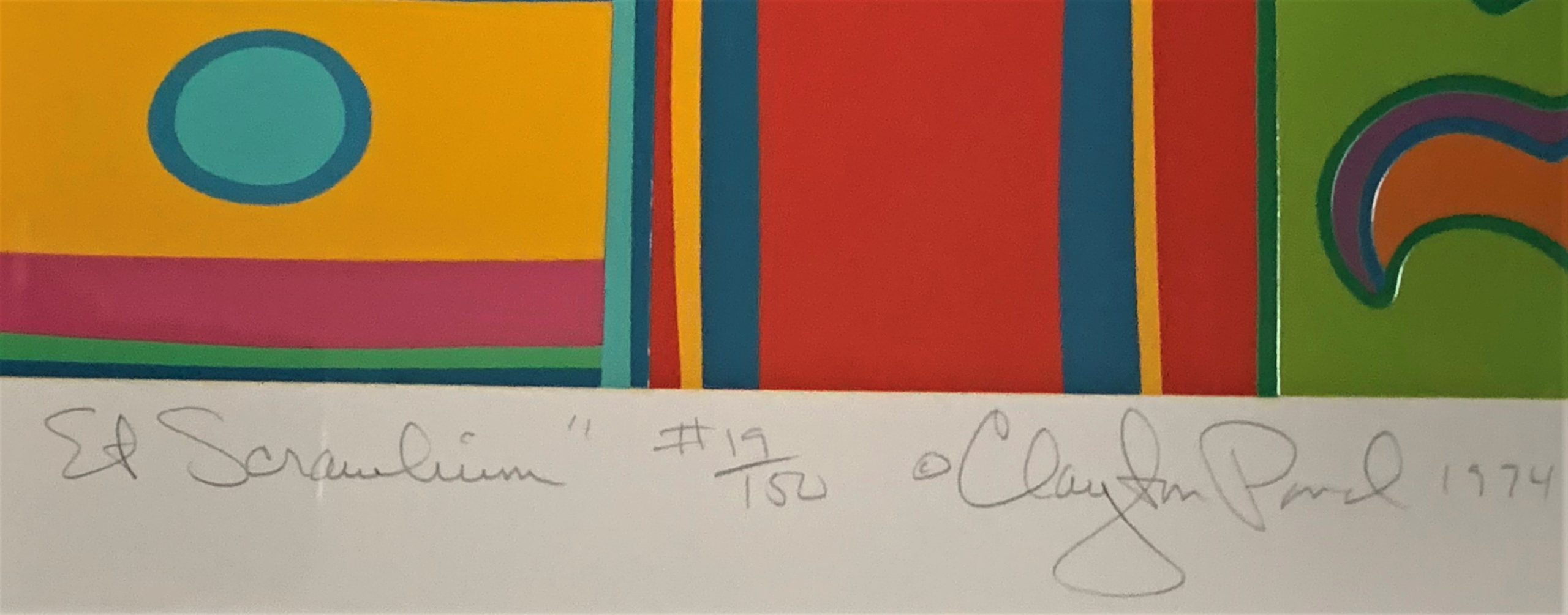 Clayton Pond’s “Capital Ideas” suite is a collection of seven serigraphs that Pond created during the spring, summer, and fall of 1974. Pond was one of the early artists to settle in the SoHo area of New York City, living in his Greene Street studio from 1969 to 1995. He watched as the area changed from a low-rent warehouse district to a dynamic center of the arts. What remained unchanged over those decades was the 100-year-old architecture of SoHo’s cast iron facades. Pond commemorated the beauty of the cast iron architectural details—enhancing them in his colorful way, of course. Every one of the images in the suite is from what Pond could see from the front windows and fire escape of his studio.