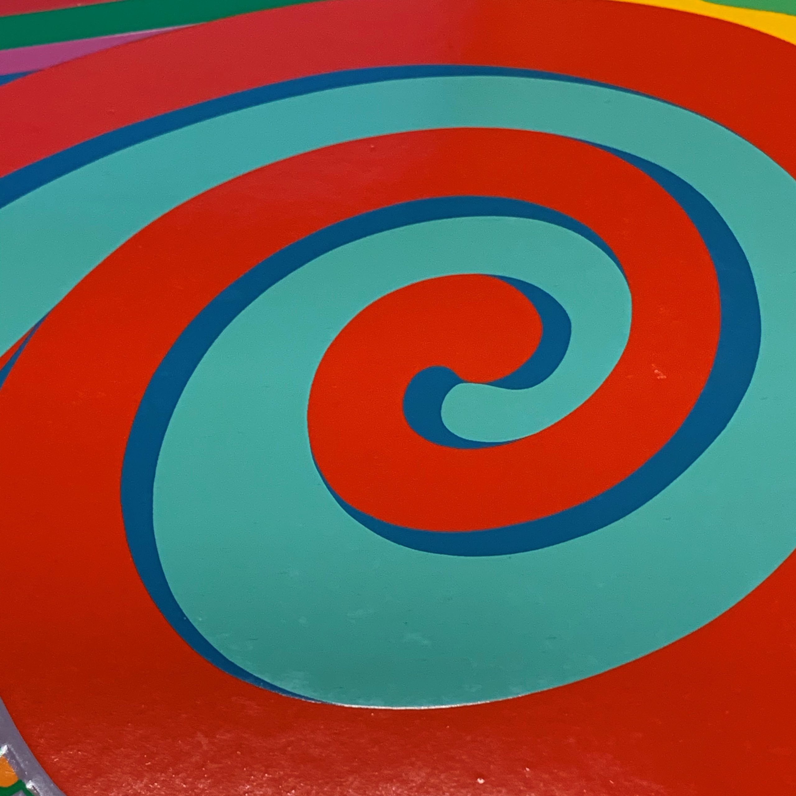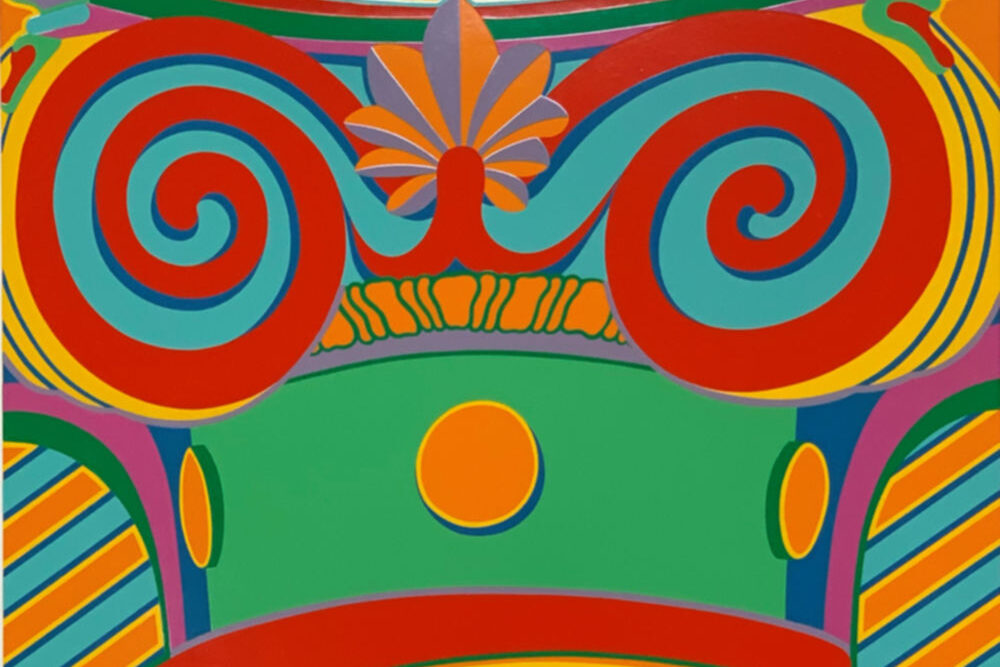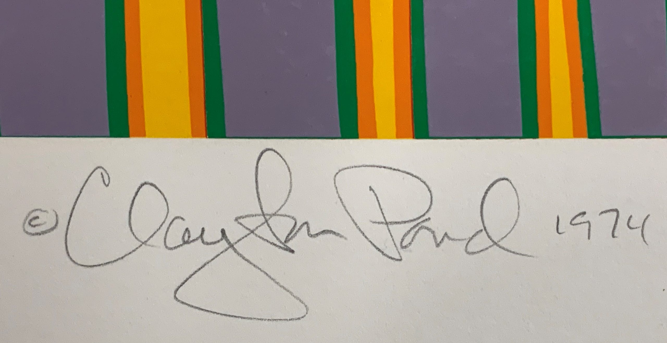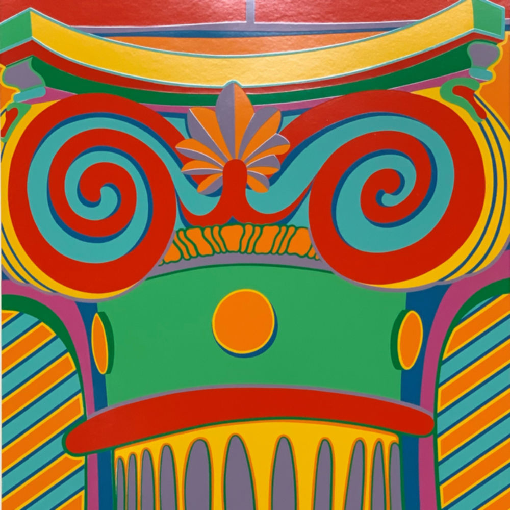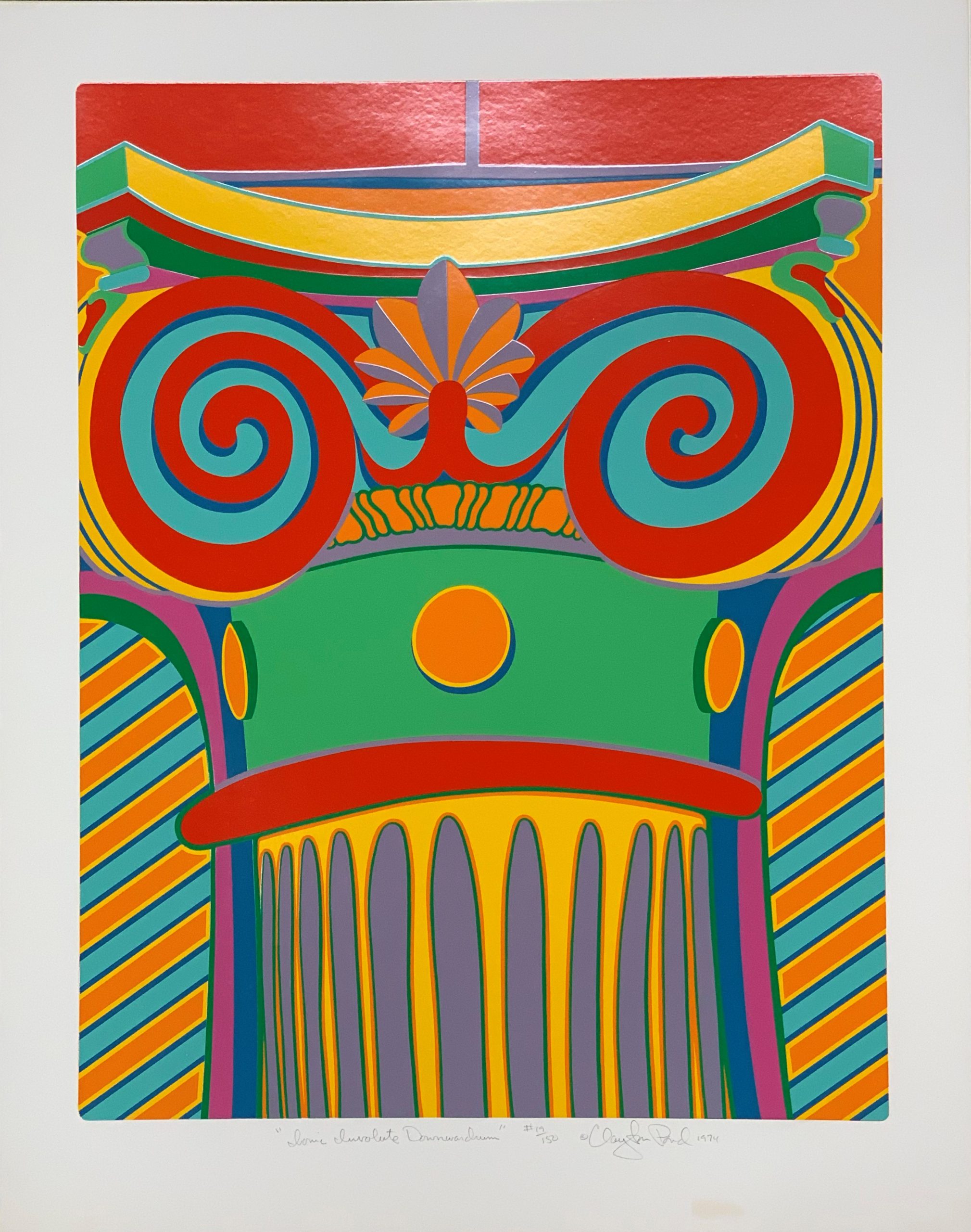 Clayton Pond’s “Capital Ideas” suite is a collection of seven serigraphs that Pond created during the spring, summer, and fall of 1974. Pond was one of the early artists to settle in the SoHo area of New York City, living in his Greene Street studio from 1969 to 1995. He watched as the area changed from a low-rent warehouse district to a dynamic center of the arts. What remained unchanged over those decades was the 100-year-old architecture of SoHo’s cast iron facades. Pond commemorated the beauty of the cast iron architectural details—enhancing them in his colorful way, of course. Every one of the images in the suite is from what Pond could see from the front windows and fire escape of his studio.