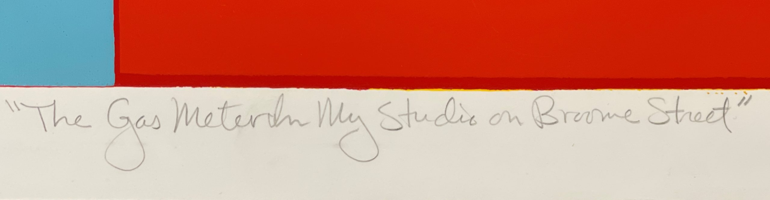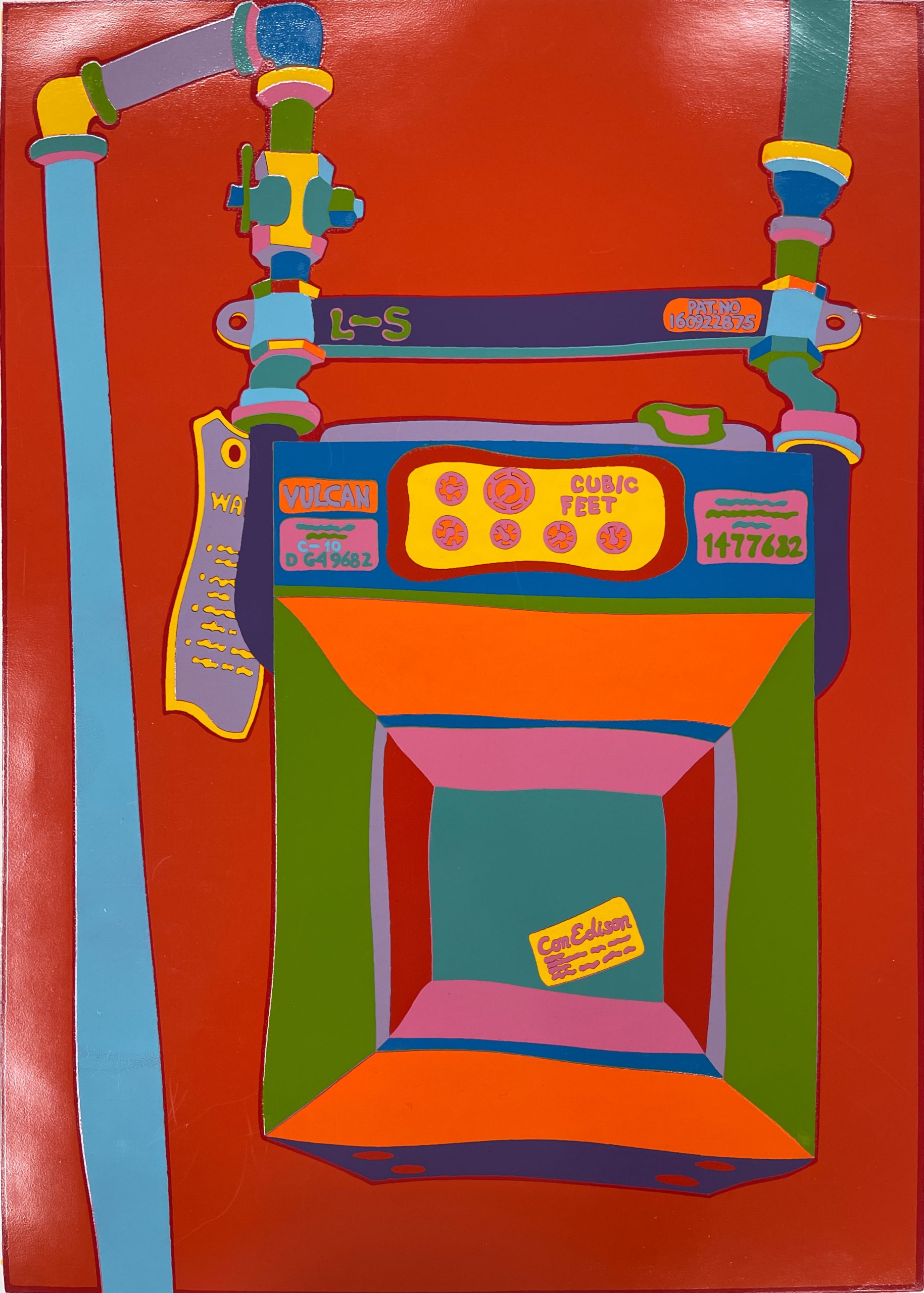 As a second-generation Pop artist, Pond uses a great deal of high-energy color, often outlining his objects in contrasting colors.  He is interested in recording the obsessions and possessions of Americans.  His early prints were close-up depictions of domestic objects such as toasters, telephones, and toilet seats, and, in this case, the gas meter in his apartment.  As Pond put it, “This print of a gas meter exemplifies the artist’s interest in monumentalizing every day man-made objects.”