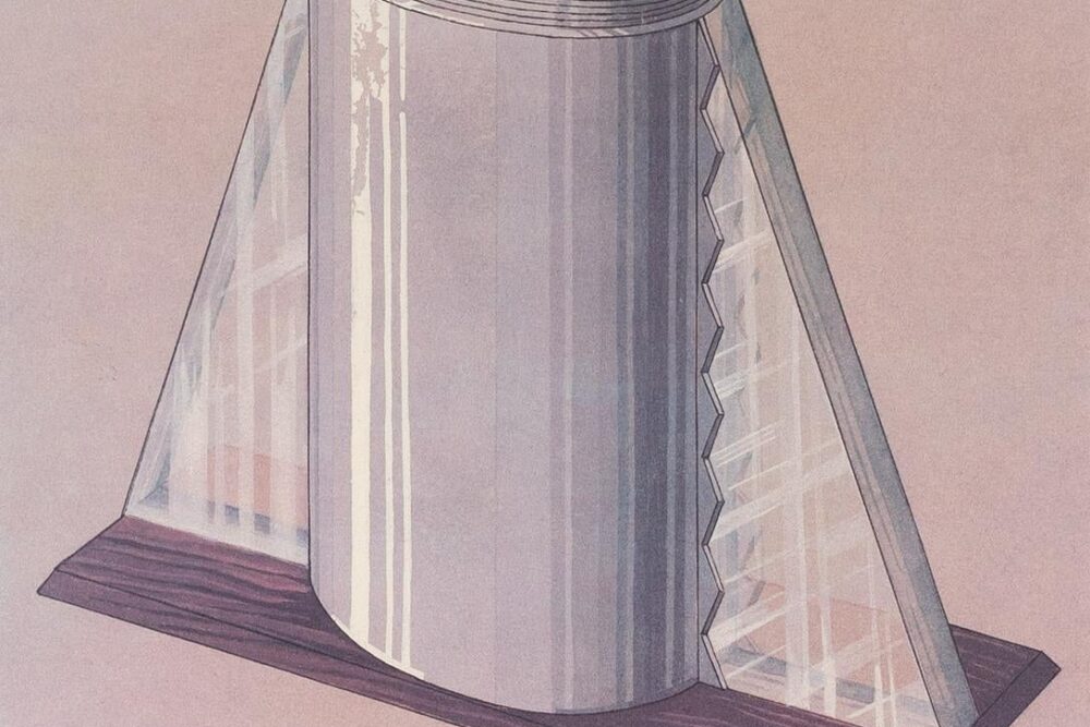 This screenprint shows a Puiforcat study for a sports trophy of his design.  The trophy, for which Puiforcat was given a special commission, consisted of a sterling cylinder on a rectangular base made of Brazilian rosewood.  The glass wing-shaped handles are fastened to the cup by means of a serrated pattern in silver.  The trophy was designed and built in about 1936.  It speaks to the Art Deco motif which influenced most of Puiforcat’s work but it also has an industrial edge to it.