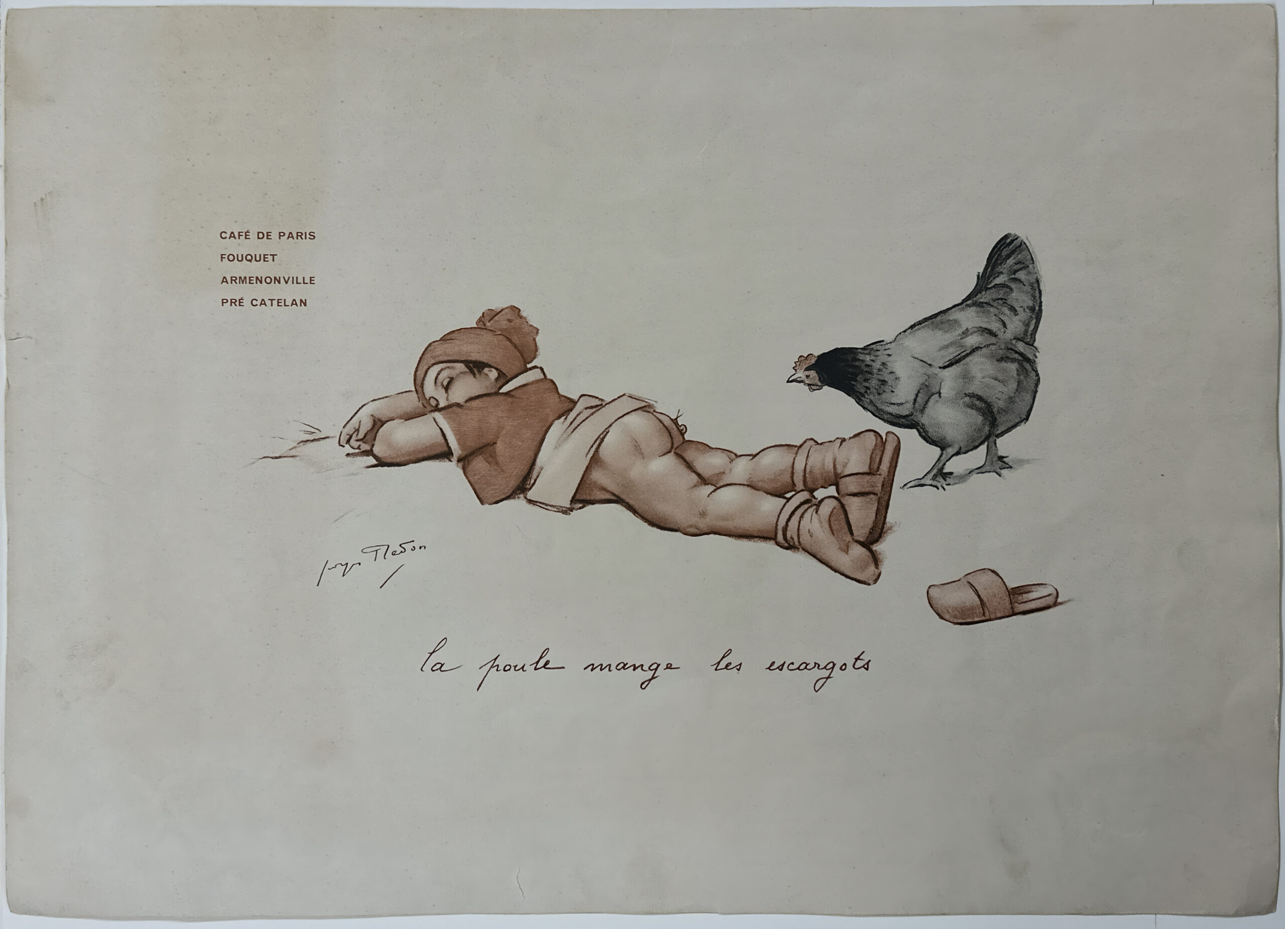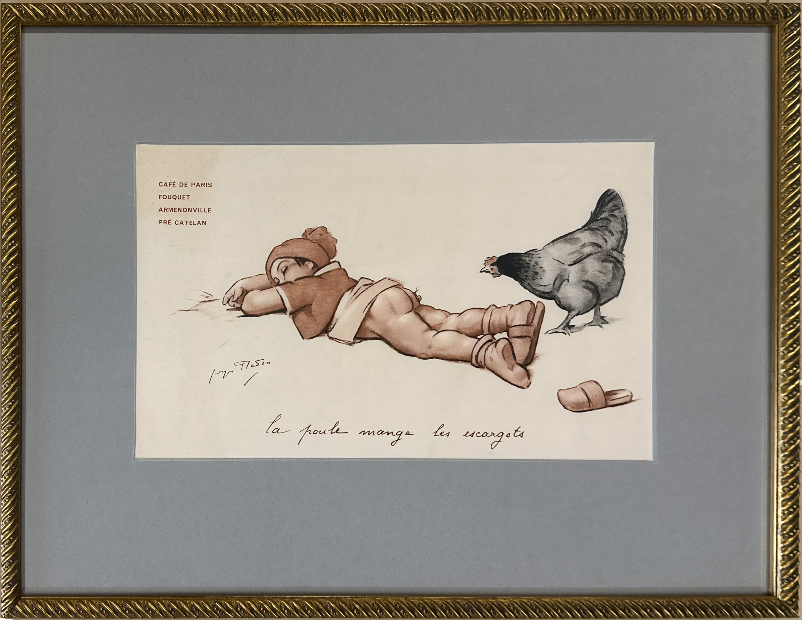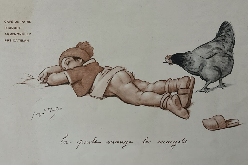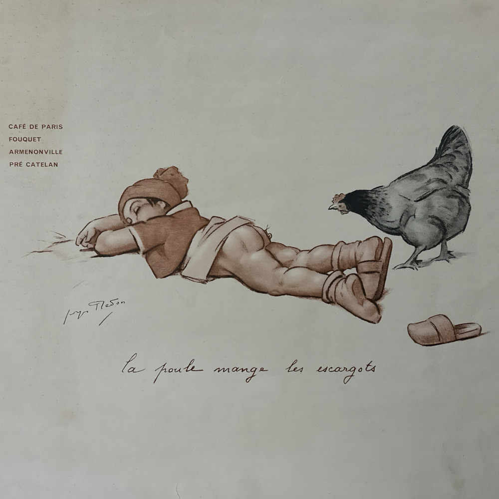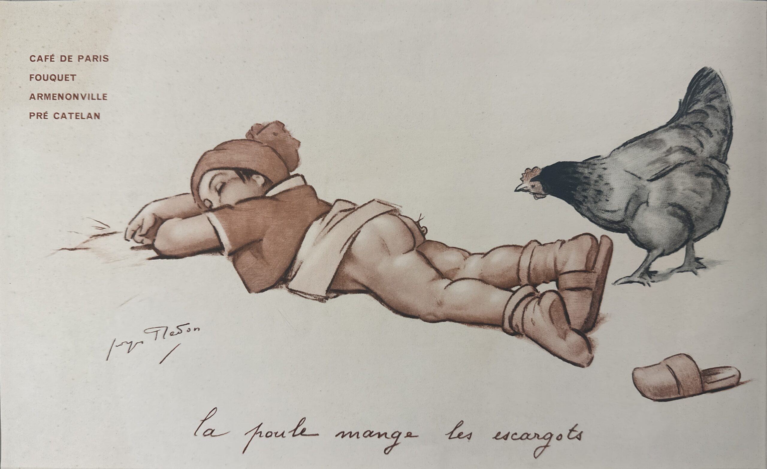 The text to the lower margin reads “la poule mange les escargots” [“The Hen Eats the Snails”].