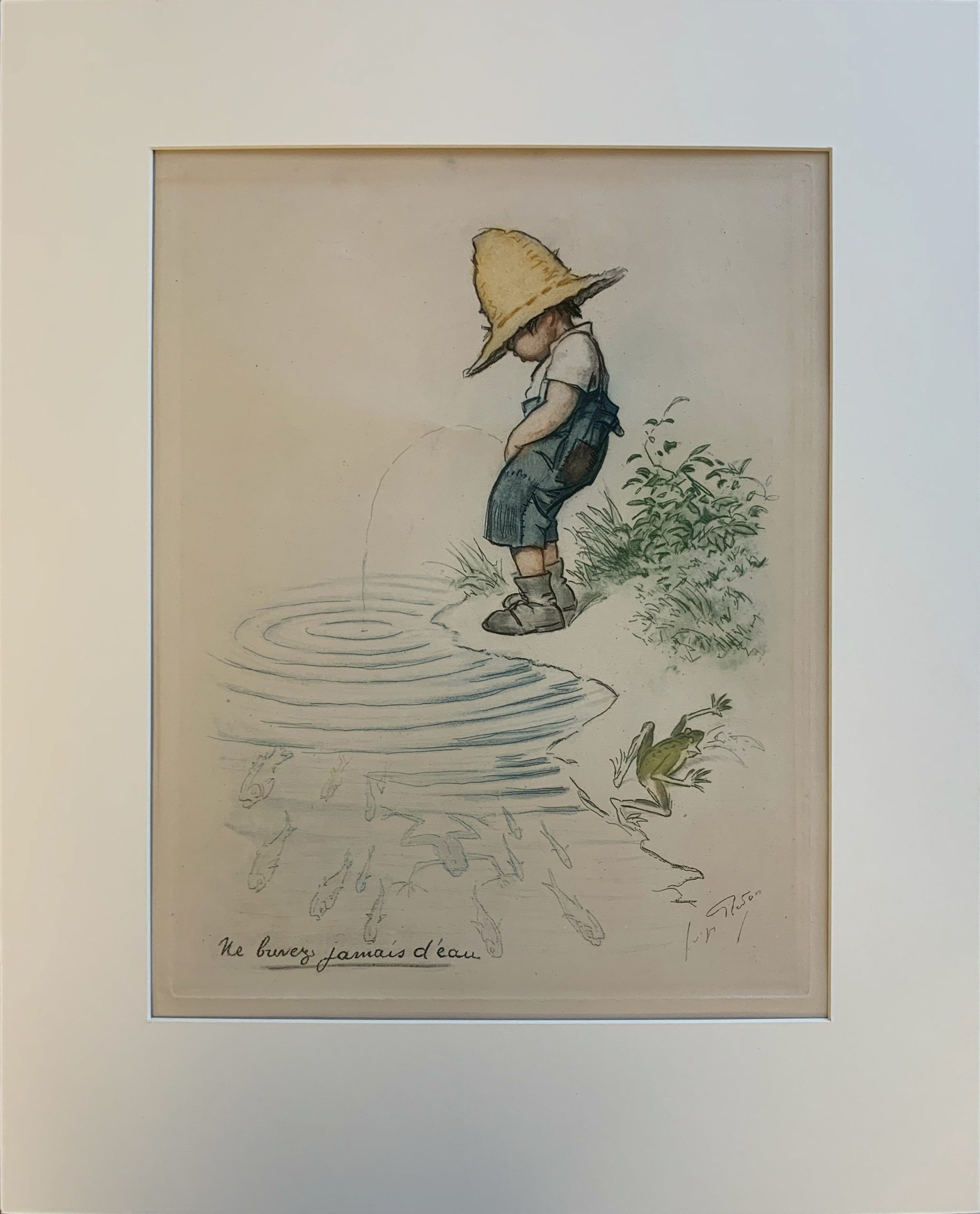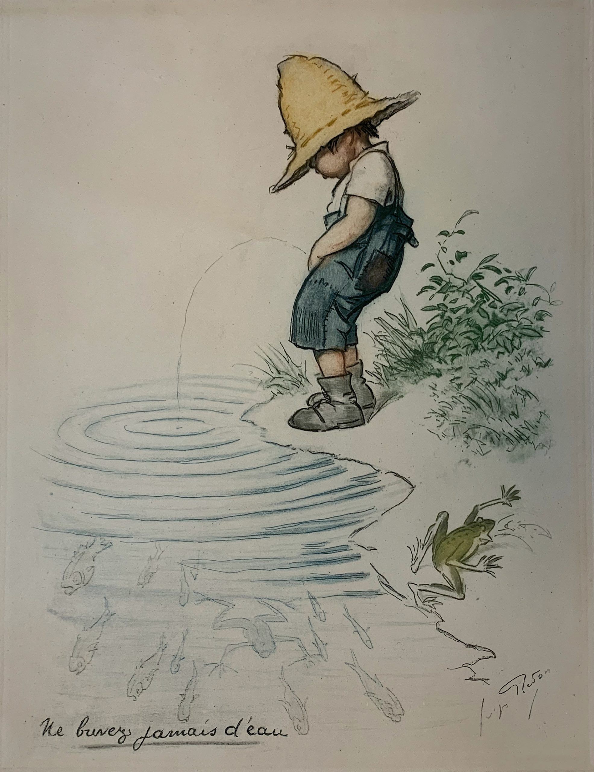 The text to the lower margin reads “Ne buvez jamais d’eau” [“Never drink the water”].