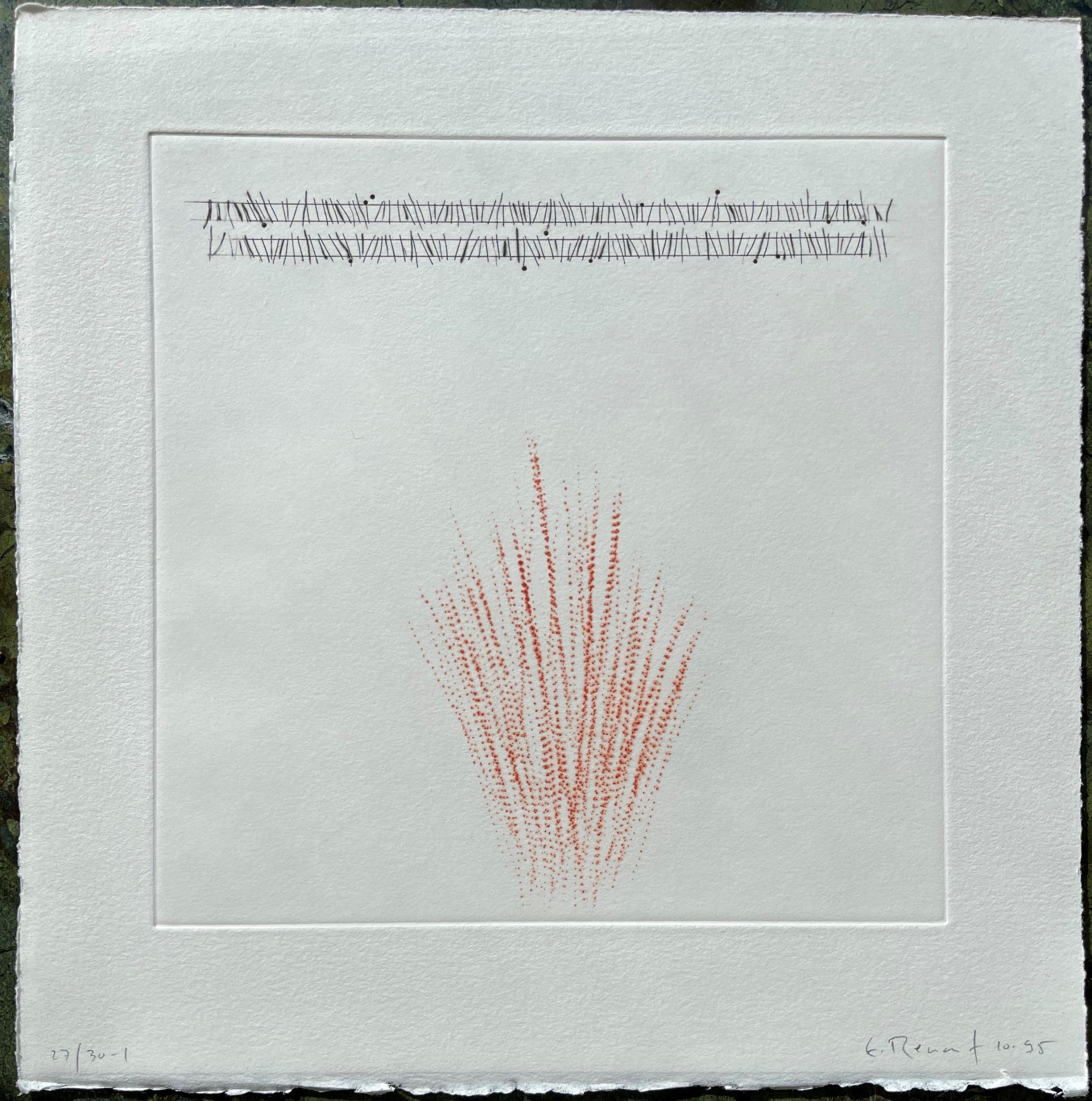 This work was printed by Marc Leclercq at Atelier Tanguy Garric, Paris. In addition to the edition of 30, there were printed 5 Artist’s Proofs, 1 trial proof, and 1 copy reserved for the Bibliotheque Nationale.