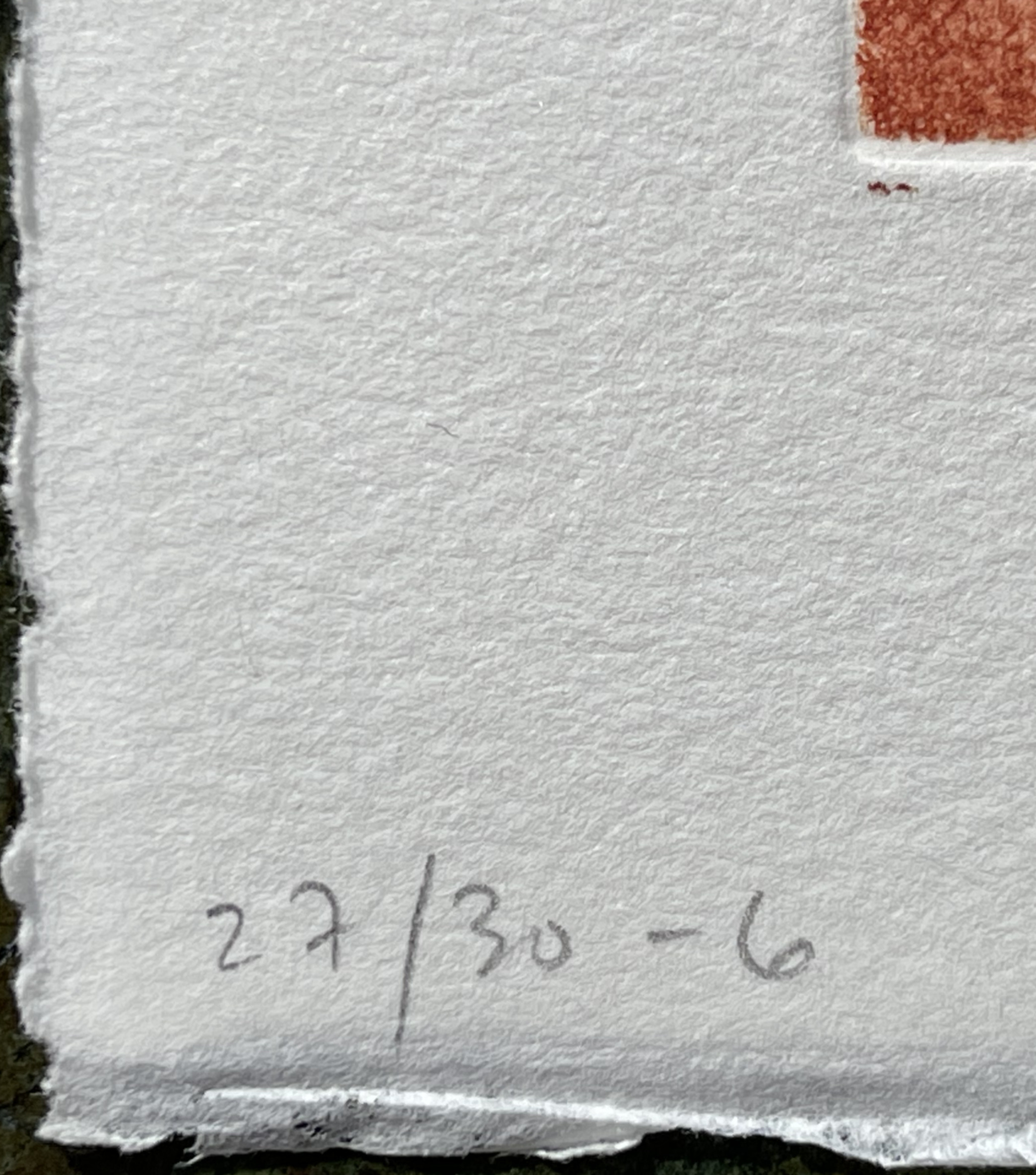 This work was printed by Marc Leclercq at Atelier Tanguy Garric, Paris. In addition to the edition of 30, there were printed 5 Artist’s Proofs, 1 trial proof, and 1 copy reserved for the Bibliotheque Nationale.