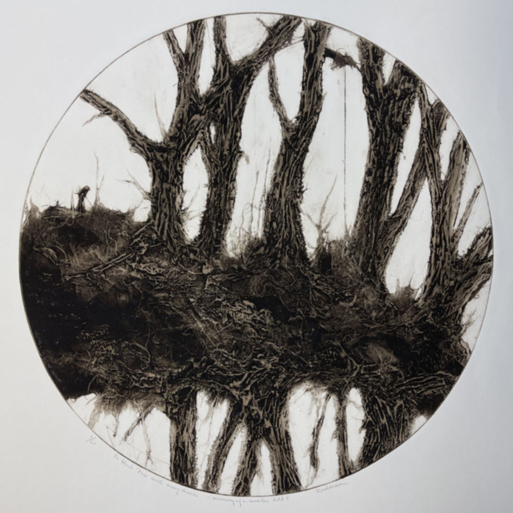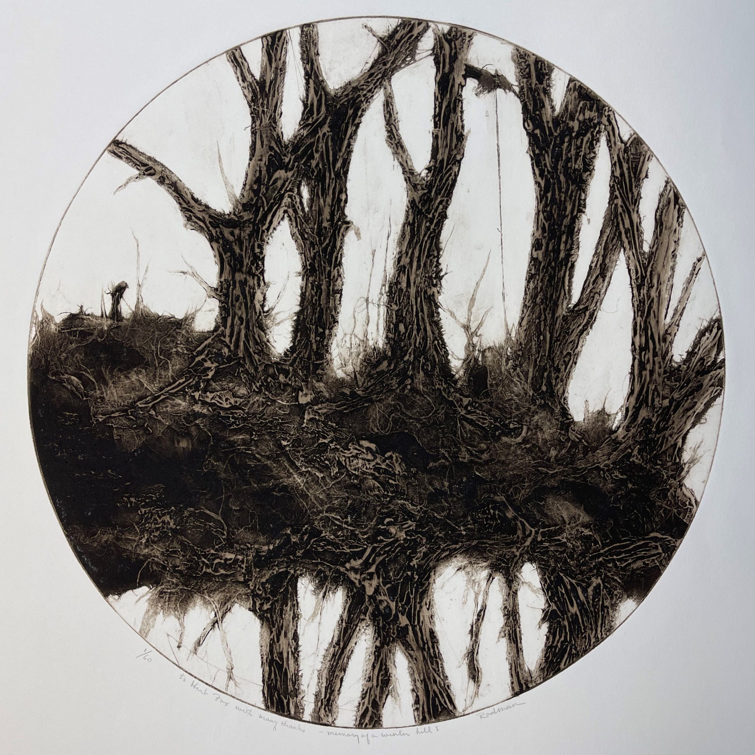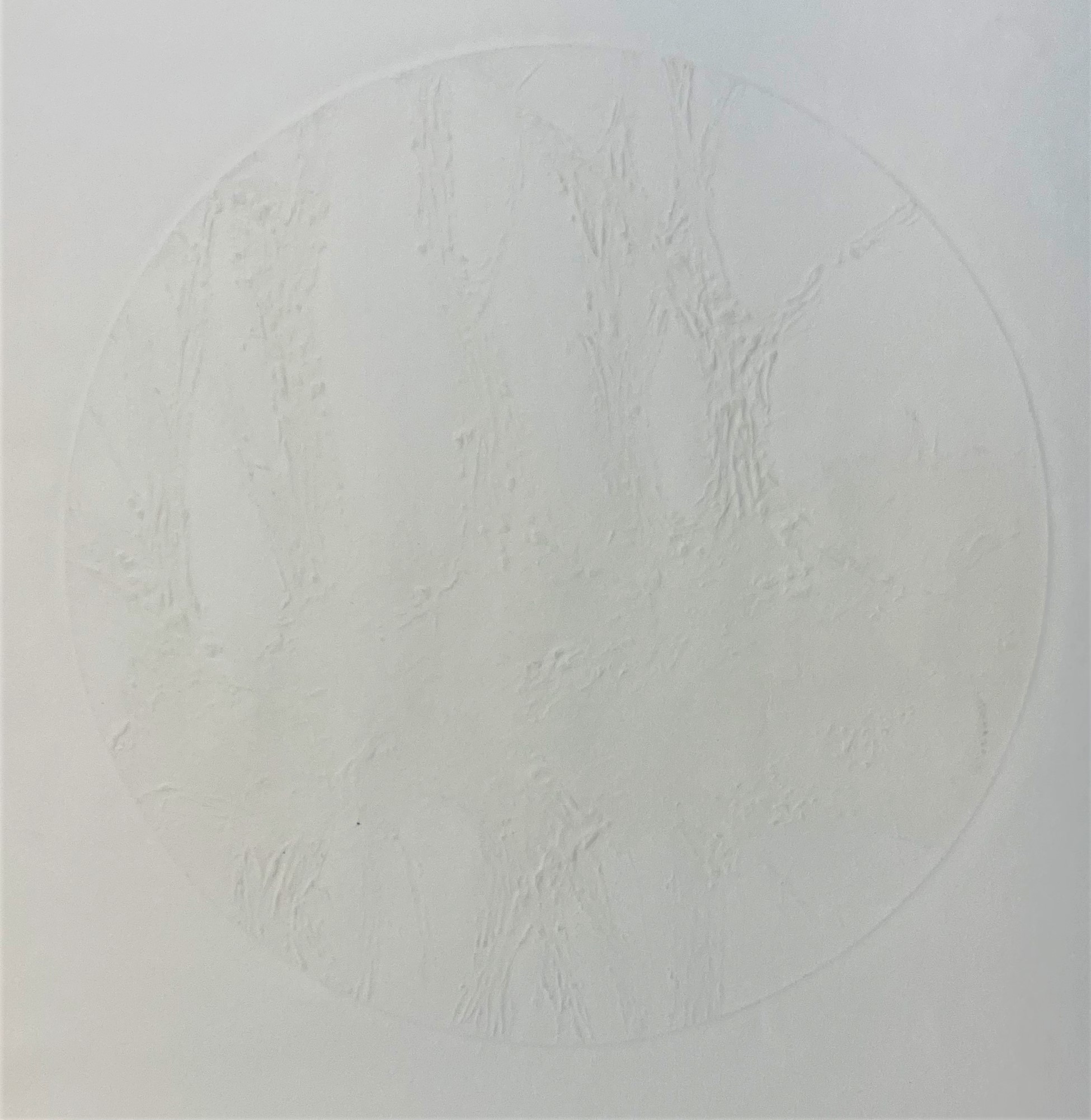 A moody, rich, and evocative view—through a porthole as if in a memory—of trees on a hill. Deeply, deeply embossed in the paper, beautifully inked, and finely detailed.