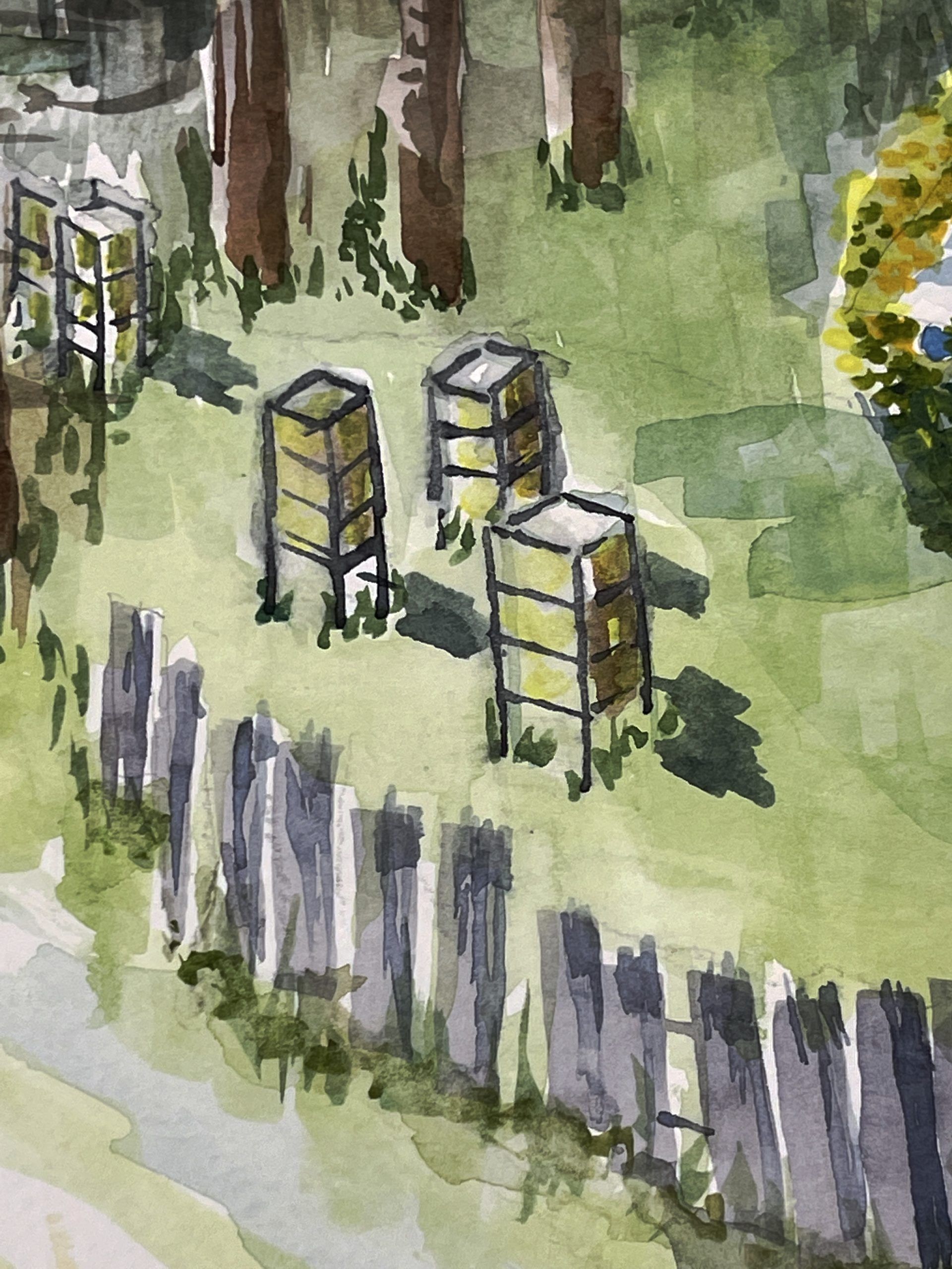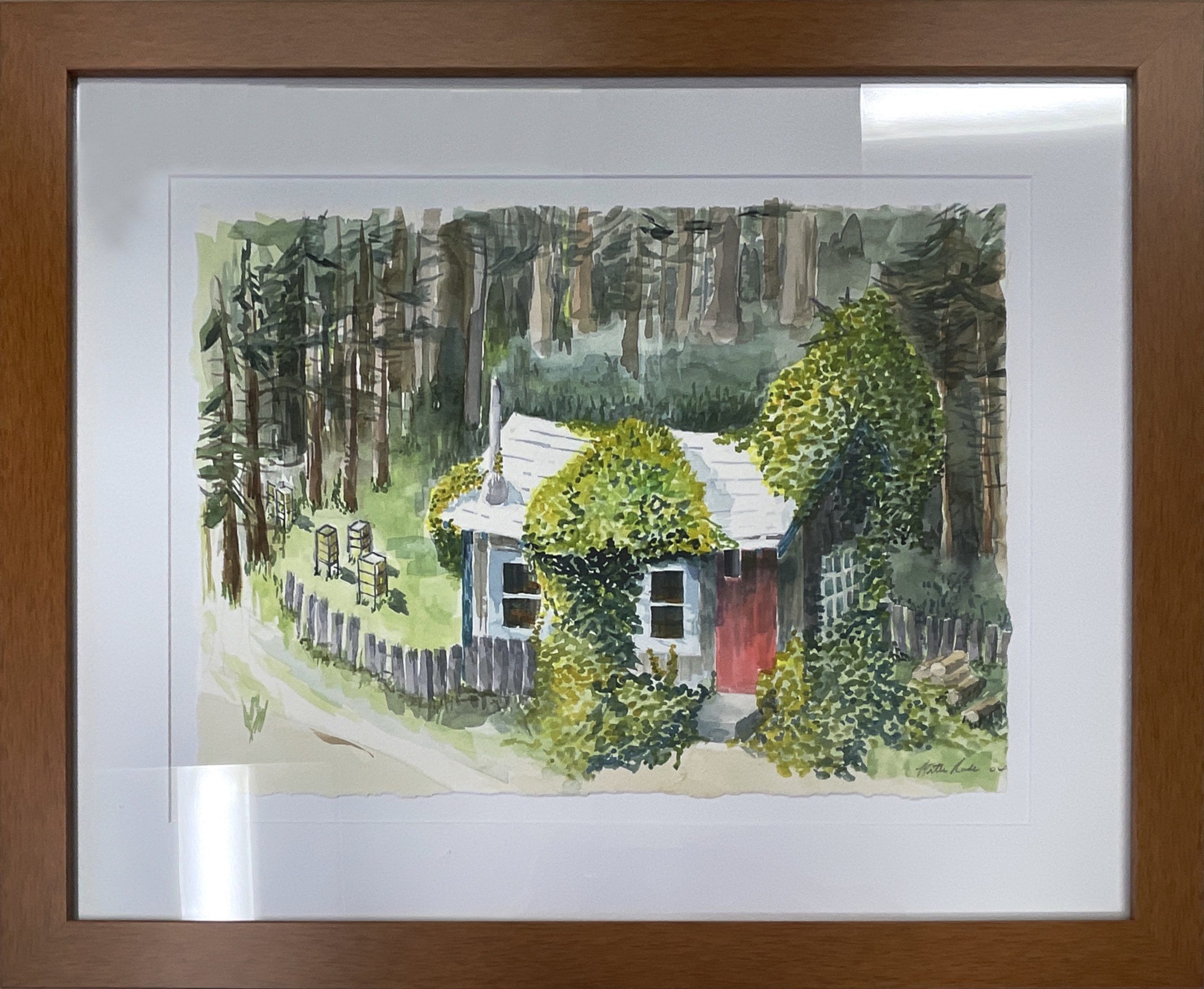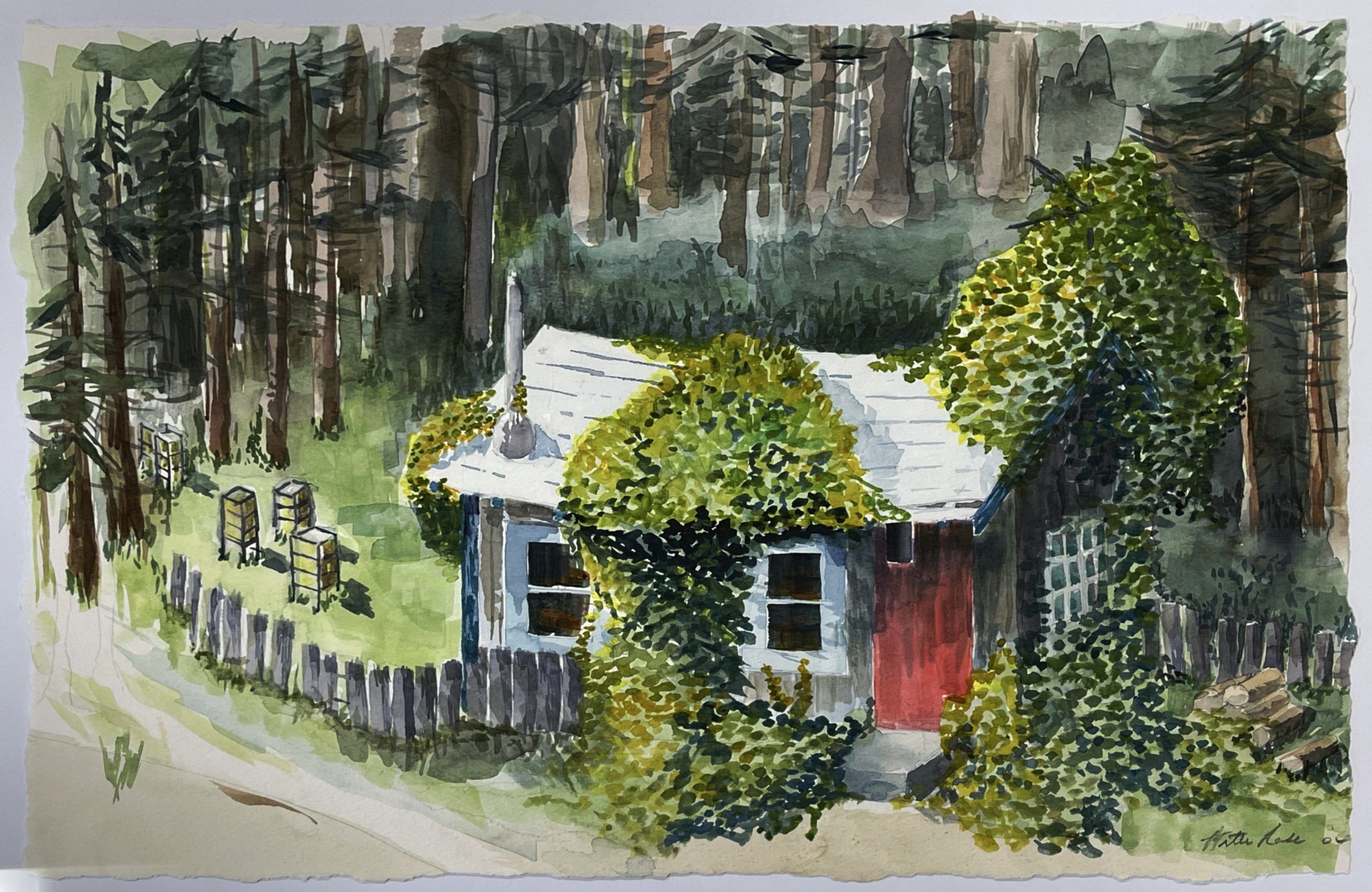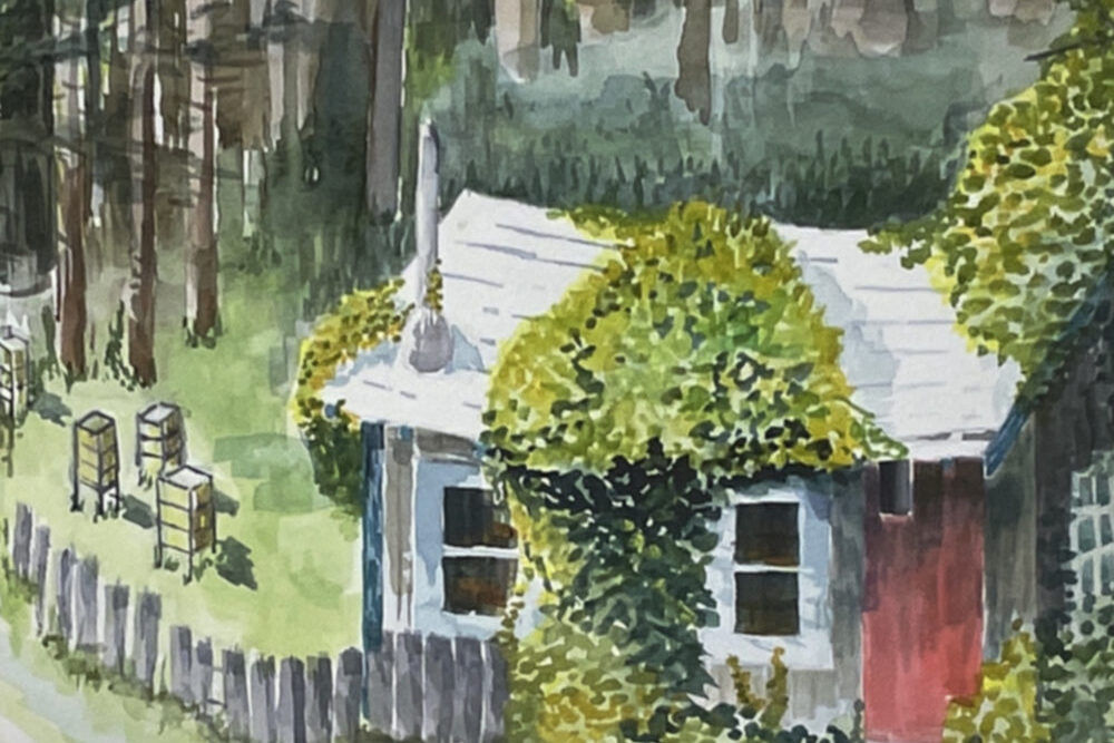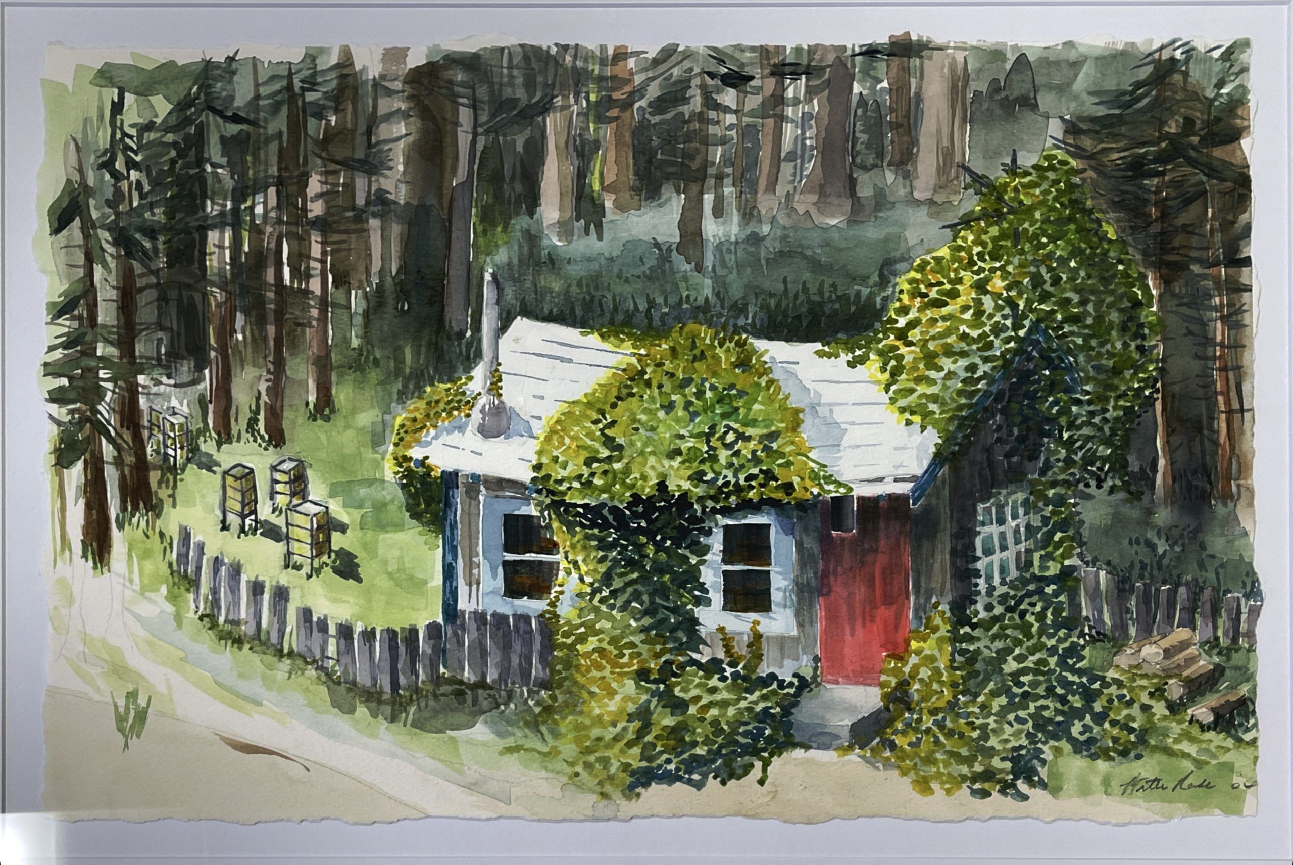 Bette Ross’ lovely image of a quiet home at the edge of the woods with a small apiary in the side garden.