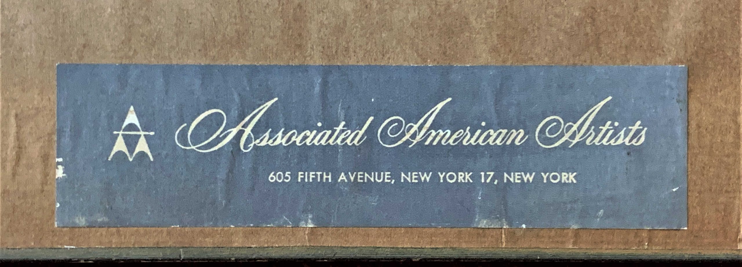 Mounted by the publisher on a larger support sheet of Arches paper.  Originally framed by Associated American Artists for exhibition.  Reframed in its fine wood frame from the AAA exhibition behind 99% UV-filtering Plexiglass with a linen-wrapped mat.