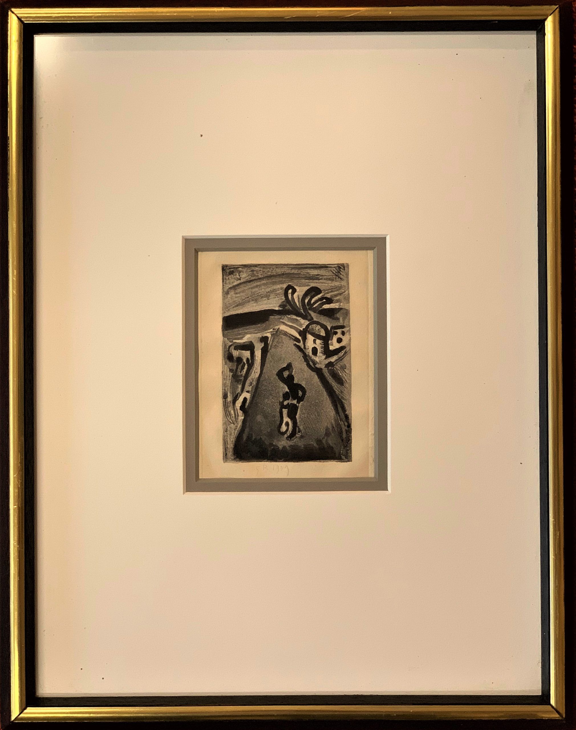 French artist Georges Rouault was a pioneering expressionist painter and a major figure in modern printmaking. His work is immediately recognizable for the thick black brushstrokes that outline their subjects. But rather than create pleasing “armchair” pictures like those of many of his contemporaries, Rouault applied his dramatic and intense painterly style to religious subjects, clowns, and circus performers, using these motifs to reflect on religion, morality, and modern life. The theme of the circus was a major theme in Rouault’s work; he was fascinated by the contrast between the circus’ superficial brightness and the sadness of circus life. This portfolio reflected Rouault’s attempt to strip away the “spangles” of the clown’s costume and reveal the “reflection of paradise lost.”