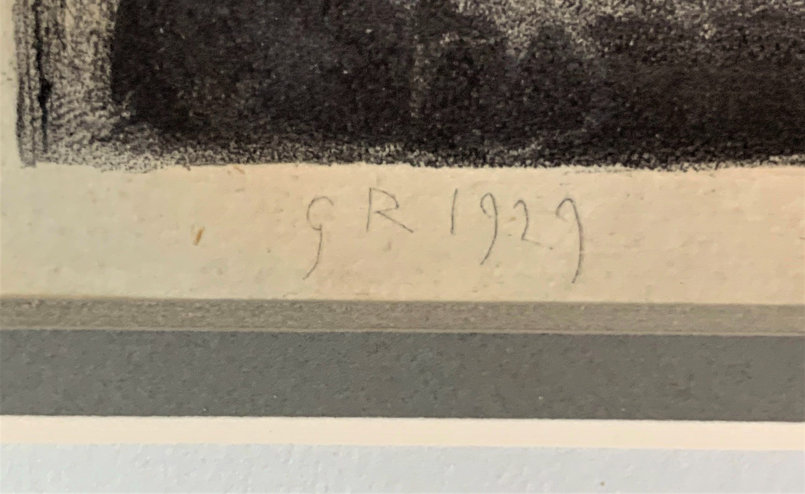 Rouault began working on the Reincarnations of Père Ubu in 1918; he returned to the plate and produced the final version in 1928. It was not published until 1932, though, when an edition of 225 pencil-signed impressions was made along with 305 portfolios for Reincarnations de Père Ubu containing suites of the etchings on Arches and Rives papers. This example, however, was from an edition of 210 from reduced format plates published by Antoine Vollard in 1955 on fine Vélin paper. 110 sets of the 1955 edition were numbered in Arabic numerals for the Société Normande des Amis du Livre and 100 sets were numbered in Roman numerals. This example, though, lacks numbering, which might put it in the group of sixty additional sets which were issued on colored or tinted paper.