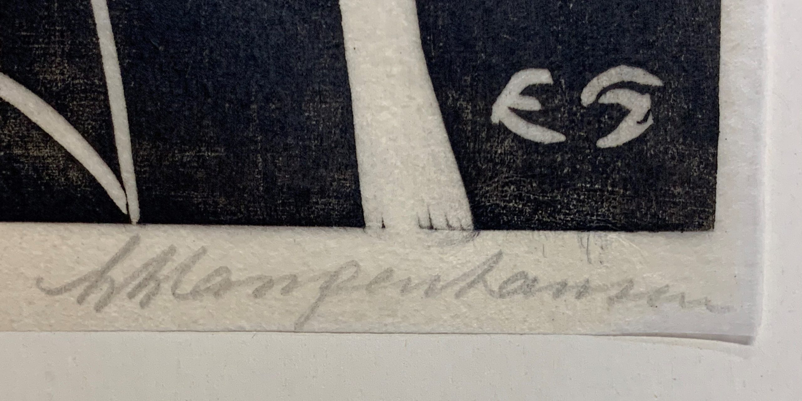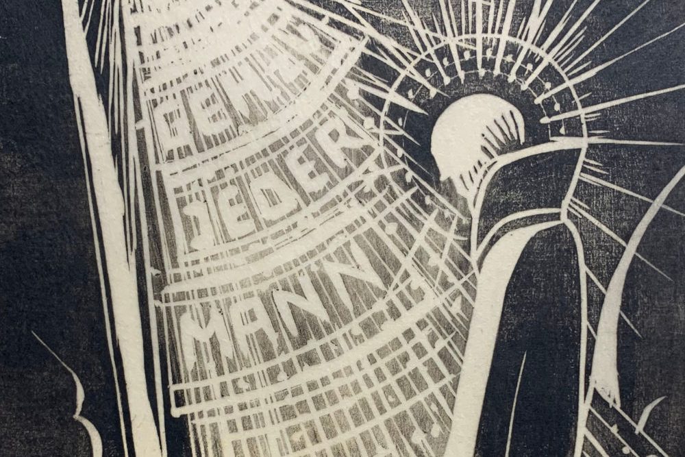 In 1931, Emma Schlangenhausen made a series of twelve woodcuts illustrating Jedermann. This picture is the second in the series, depicting God instructing Death to, “Go to Everyman”. It is dramatic and powerful, and a superb demonstration of Jedermann’s extraordinary ability to evoke emotion from a woodcut. It is interesting, too, in its depiction of Death not as a terrible creature but as a beautiful being, with a halo proving his holiness.