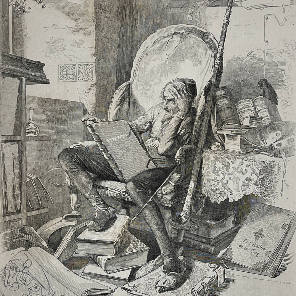 This 1843 etching by the great master Adolf Schrödter illustrates the scene in which Don Quixote reads Amadis of Gaul.  Don Quixote has decided to imitate the penance suffered by his hero, Amadis of Gaul, so he writes verses to his beloved Lady Dulcinea and does a great deal of lamenting and sighing.