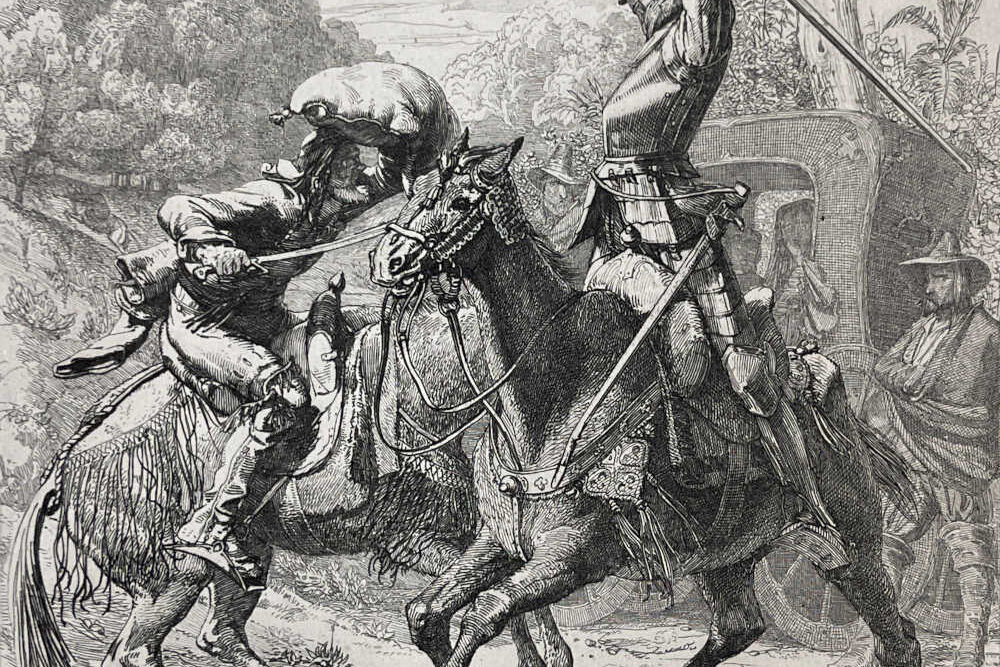 After his great battle with the windmills (the subject of another etching by Schrödter), Don Quixote and Pancho return to the road where they come across a pair of friars and a coach. Don Quixote declaims the friars as devils and demands that they release the highborn princesses whom he supposes are in the nearby traveling coach. Though the friars protest that they are but two brothers of St. Benedict and that they have nothing to do with the coach, Don Quixote charges them, knocking one of the friars to the ground and sending the other flying away. Don Quixote, having bravely vanquished his fierce foes, then goes to the carriage to free the kidnapped princesses. As reward for freeing them, he asks them to go to the Lady Dulcinea and report to her that they were freed by the noble Don Quixote.