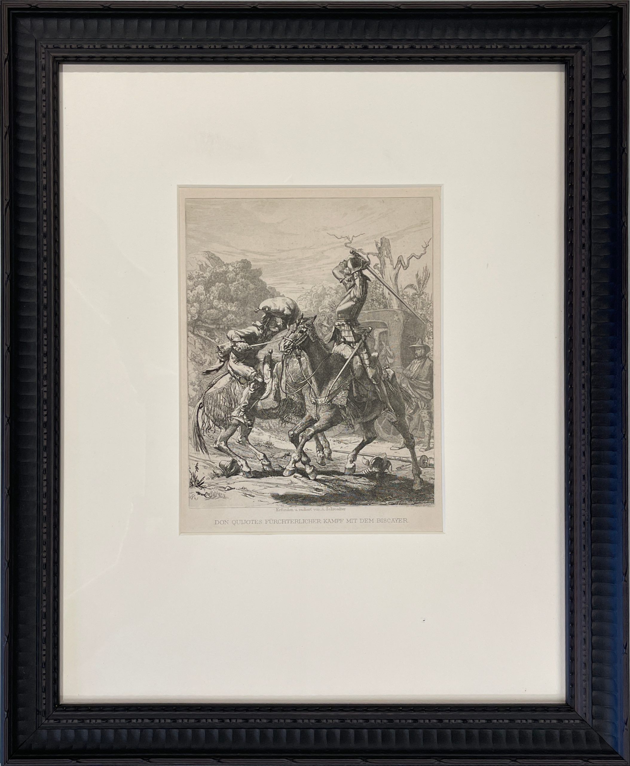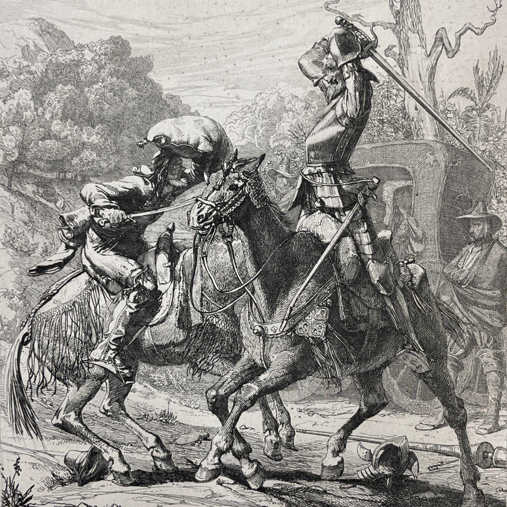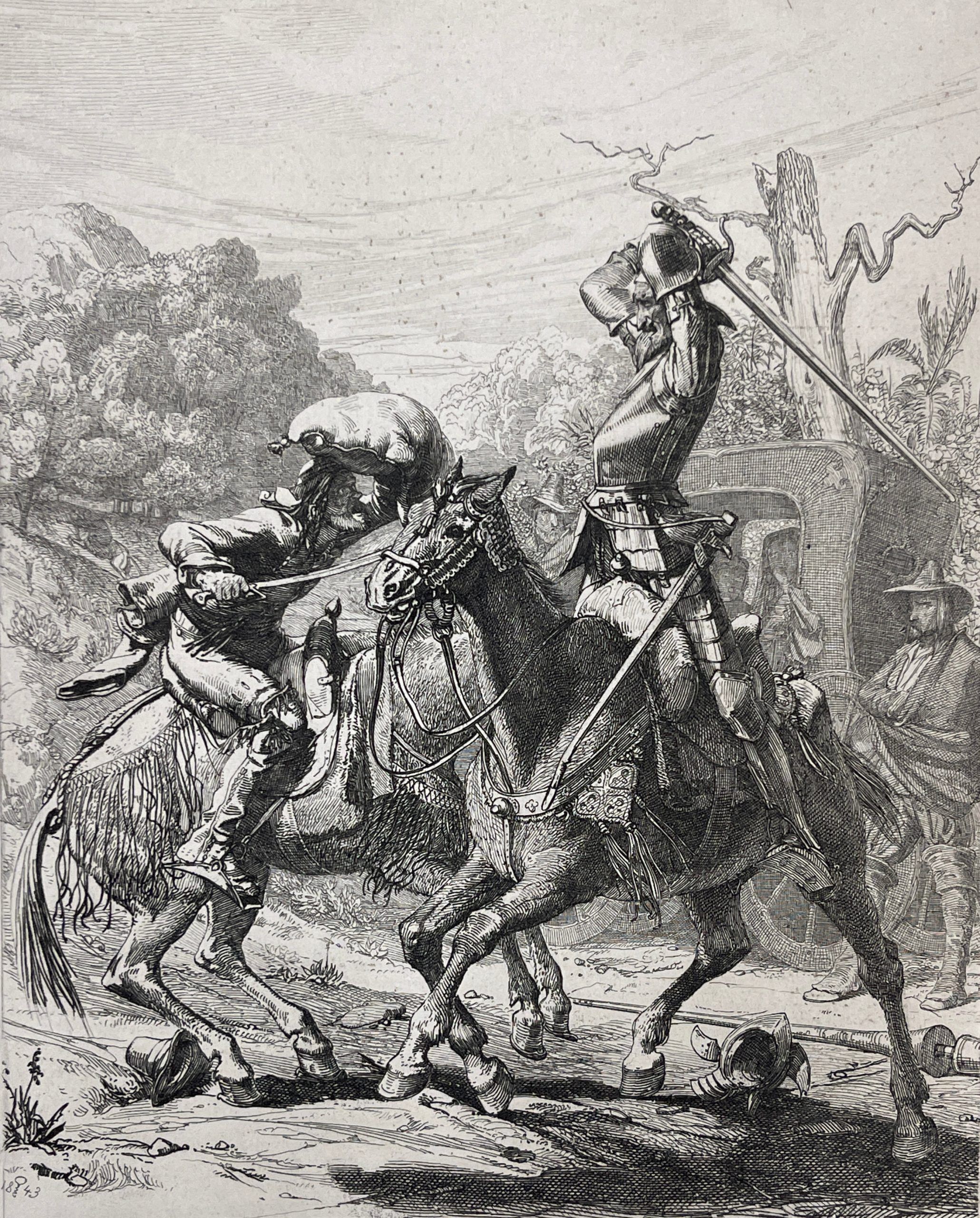This 1843 etching by the great master Adolf Schrödter illustrates the scene in which Don Quixote battles with the Biscayan.