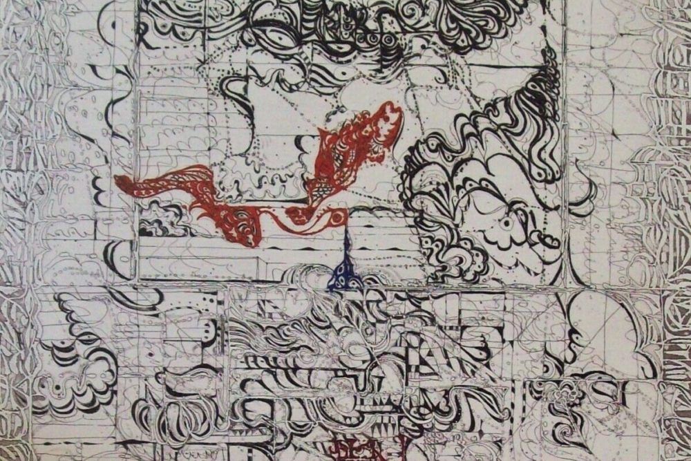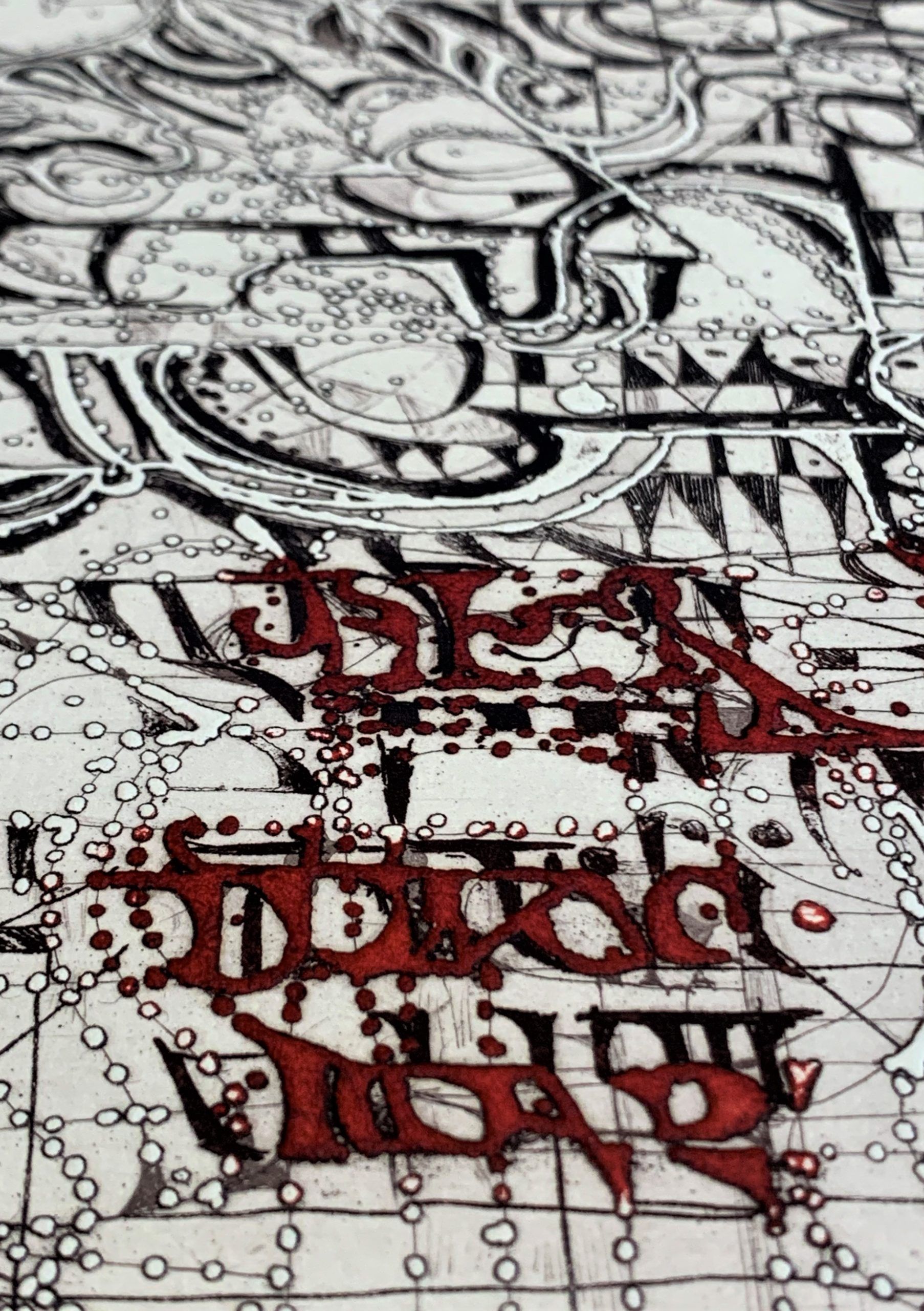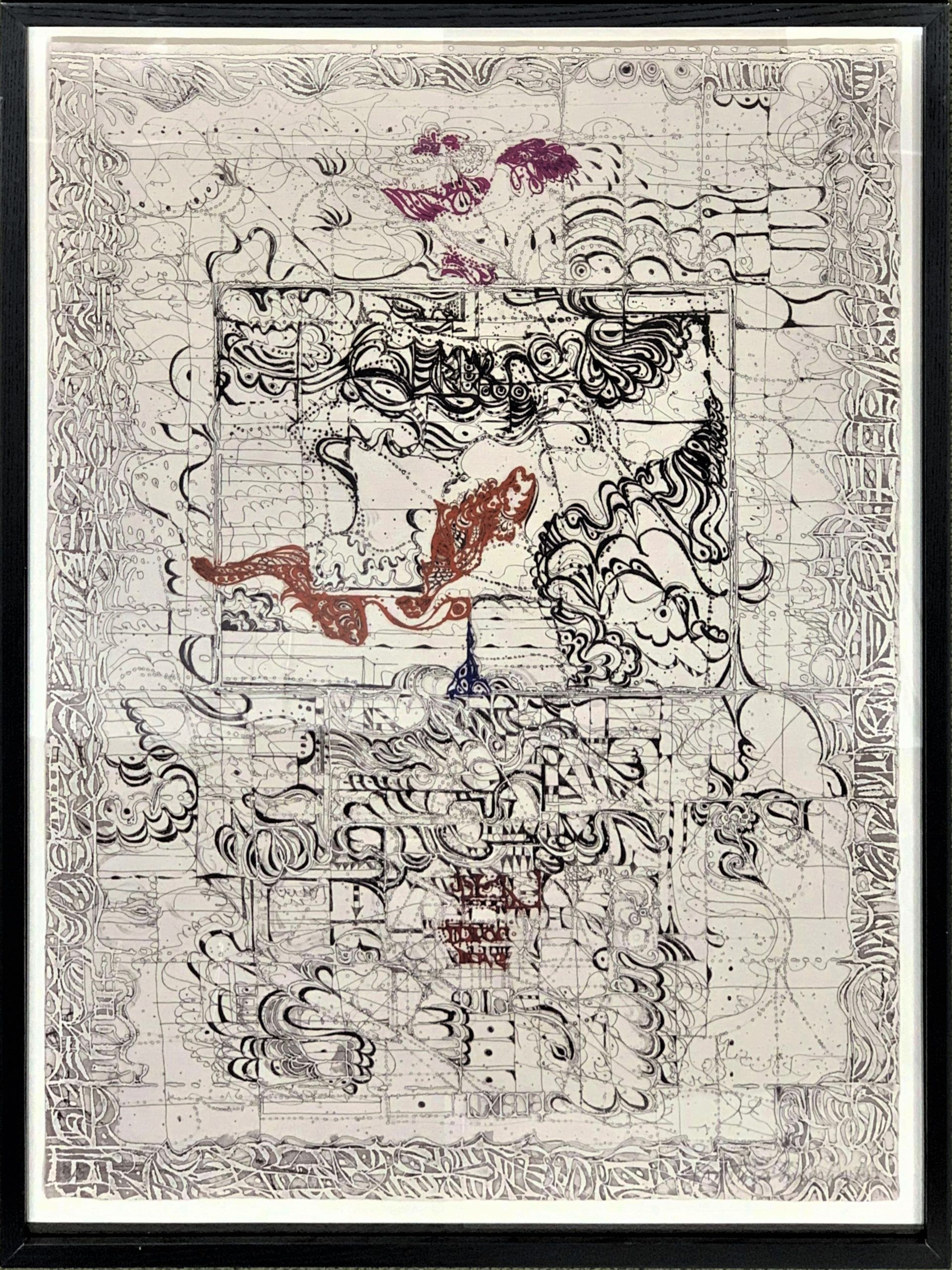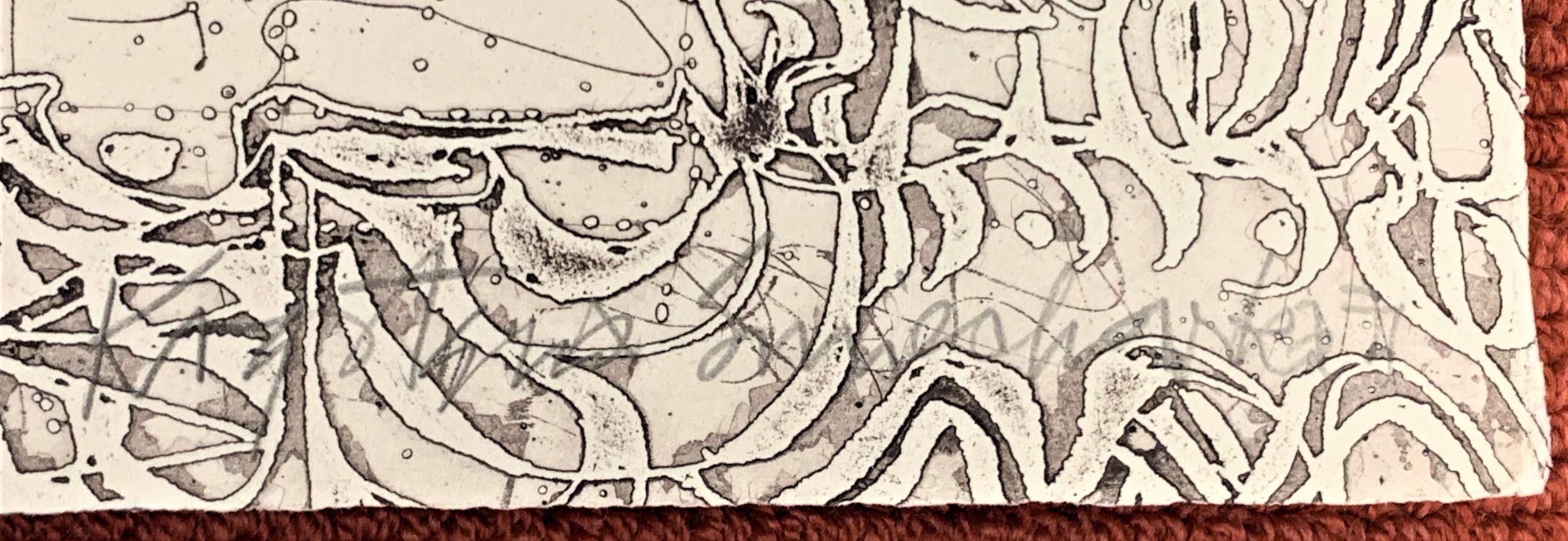 Polish-born printmaker Krystyna Smiechowska draws her inspiration from ancient maps and inscriptions and Slavic manuscripts from the High Middle Ages.  She constructs abstract works in which the ancient writings and runes are integrated into the drawing and confer an aura of mystery to the work.