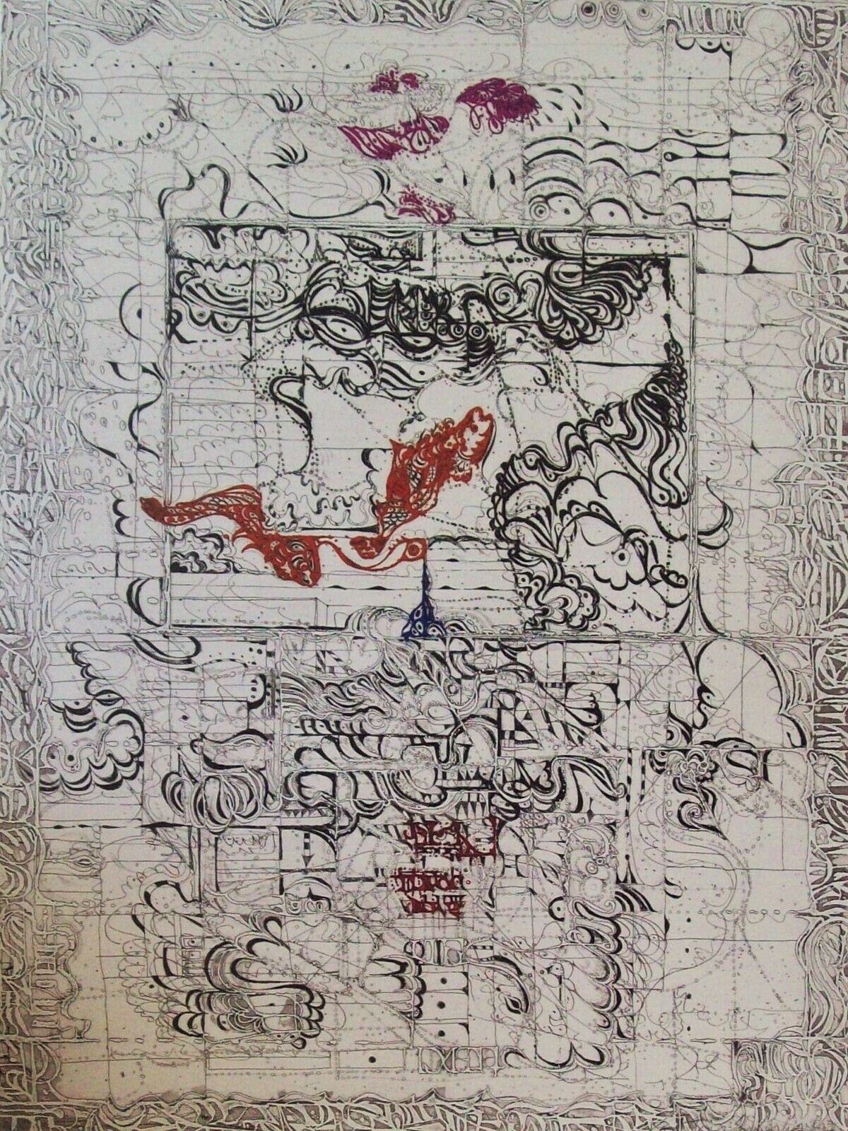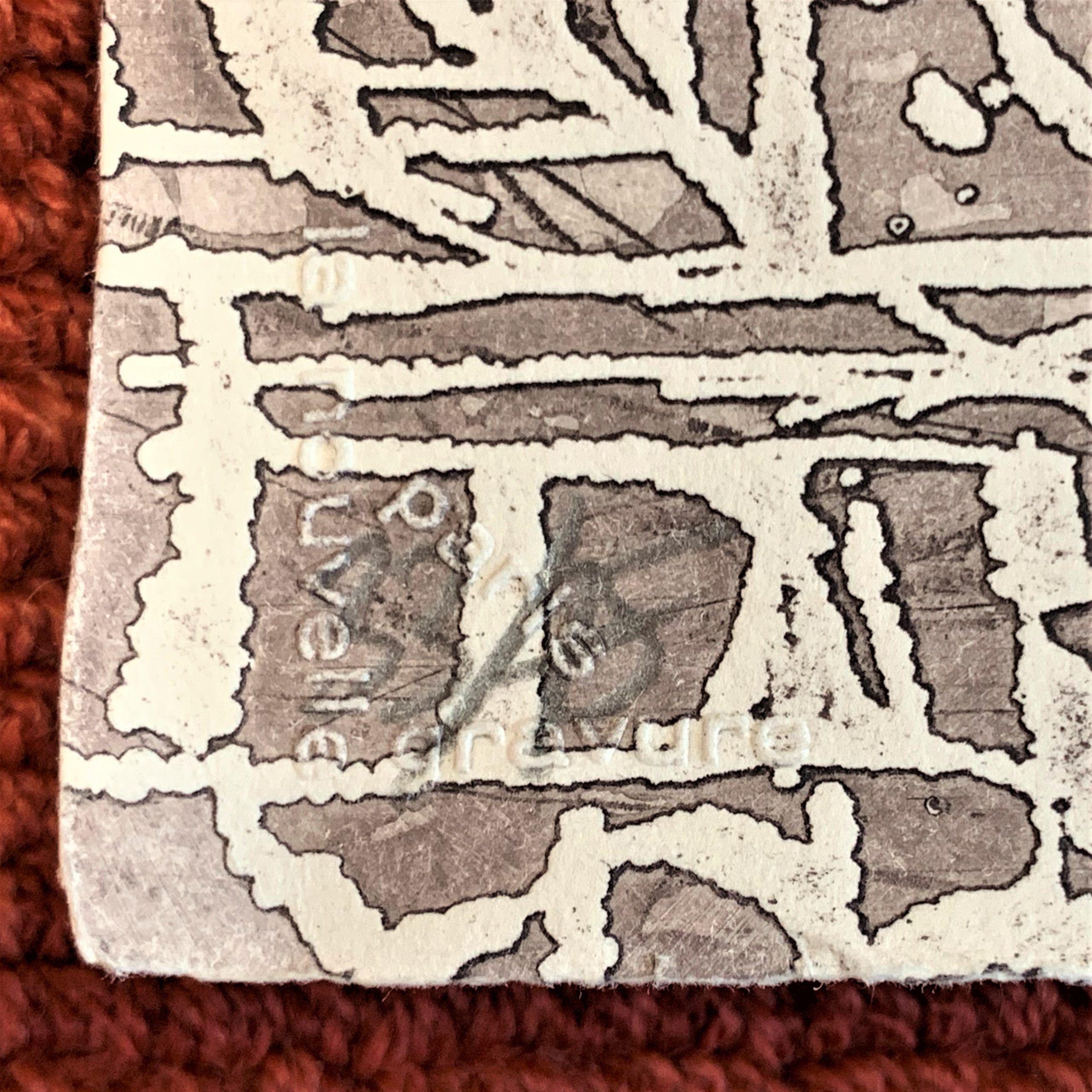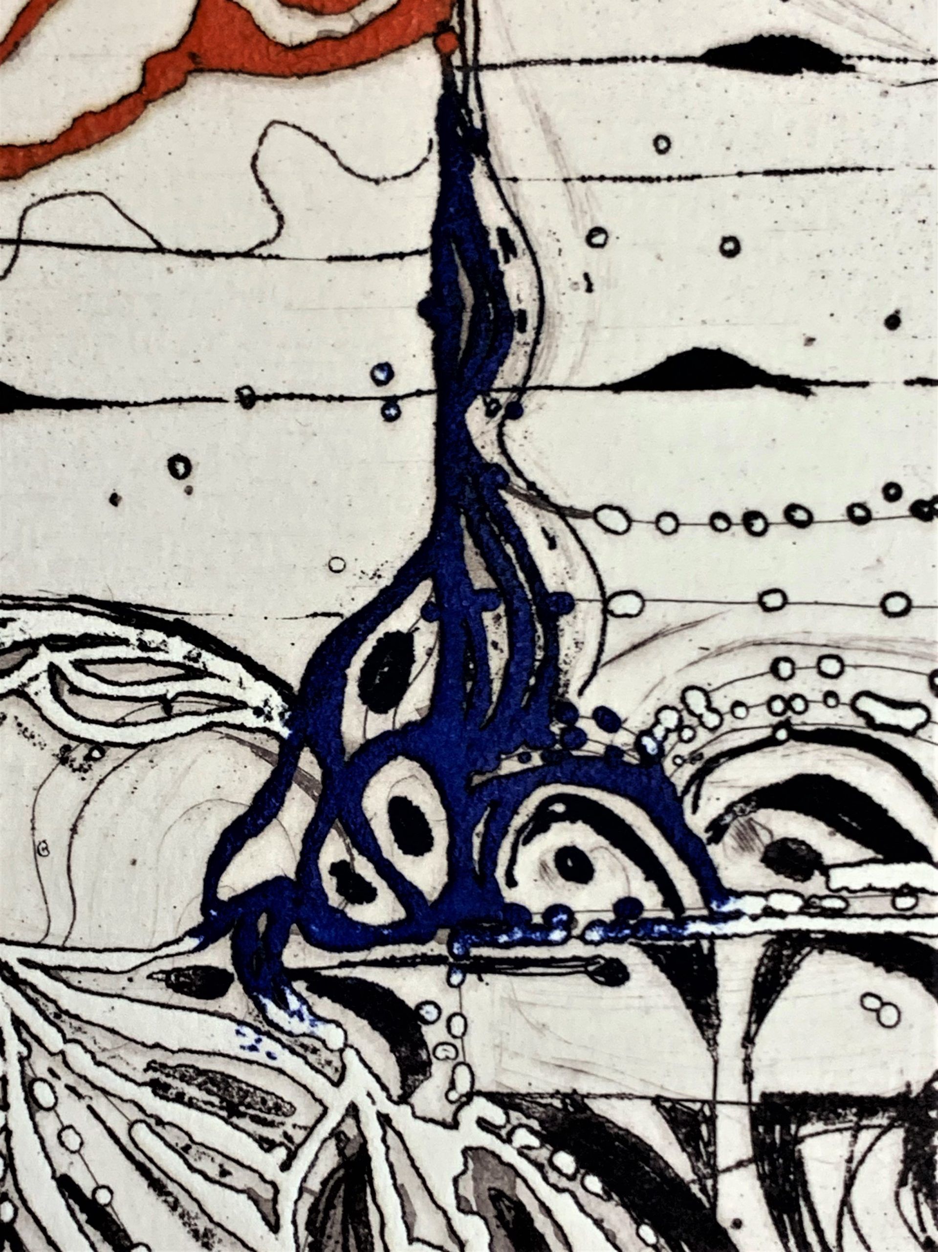 Smiechowska is a master engraver, but her works often combine several modes of expression, such as etching and aquatint, and are often made on previously embossed papers.  This work, for example, was embossed, then engraved and printed, and then hand-painted in red, blue, rust, and purple.